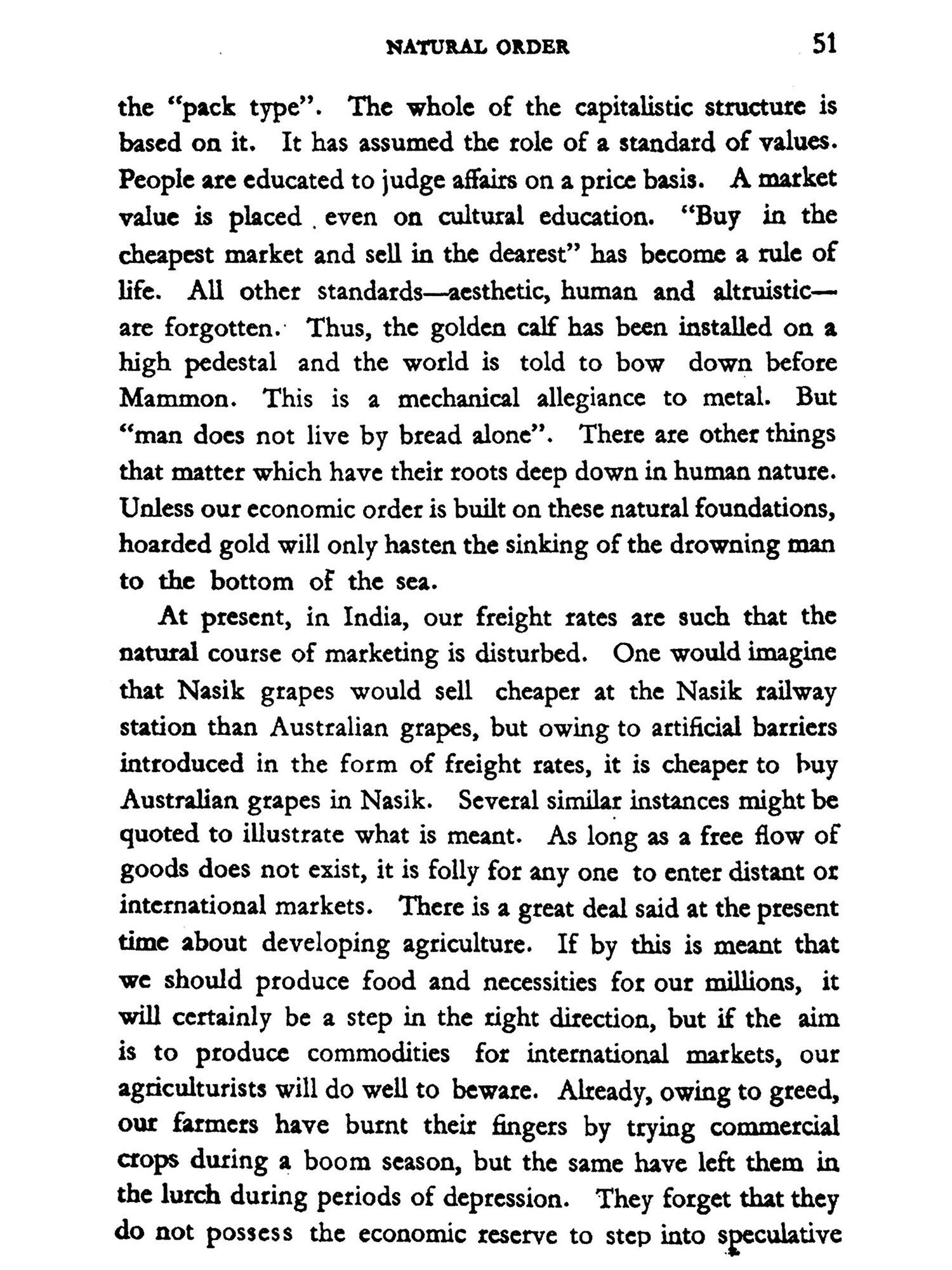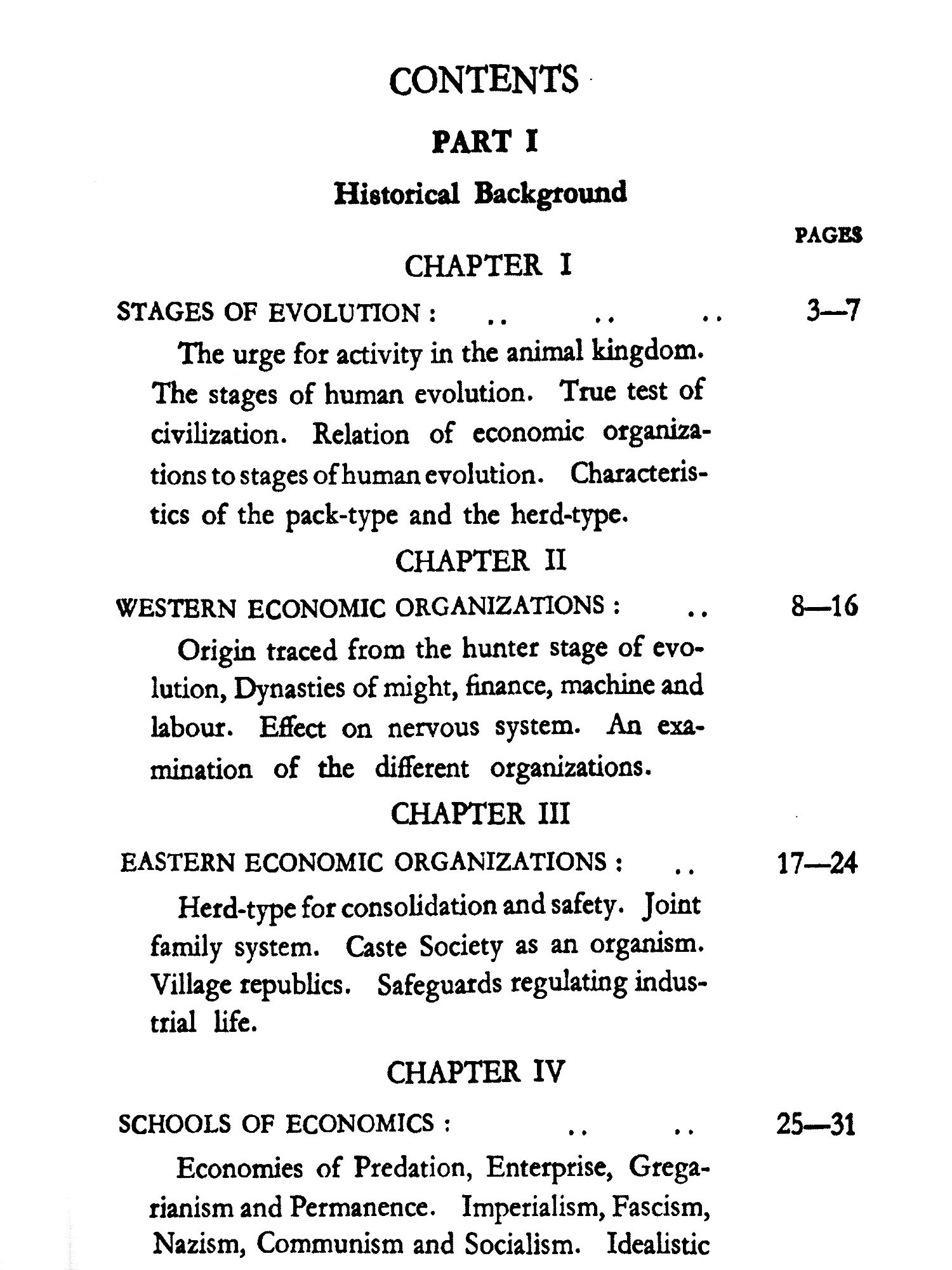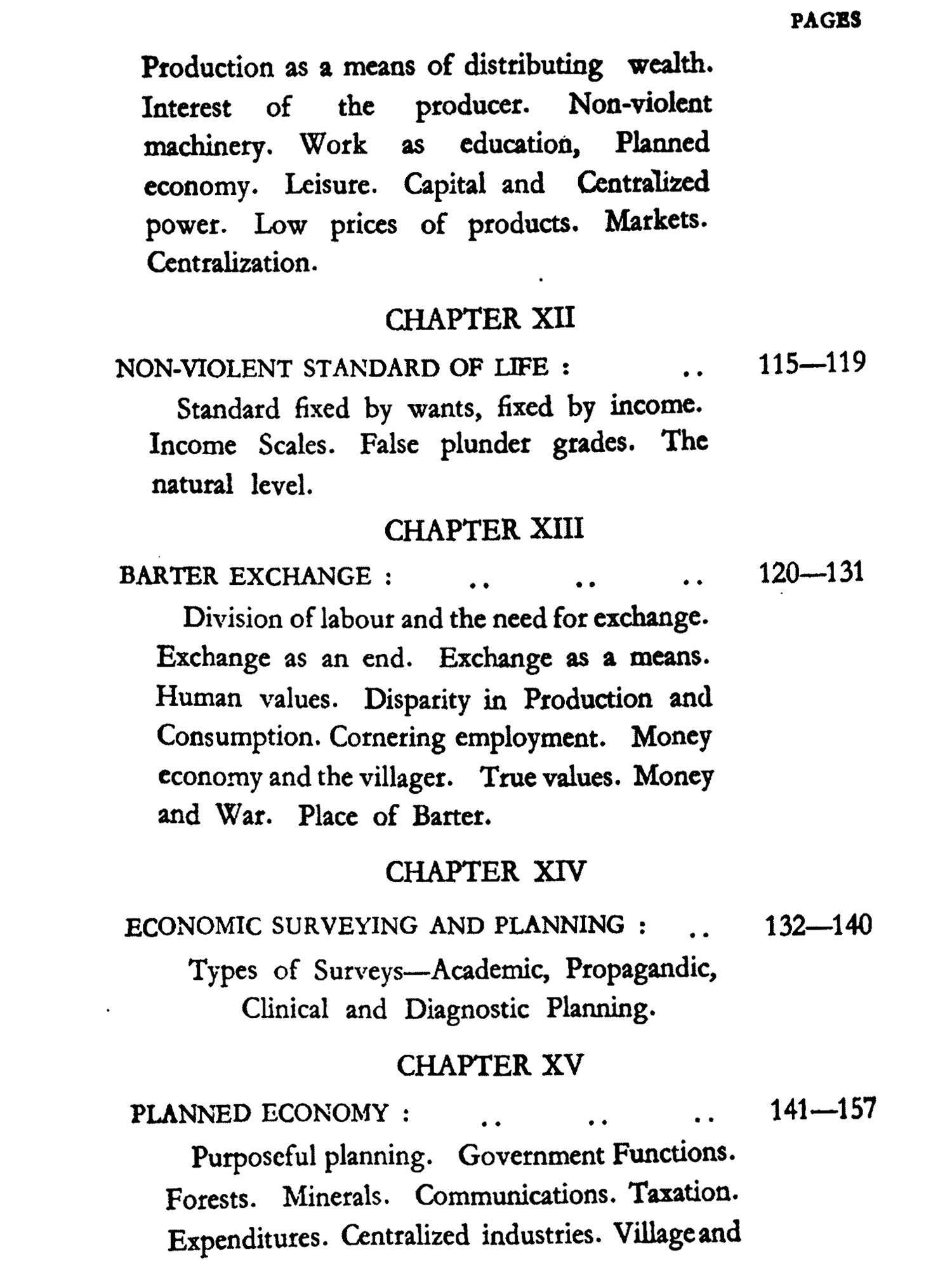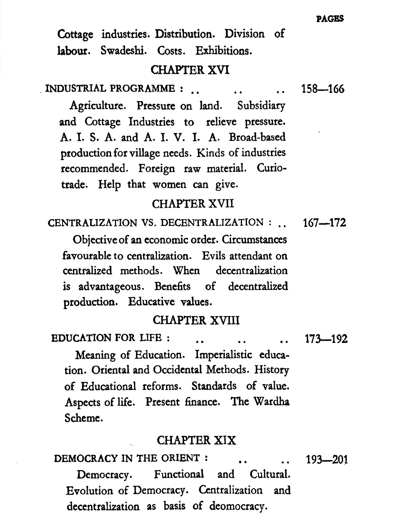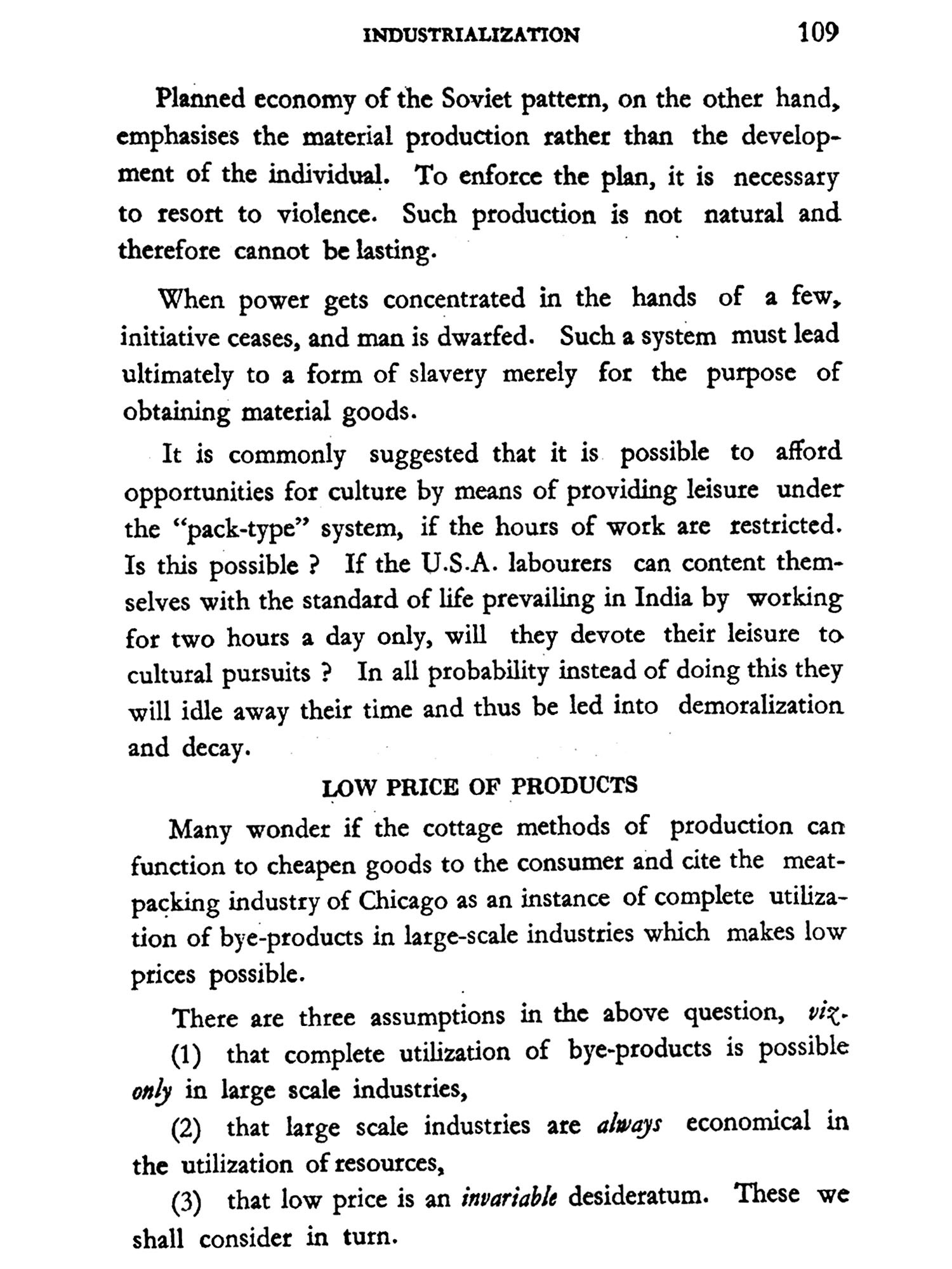 Amongst thinking people the world over there is a growing dissatisfaction as to the efficacy of capitalism as a cure for the poverty that faces us. Industrialization depends guarantee of a steady flow of raw materials and a ready market expends on the for manufactured goods. The system, therefore, requires as a pre-requisite a control of raw materials and markets which can only be obtained by violence. Soviet Communism, while seeking to remove the profit motive, has retained centralized production which entails concentration of power and, hence, calls for a greater sense of trusteeship to administer it for the benefit of the masses than is required under concentration of wealth. Ultimately, the difficulties of collection of raw materials and distribution of finished goods will have to be faced. Both capitalism and communism are based on a consideration of material values forgetting that such a myth as the "Economic Man" does not exist. The human factor and the effects of culture are ignored. In this booklet it is sought to examine the chances of basing an economic order on cultural values and human needs which formed the foundation of the old Oriental Civilization, Man is a complex being. We cannot nurture him to his full stature under a system which carries division of labour to the extreme. His religion, philosophy, politics, social and economic activities, and his family relations have all to be rolled into one before a cultural person can evolve. We cannot segregate various aspects of his life in different compartments and attempt to develop them in distinct stages. The practical side of the theme of this booklet can be seen in the programme of work of the All India Spinners' Association and the All India Village Industries Association. If this booklet clarifies to some extent the ideals of these Associations it will justify its existence.