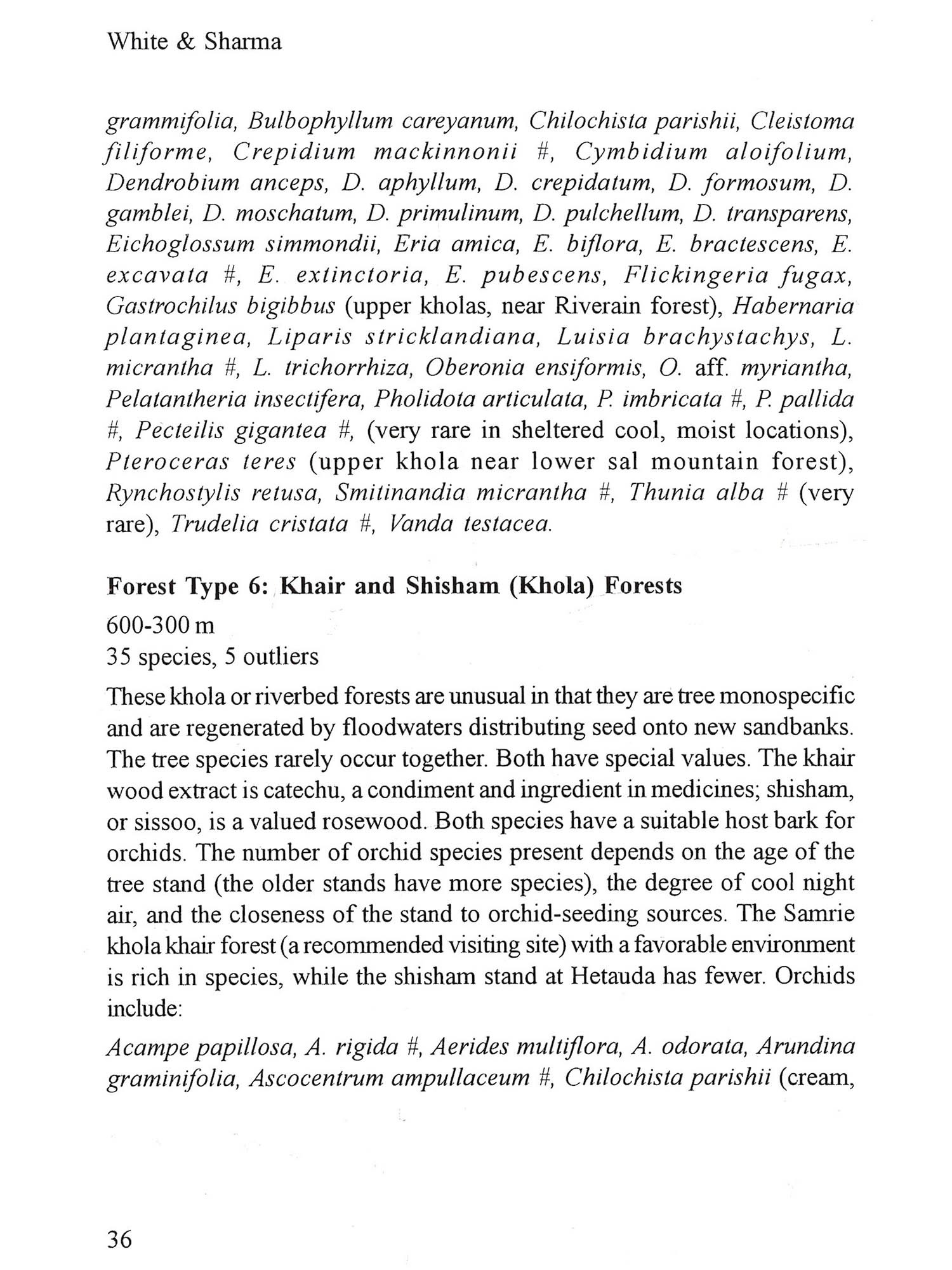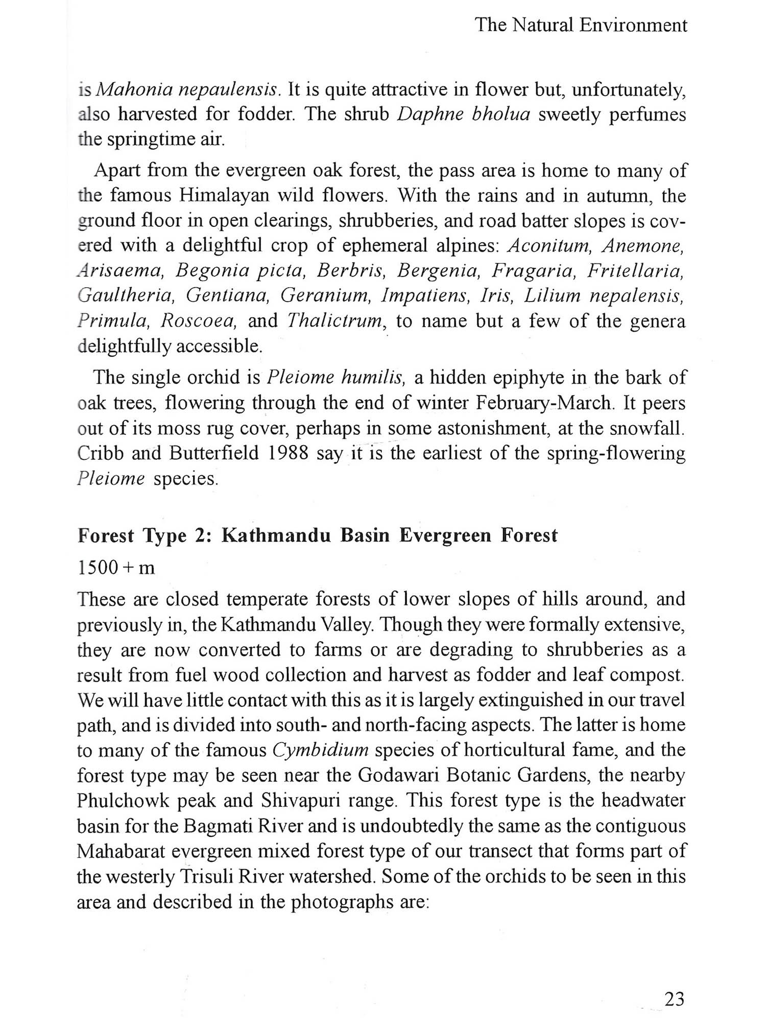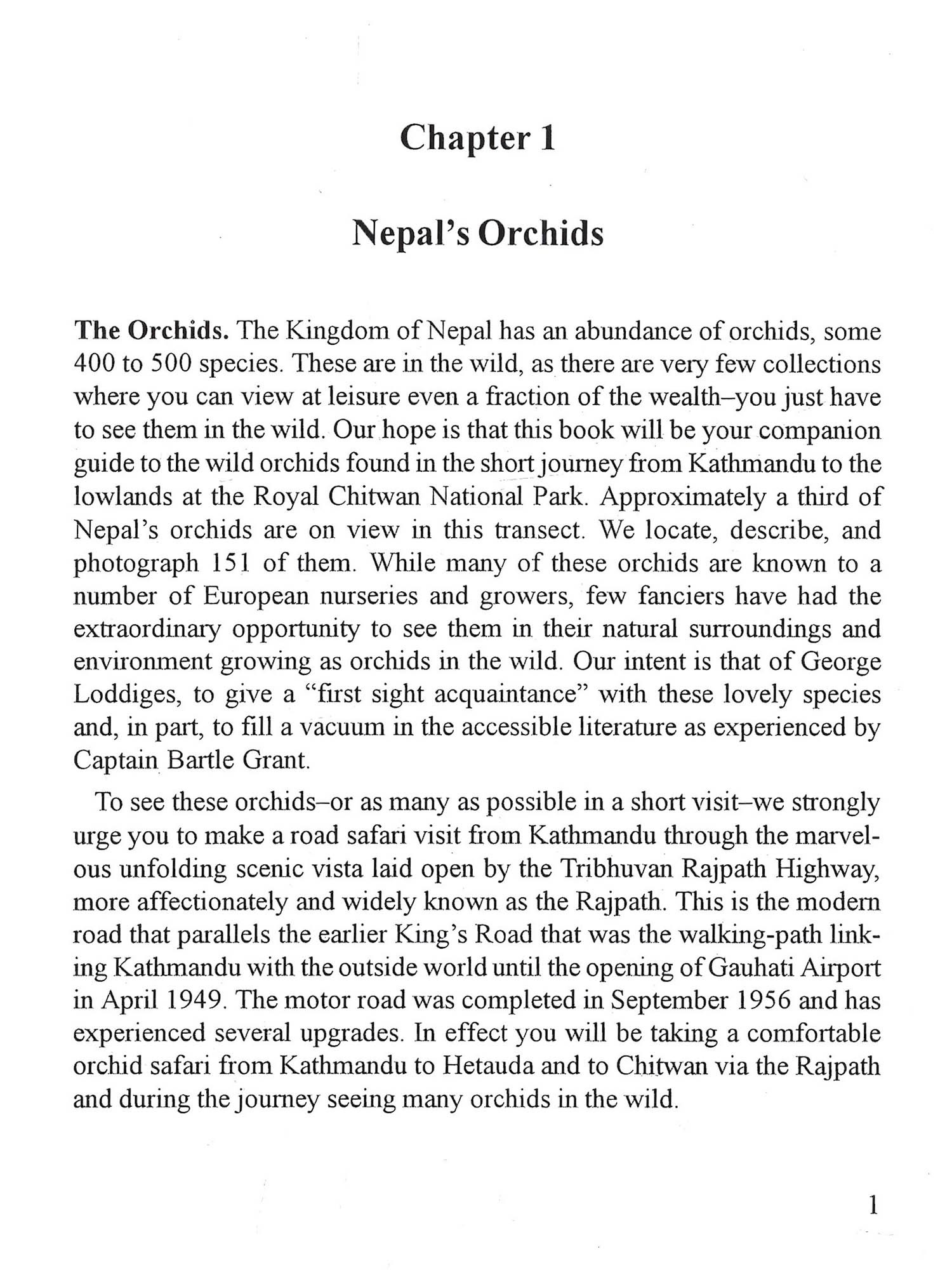 Wild Orchids in Nepal is written by amateurs having a basic local knowledge of, and a deep love for, the diversity of wild orchid species surrounding our enchanting part of the world. You could say we are biased, and we would agree. We love these beauteous (how else to describe them?) species in the wild. We hope we can share this with you. We are blessed in having access, very close at hand, to ranges of temperate and subtropical plants in a short transect of the Himalaya. This compressed terrain provides many altitudinal and forest habitats. In these niches, an astonishing variety of orchids from both the eastern and western world floras find a home. Wonderfully, this flora mix is accessible by a 137-kilometer road, a truly historic road no less. The scenery is magnificent, and the way is serviced with very acceptable levels of accommodation and cuisine. We are sure you will have no trouble in undertaking an informative and enjoyable orchid safari in this transect. Wild Orchids in Nepal is intended to be a compan-ion guide to the orchids of the Rajpath. We have tried to construct the guide from our twenty years of experience so that you will be able to travel independently in this wonderland and identify its orchids. Our intent is the same as that of Conrad Loddiges when publicizing his Botanical Cabinet in 1818. He wished to leave readers with "a first sight acquaintance" of New World plants and "some account of their peculiar qualities." This is our hope also for some of the wild orchids of Nepal. Does the book cover all of Nepal's orchids? Woefully not. We take you through just a small transect of 30 kilometers width of the 800 odd kilome-ters of the length of Nepal and just over 30 air kilometers from Kathmandu to Hetauda. However, we also include the orchids of the Royal Chitwan National Park slightly to the west. These are Himalayan orchids, all ex-tending beyond Nepal. We describe and photograph 151 species and men-tion a few more. We are indeed proud that evethis small transect we add sixteen new records to the orchid species efteration in Nepal. It is of interest to know that many type specimens collections that were used to give plants their identity were actually collected in this very vicinity It's not often that you have the chance to follow in the footsteps of early orchidologists, but this is such a chance. A very early visitor was Francis Buchanan (Buch.-Ham.), later Sir Francis, Hamilton who spent the year 1802-03 in Nepal researching natural resources and collecting orchids. This was an adventurous period, indeed. Nepal was, by political design, an iso-lated country until after the Anglo-Nepal war of 1814-16. Shortly after that conflict, Nathaniel Wallich, Superintendent of the Calcutta Botanic Garden (1815-41) made his collecting visit to Nepal in 1820-22. John Lindizy when describing many species employed his herbarium specimens and calogue names extensively. It gives a very warm sense of history to be able walk in their footsteps and to see the descendents of these species still at tome in their native settings, some 200 years later. Did we do this alone? Of course not, and our grateful thanks go to our various staff members, often on secondment additional to their normal du-hes as cooks, drivers, forest technicians who were pressed into orchid service. They were always willingly so, and while keenly soaking up our information, also contributed both to the collections and to our knowledge of local lore. These people are far too many to mention individually, but their collective assistance is greatly appreciated. We thank you all from our hearts. Our thanks also go to those who kindly assisted us by supplying photographs. This magic orchid visit can be incorporated into a wider travel context. You can combine an orchid tour with opportunity extensions, and enjoy historic and religious marvels of the ancient kingdom city of Kathmandu. Or you might like to join one of the conducted tours of unforgettable scen-ery and alpine flowers, or you might wish to take in the delights of highland trekking or to experience the very diverse animal and bird fauna of the Royal Chitwan National Park, all so close at hand. A wealth of pleasures certainly awaits you.