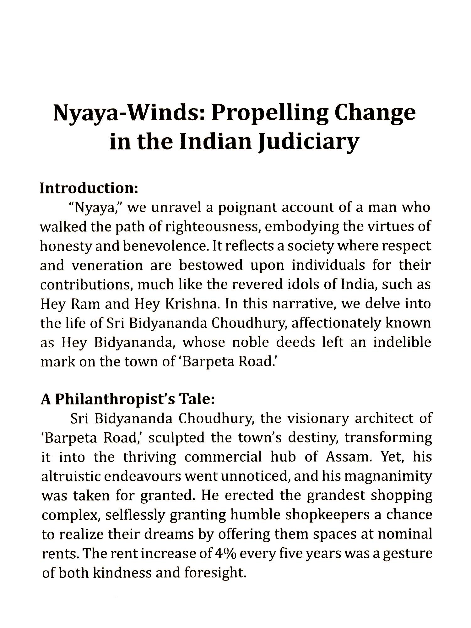 "Nyaya-yaya-Winds: Propelling Change in the Indian Judiciary" delves into crucial legal and societal issues. Chapter I focuses on corporate law amendments for reduced litigation and heightened compliance. Chapter II explores the balance between experience and renewal in retirement age. Chapter III tackles juvenile crimes, emphasizing mental health in rehabilitation. Chapter IV navigates the controversy of legalizing sex work. Chapter V champions integrity in the fight against corruption. Chapter VI advocates for political change with qualifications and accountability. Chapter VII revisits the term "Deshdrohi" in the context of democracy. Chapter VIII scrutinizes the delicate balance between VIP privileges and public welfare. Chapter IX introduces legal insurance for societal empowerment. Chapter X challenges reservation paradigms for equity and meritocracy. Chapter XI strikes a balance between human rights, animal welfare, and public safety. Chapter XII strengthens governance through whistleblower initiatives. Chapter XIII addresses the overwhelmed judiciary and delayed justice. Chapter XIV unveils the shadows of governance and power dynamics. Chapter XV concludes by emphasizing mandatory provisions under the Companies Act. Each chapter provides deep analysis and recommendations for India's governance challenges.