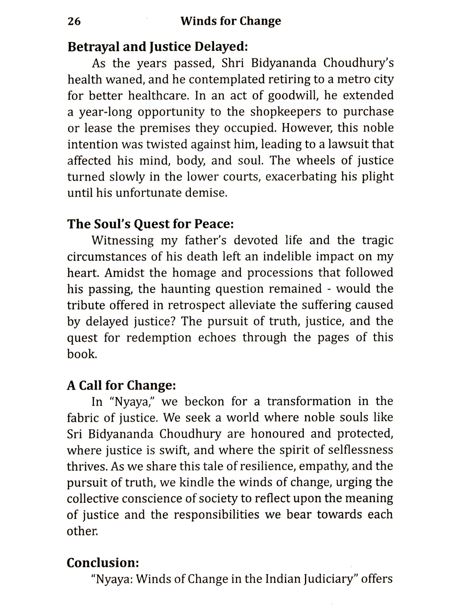 It is with immense pleasure and gratitude that I present "Nyaya-Winds: Propelling Change in the Indian Judiciary." This book represents resents the culmination of years of research, dedication, and collaboration, and I am deeply grateful to all those who have played a significant role in bringing this project to fruition. First and foremost, I extend my heartfelt thanks to my friend and mentor, Pradeep Baba Madhok, whose unwavering support and guidance have been instrumental in shaping my thoughts and ideas. Your wisdom and encouragement have been a constant source of inspiration throughout this journey. Arijit, my consort your role as a critic and a pillar of support has been invaluable in shaping my endeavours, both personal and professional. My dear daughter, Rudrani, your resilience, and maturity are a constant inspiration. Watching you grow and navigate life with grace and determination fills my heart with pride. I am thankful to my team, Abhishek & Deepika, for their valuable support in bringing this book to life. In "Nyaya-Winds," my aim is to shed light on the pressing issues and opportunities within the Indian judiciary.