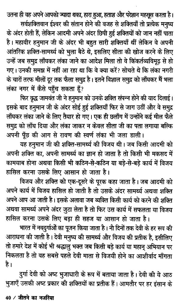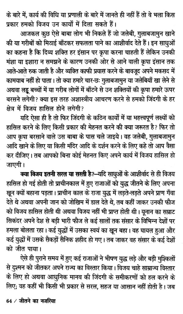 जीत का नजरिया दुरुस्त करने का अर्थ, कर्म करने के नजरिए को दुरुस्त करना होता है। अगर कर्म करने का नजरिया दुरुस्त हो गया अथवा हम चुस्ती-फुर्ती से अपने कार्यों को अंजाम देने में तत्पर रहने लगे तो जीत या विजय हमसे कभी भी दूर नहीं रह पाएगी।