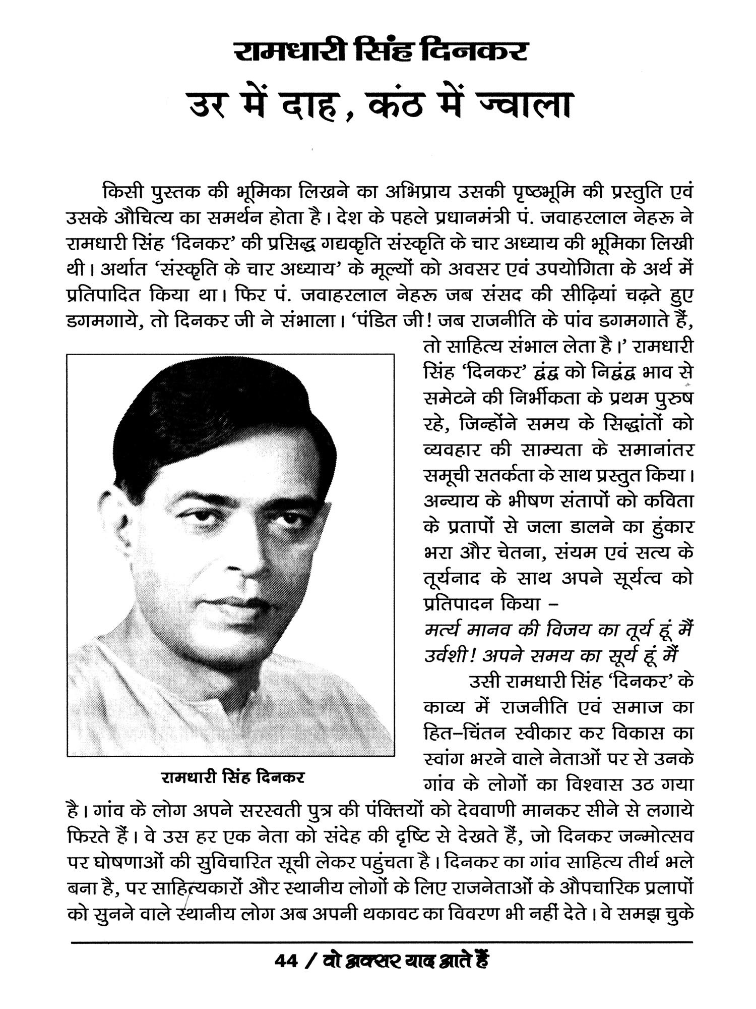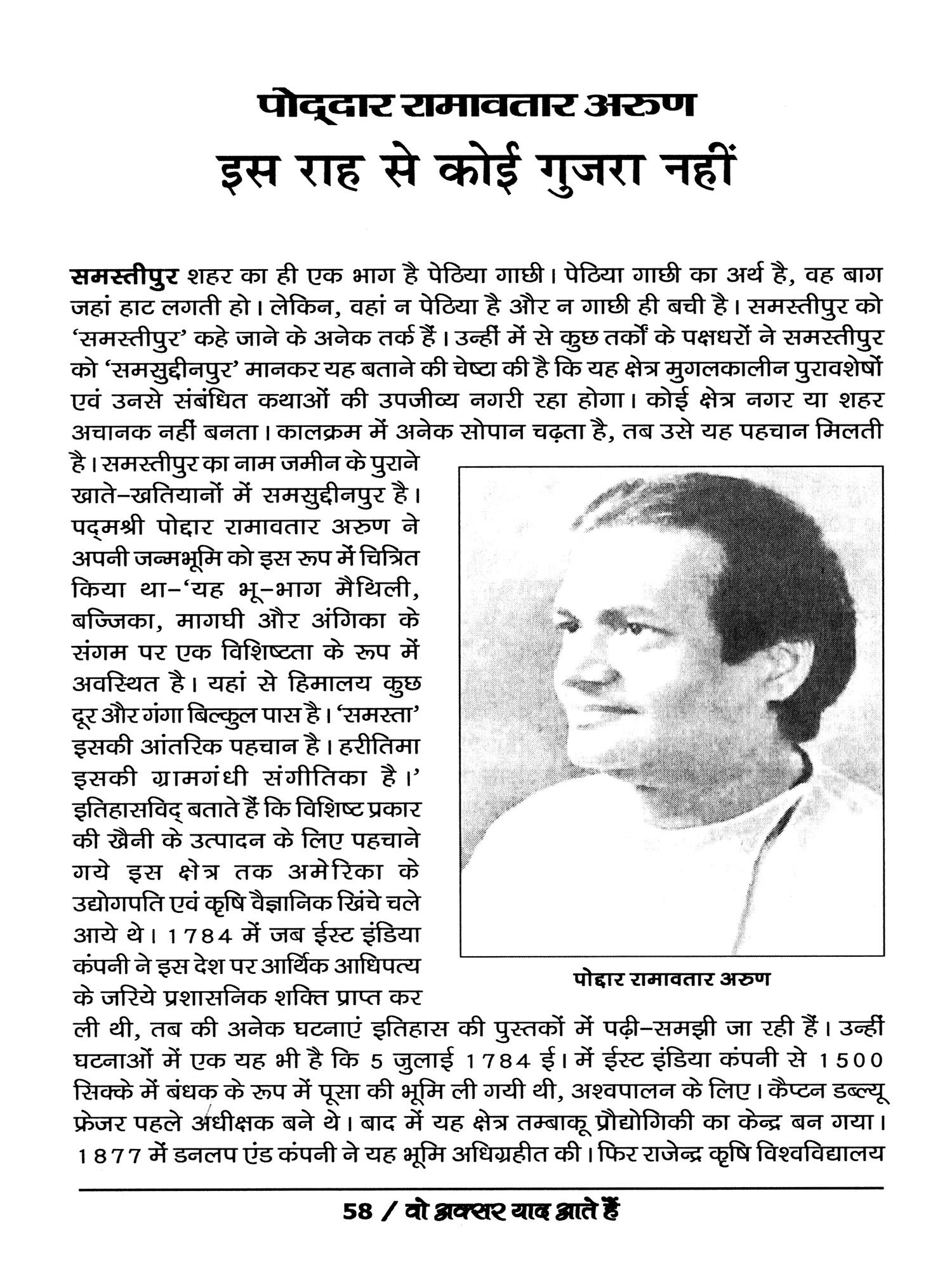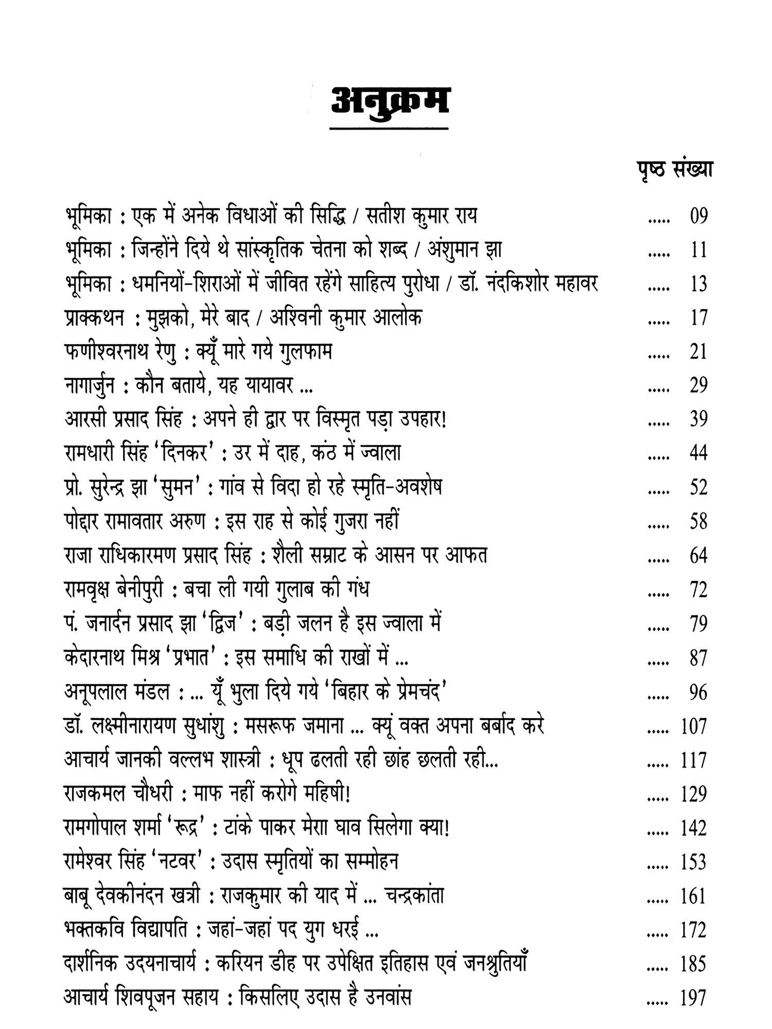 ये सारे युग और रचना पुरुष दिवंगत हो चुके हैं और अपनी स्मृतियों और कृतियों में ही जीवंत हैं। इन सबका संबंध उत्तर बिहार से है। लेखक ने वर्तमान के माध्यम से अतीत की यात्रा की है। इस यात्रा का लक्ष्य है अपने पूर्वजों की देन को व्यापक समाज में अग्रेषित करना। निस्संदेह परंपरा से पाथेय लेकर आगे बढ़ने के लिए प्रेरित करने का यह प्रयत्न अत्यंत महत्त्वपूर्ण है और ऐतिहासिक भी। दिनकर ने लिखा है "जब भी अतीत में जाता हूँ, मुर्दों को नहीं जिलाता हूँ, पीछे हटकर फेंकता वाण, जिससे कंपित हो वर्तमान।
