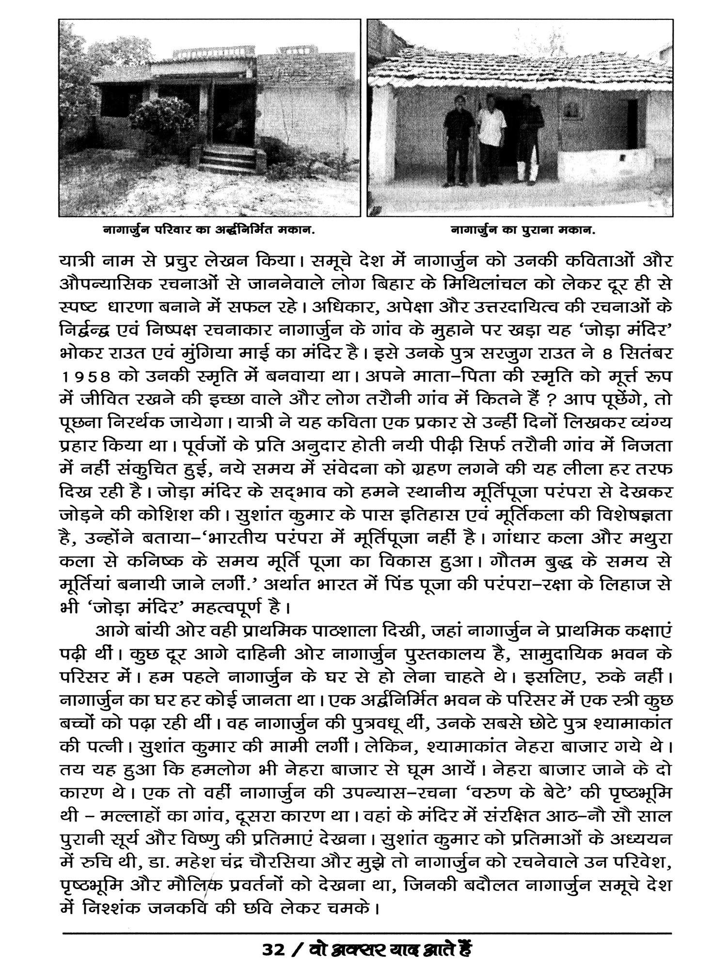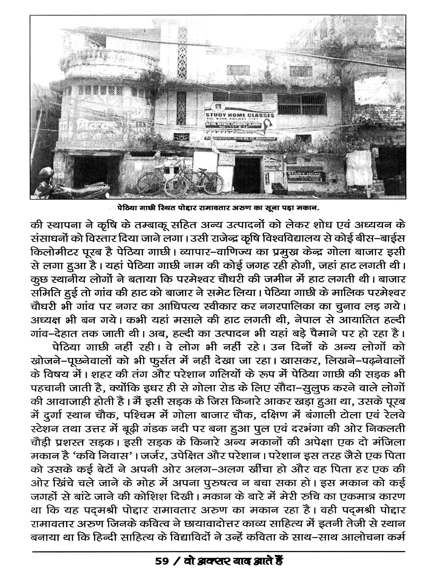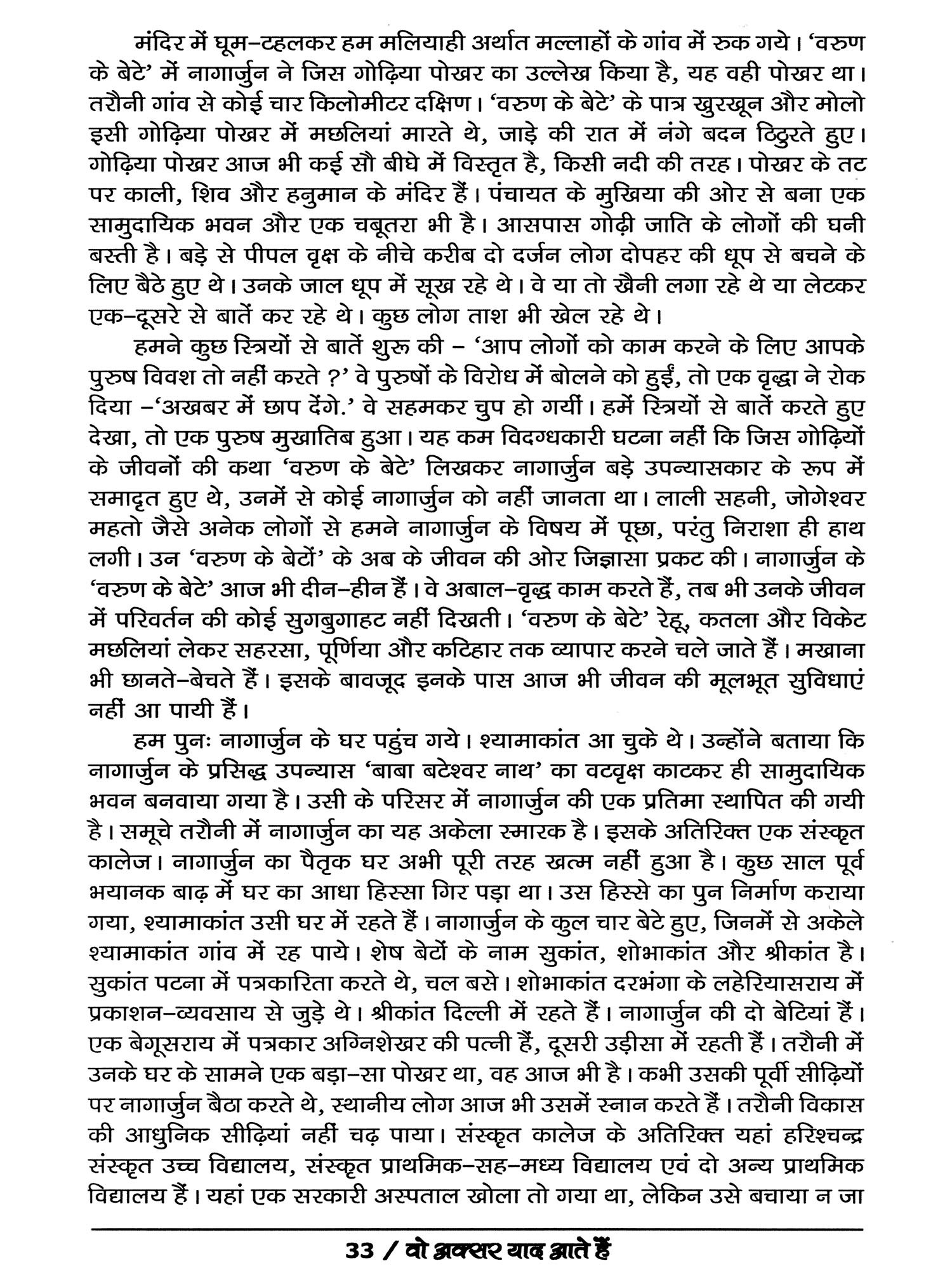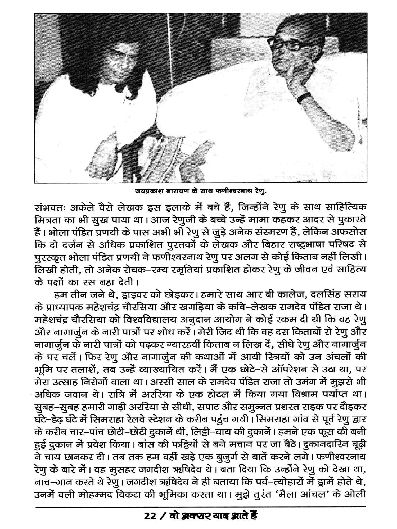 इस कृति में हिन्दी साहित्य, विशेषतः कथा-साहित्य में आंचलिकता को प्रतिष्ठित करनेवाले फणीश्वरनाथ रेणु पर ललित लेख है। इस लेख में लेखक ने रेणु के साहित्य में वर्णित अंचल की सृजन यात्रा की है, उनके चरित्रों का सीधा साक्षात्कार किया है। यात्रा और साक्षात्कार, खोज और मूल्यांकन ये सारी प्रवृत्तियों इस लेख में स्पष्ट दिखाई देती हैं। मिथिलांचल के ही अमर रचनाकार नागार्जुन के जन्म स्थल की यात्रा और वहाँ की मिट्टी और संस्कृति का उनके रचनाकर्म पर पड़नेवाले प्रभाव की पड़ताल में बौद्धिक आतंक नहीं, एक भाव की रचना-दृष्टि है। नागार्जुन लोकयात्री हैं, शास्त्र को अपनी लोकदृष्टि से अनुमोदित करनेवाले रचनासिद्ध आचार्य। शास्त्र को लोक में पचा लेनेवाले इस जनकवि की शक्ति को, रचनात्मकता के विविध आयामों को लेखक ने अपने यात्रा-लेख में पूर्णतः स्पष्ट कर दिया है। इस यात्रा लेखक संग्रह में आरसी प्रसाद सिंह, रामधारी सिंह 'दिनकर', प्रोफेसर सुरेन्द्र झा 'सुमन', रामवृक्ष बेनीपुरी, पंडित जनार्दन प्रसाद झा द्विज, केदारनाथ मिश्र प्रभात, अनूपलाल मंडल, डॉ. लक्ष्मीनारायण 'सुधांशु, आचार्य जानकी वल्लभ शास्त्री, राजकमल चौधरी, रामगोपाल शर्मा 'रुद्र', रामेश्वर सिंह नटवर, बाबू देवकीनंदन खत्री, आचार्य शिवपूजन सहाय और उदयनाचार्य हैं। उनका जनपद है, उनका रचनात्मक परिदृश्य है और उनका प्रेरक परिवेश भी। लेखक ने स्वयं रचनाकारों के गाँव और जनपद की यात्रा की है, उनके परिजनों से बातचीत करते हुए मार्मिक प्रसंगों की खोज की है। उनके संबंध में प्रचलित धारणाओं का सतर्क परीक्षण किया है, नये तथ्यों का प्रामाणिक अन्वेषण किया है।
