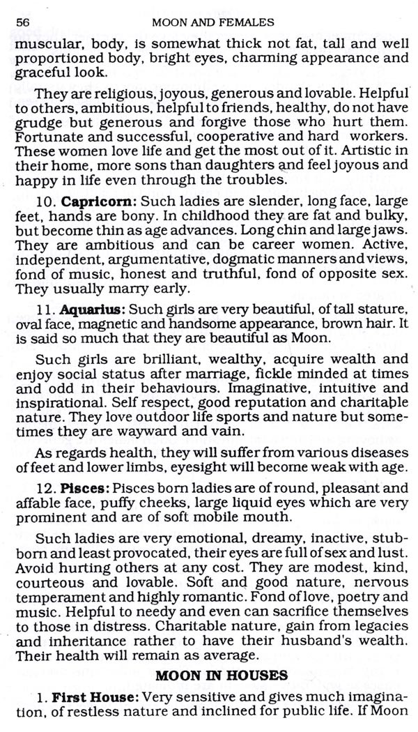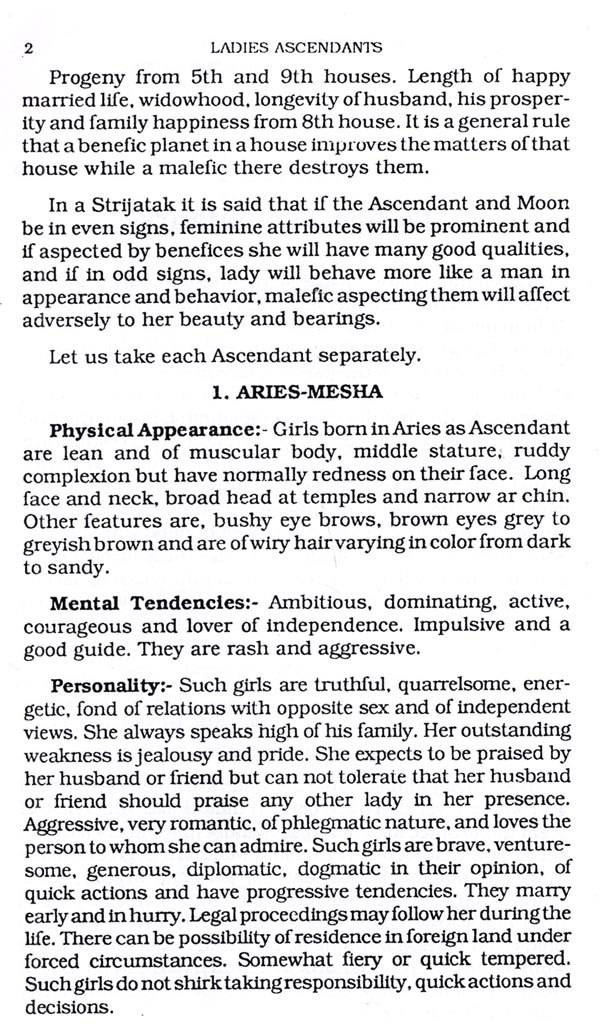 Ladies Basic Nature, Education, Profession, Husband and Lover, Marriage & Married Life. Children, Sex Nature And Sex Life Lover's Guide, In-Laws, Dowry And Fire Deaths and Mutual Attraction. All are Analysed As Per Hindu Astrology.