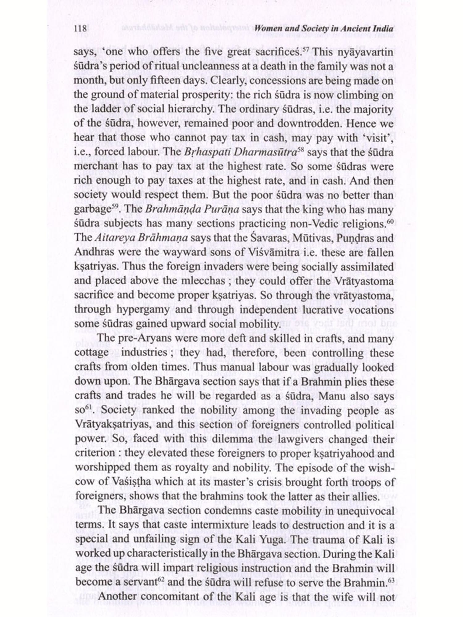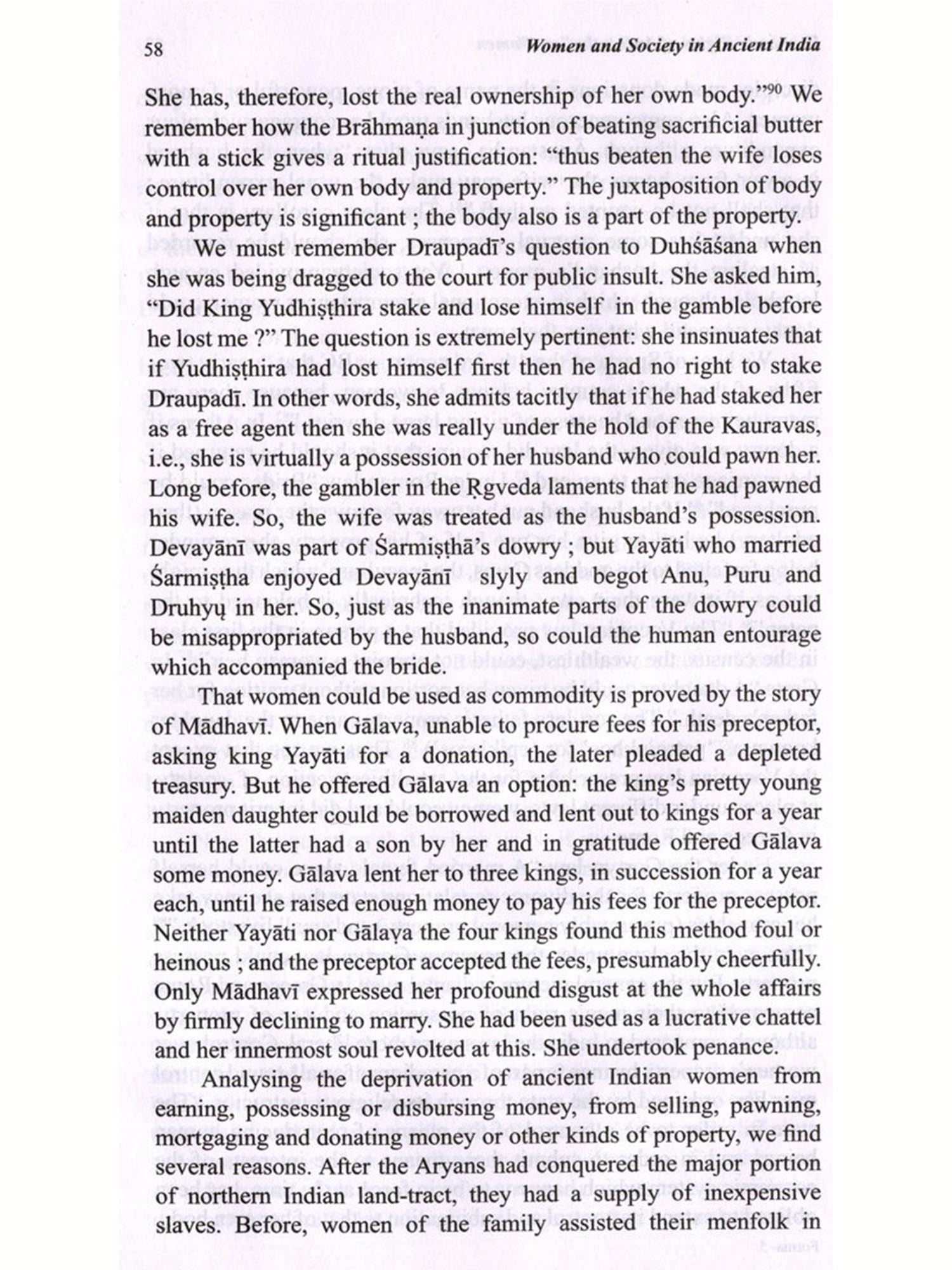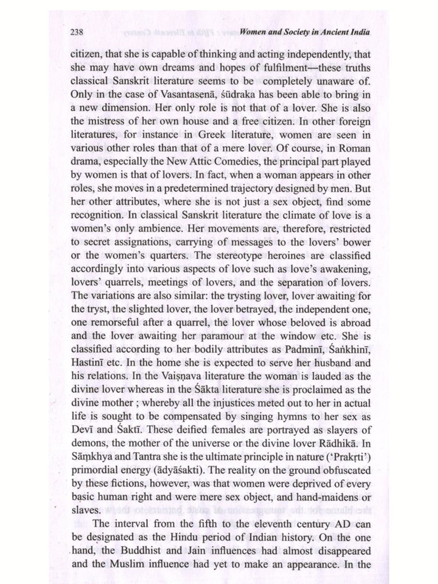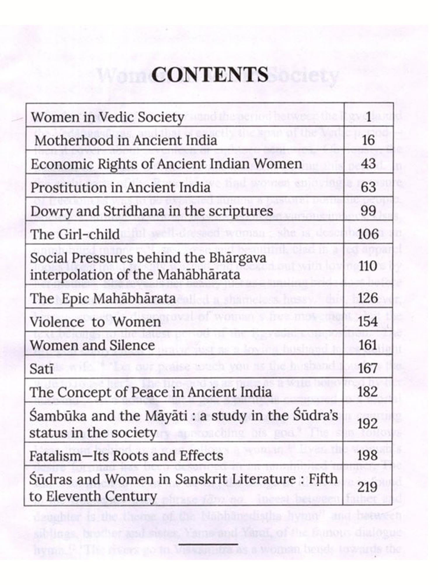 This is a collection of fifteen essays most of which were published at different times in different journals. Some were originally composed in English, which have been included with slight modifications. The articles on the Mahābhārata and on 'The Südra and Women' in early classical Sanskrit Literature were very kindly translated by my friend Sri Asit Ghosh. He himself offered to contribute this as a labour of love and I do not know how to thank him. The article on the Girl Child has been translated by my one-time pupil and then colleague at the Jadavpur University, Dr. Bijaya Goswami, I take this opportunity to thank her for the trouble she took. I myself translated those on 'Sati', 'Dowry and Stridhana' etc. The rest were originally in English, published in the Economic and Political Weekly, Journal of Indian Philosophy and some as monographs in various other periodicals and broadsheets. Obviously there is no one thread running through these articles making it a coherent monograph; the connecting link is the theme: women and society in ancient India. Each of the articles seeks to throw some light on some aspect of either ancient Indian women or some social attitude to caste, the concept of peace, or fatalism.