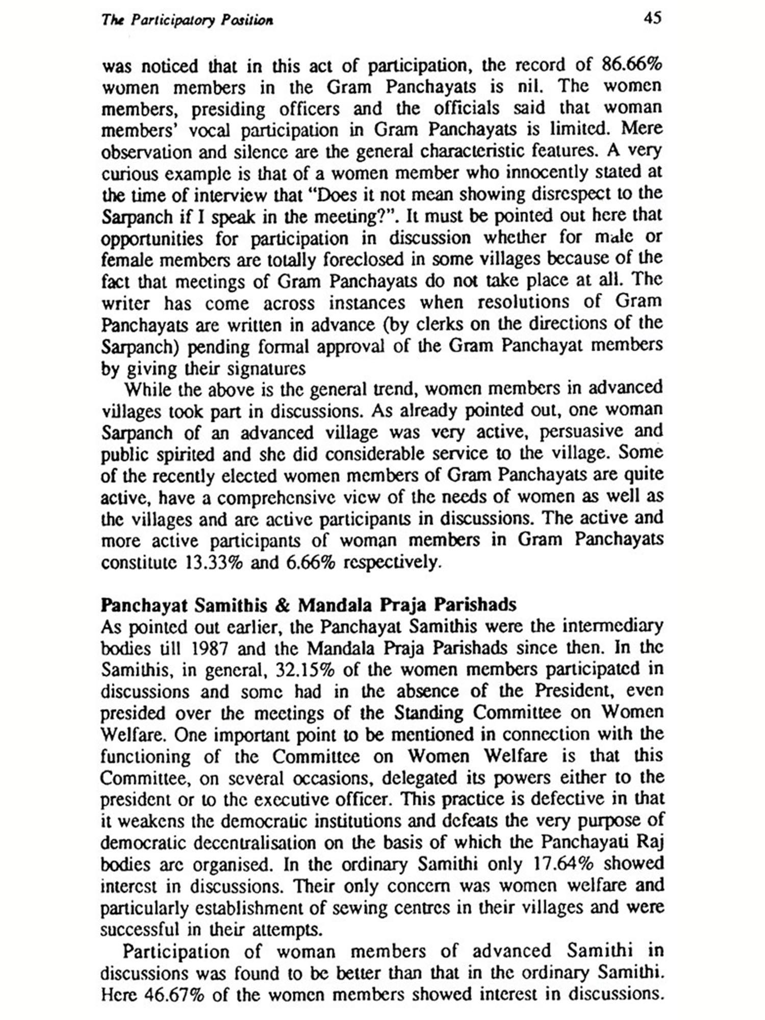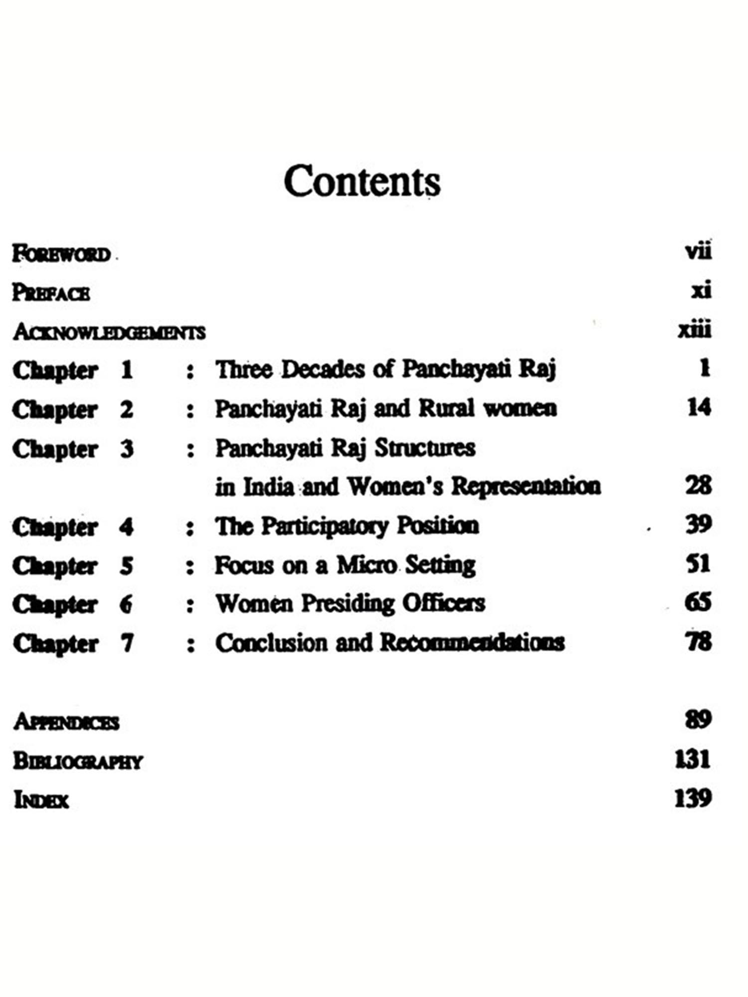 Panchayati Raj institutions have been virtually reduced to nullity except in a few states. The debate sparked off by the Constitution (sixty-fourth) Amendment Bill, 1989, has not so far touched the issue of expanding women's role in Panchayat bodies though the Bill includes a provision for increased reservation of seats for women. The book has thus come at a right time to generate some discussion on this issue.