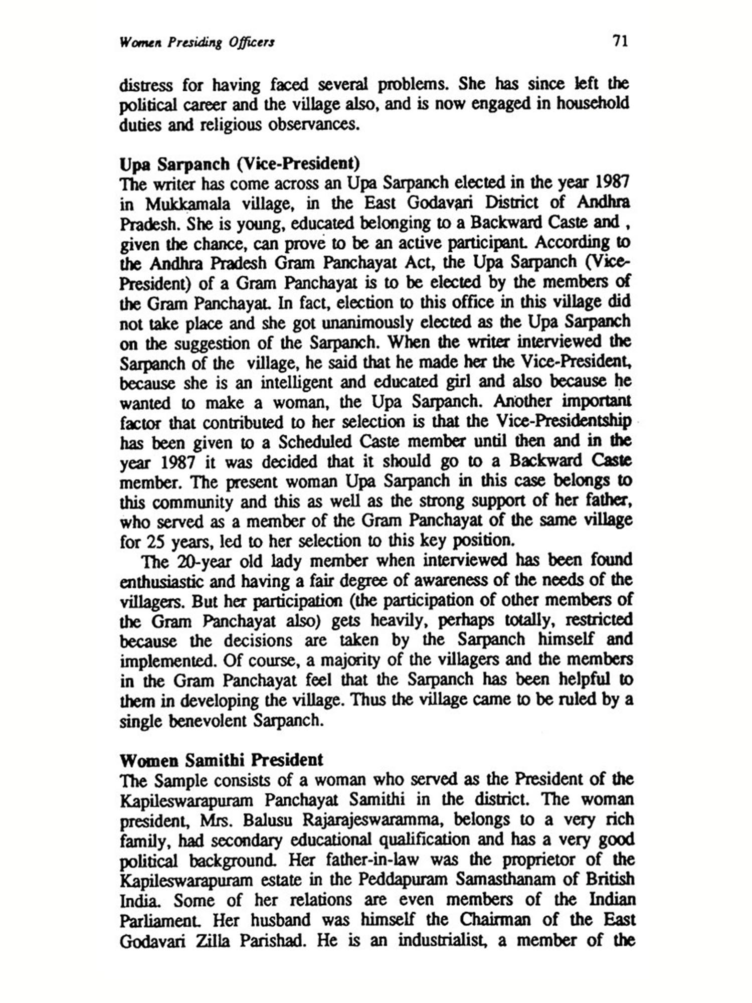 The contributing factors for active involvement and participation of women in the process of rural development have been identified. The study is also concerned with assessing the role of women presiding officers of the Panchayati Raj bodies. The structural, functional, attitudinal and environmental constraints for active involvement of rural women in the general social process and more importantly in the political process are discussed. The nature and extent of interaction of women of rural India, with the officials, the question of reservation of seats for women in the Panchayati Raj institutions, the type of functioning of women's organisations and the style of rural women's leadership are also discussed.