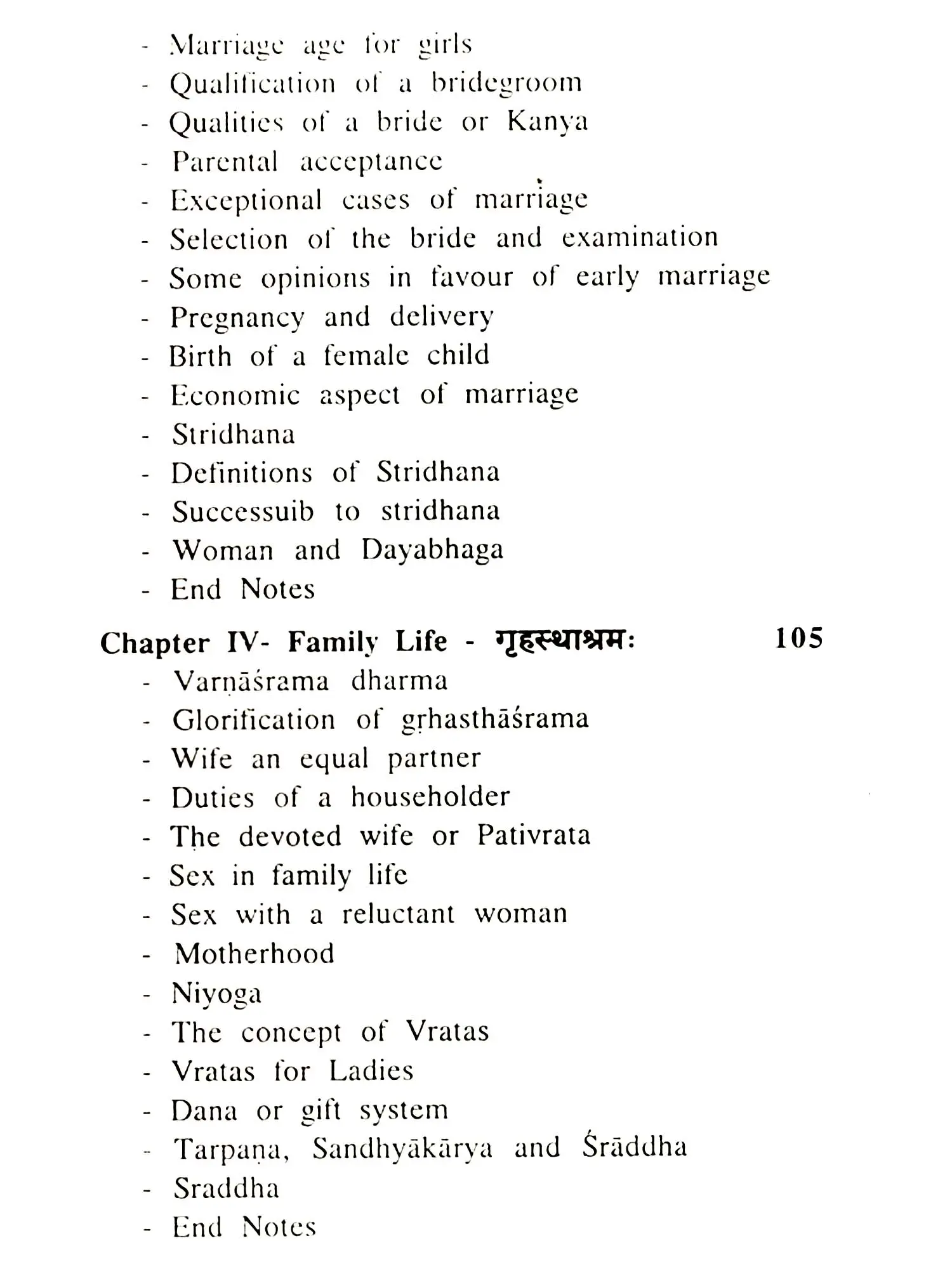 The inferences summed up at the end of the work, throw interseting light on the changing notions on the age and modes of marriage of women, perception of the princible of pativrata, notions attached to the birth of a daughter in the family: reasons for tonsuring the heads of the widows, circumstances that precluded purda practice, emergence of the institution of prostitutes, etc.