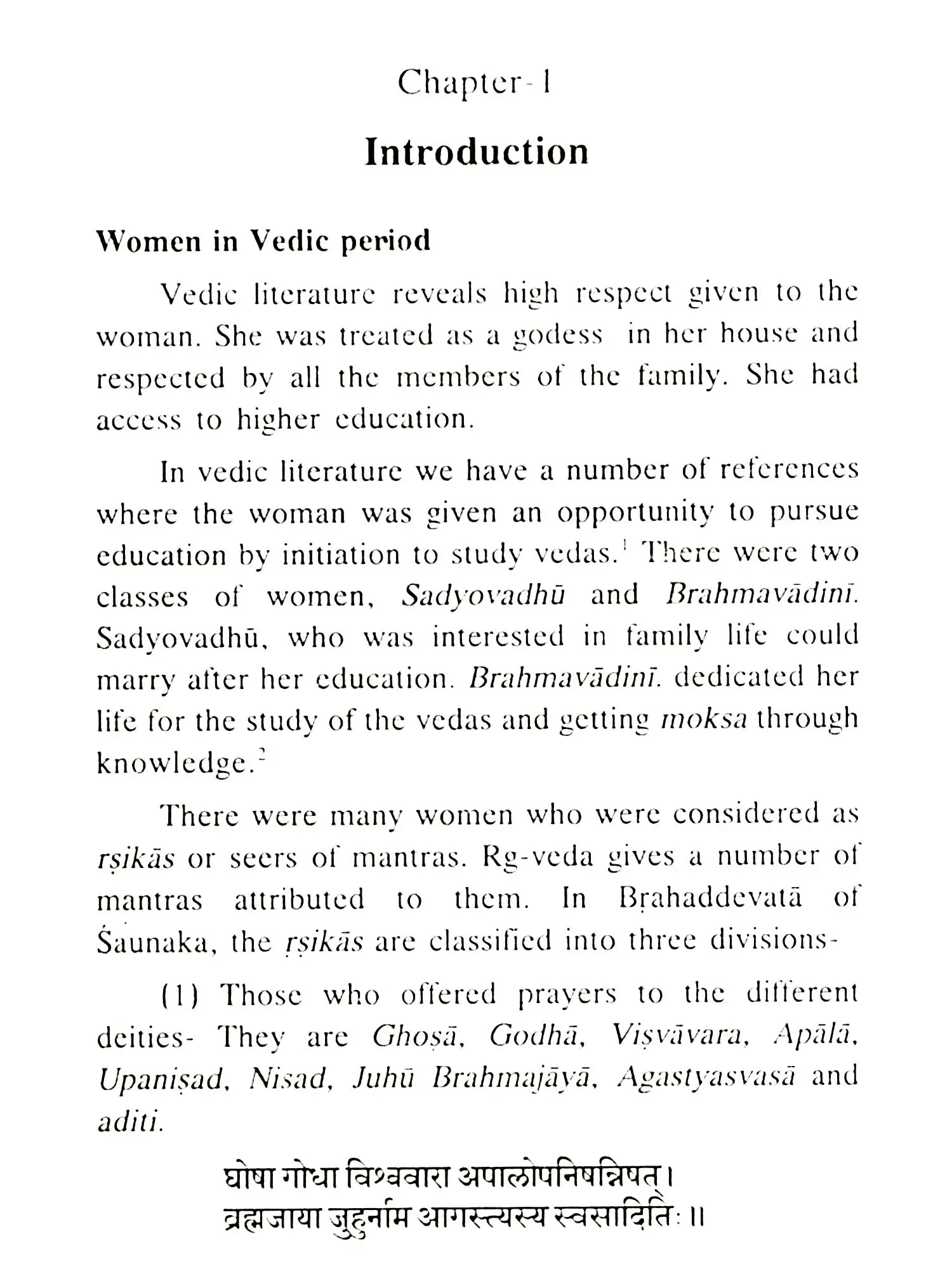 The methodology of research and approach to the problems which I have adopted in my study is both vertical as well as horizontal. Vertical approach of one single Purana text may not present before us what we may call "Puranic view". It may not enable us to present a synthetic picture of the actual state of affairs. Consequently, I have followed the horizontal method as well. It is only by combining the two methods, that the position of women in historical perspective can be obtained. Besides, attempt has also been made for checking and cross-checking the Purana passages by external evidences as and when necessary.