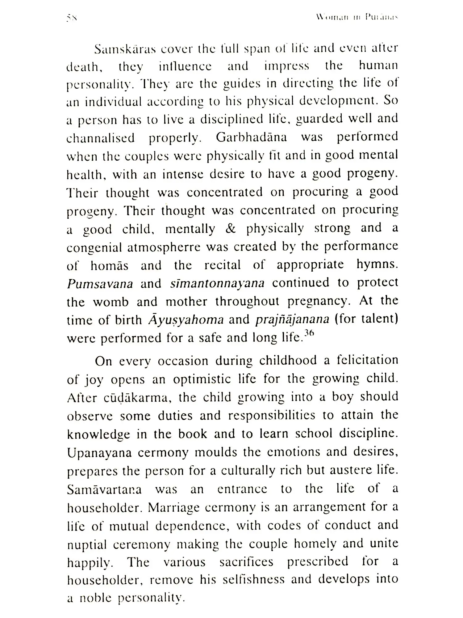 Position of Girls: Projection of the view that in the patriarchal society birth of girl was considered as an unwelcome event, Puranic evidence on this issue, rituals ensuring the birth of a talented daughter, daughter endowed with S 11a or virtue considered to be equal to ten sons: evaluation of Puranic reference to puri explaining It on the lines of definition of putra- one who saves his or her parents from hell; Puranic evidence on the fallacy of the view that female infanticide was practised in ancient India; references to the types and categories of girls like Nagnika , Vrishali, Visha- kanya, etc; categories of slave girls and offering them as gifts to illustrious personages and temples; evaluation of Puranic evidence on daughter's right to paternal property; implication of Puranic references to the honouring of virgin girls on festive occasions; evaluation of Puranic evidence on education of girls - references to the brahmavadini (life-long student of theology) and sadyodvaha (student till performance of marriage); assessment of Puranic data on proficiency of girls in fine art.