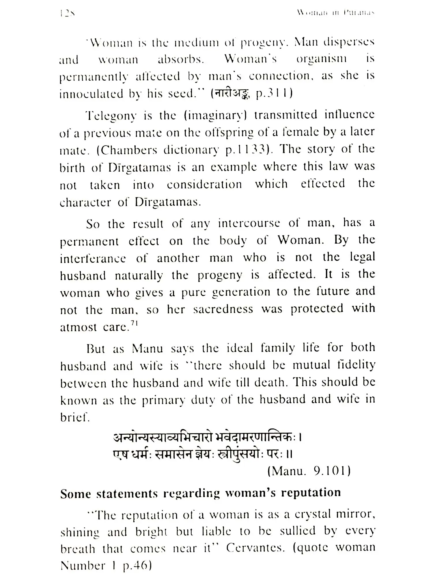 The puranas present a picture of woman who lead a happy and contended family life. Instances of sexual abuse between the wedded partners are very rare. Mutual understanding, attraction and interest played a key role in uniting the couple it appears. Motherhood was respected.