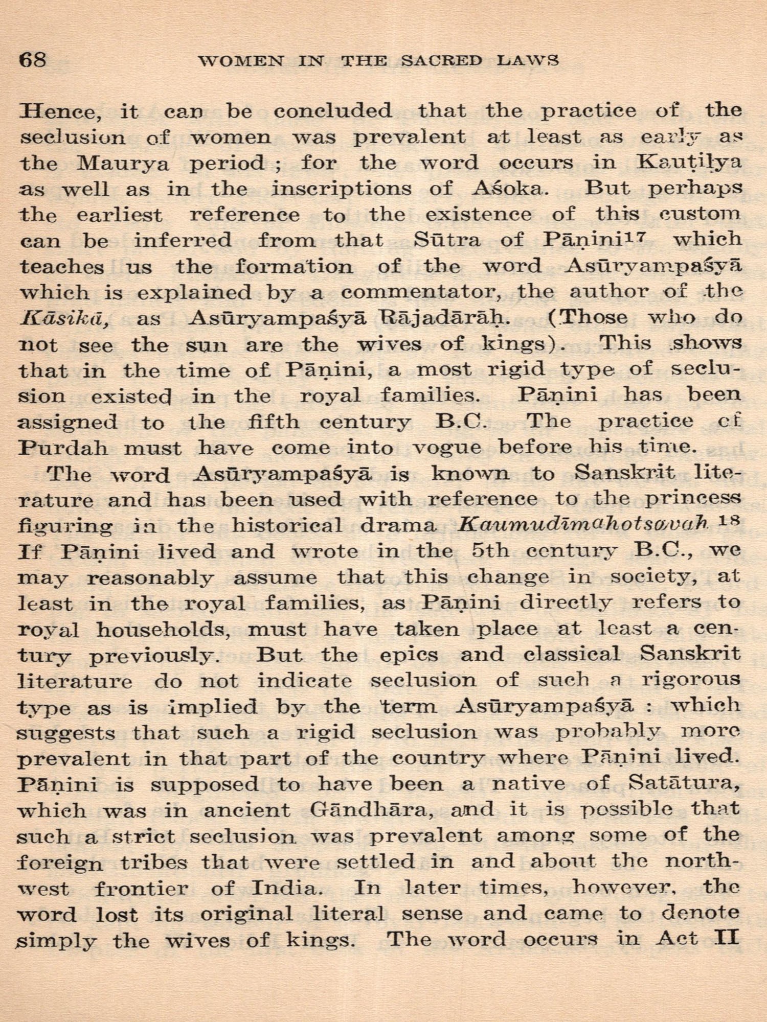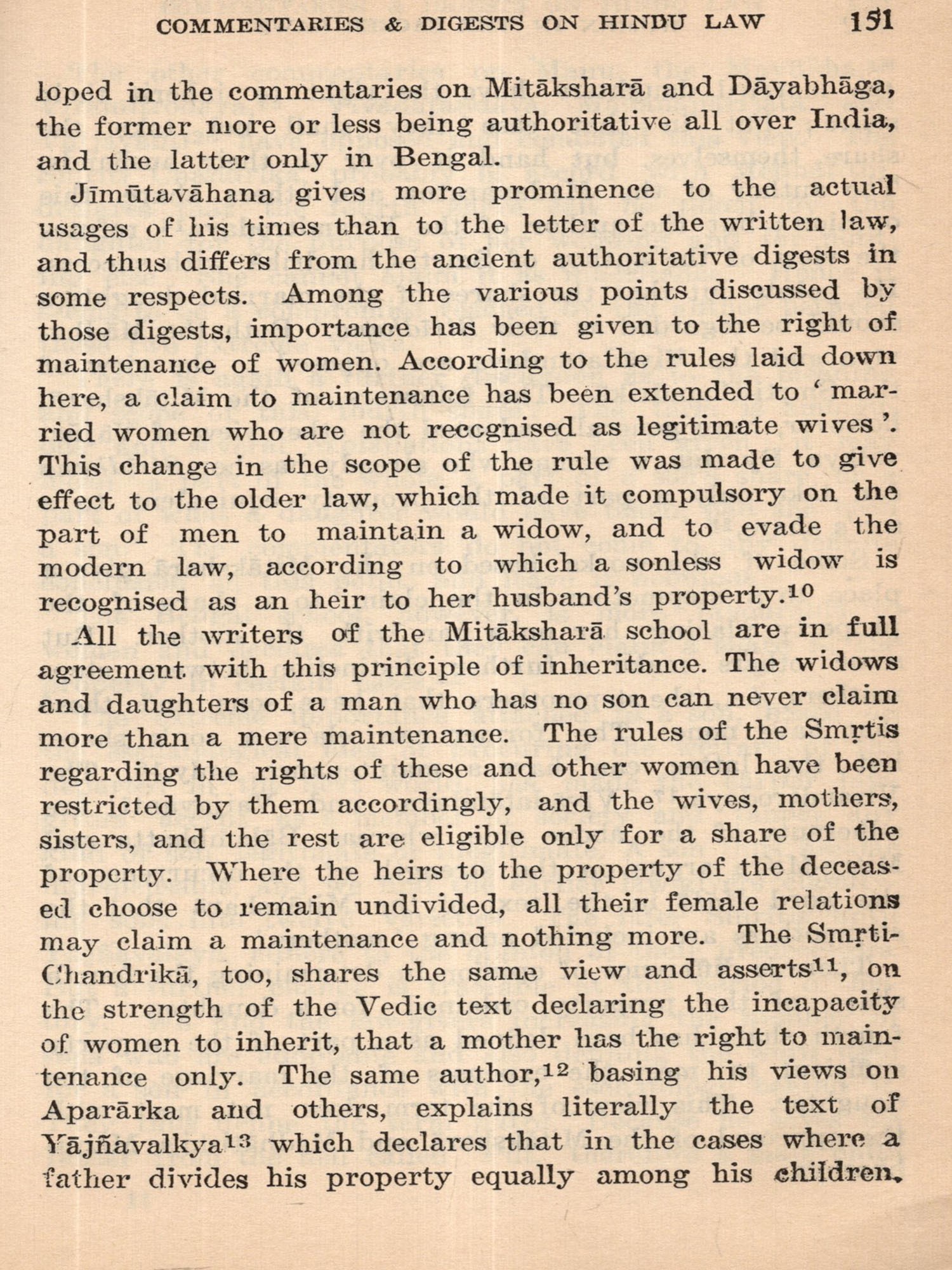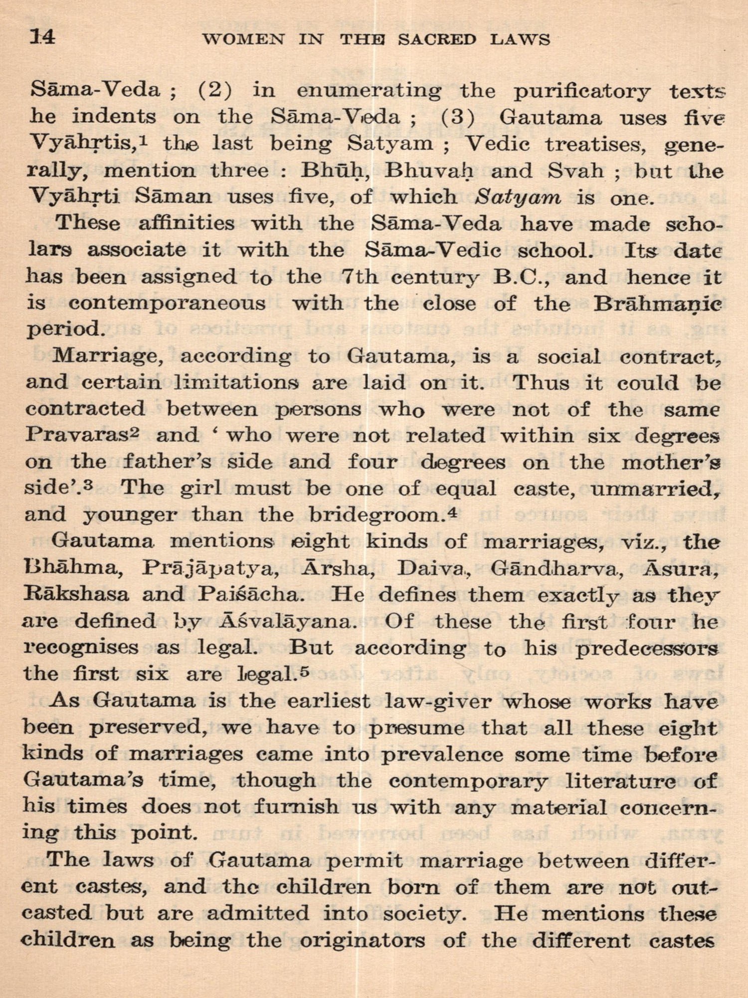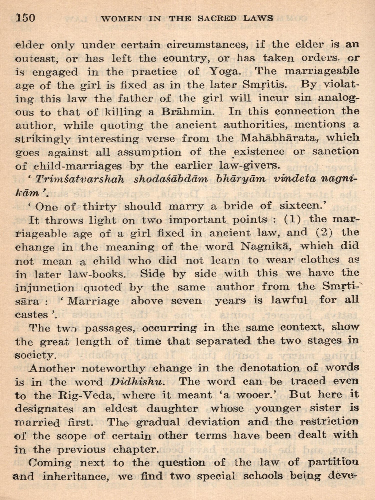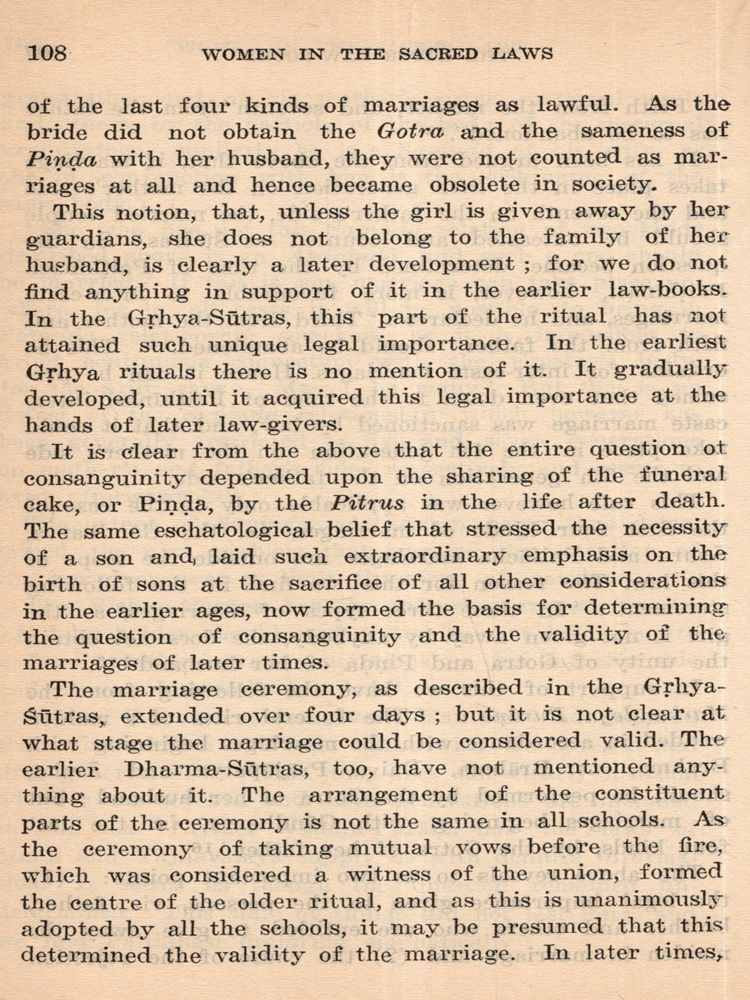In this volume we enter the stage of the Dharma-Sutra, codification of the Sacred Law, followed by an age of commentators, and then of schools of interpretation, authorities and digests. In this professionally congenial field of manipulation of texts and accommodation of novel usages by exceptions and revised definitions the legalists of all nations would find themselves at home. A main factor in actual changes of practices and mainspring in a progressive contraction of women's legal status, the authoress sees in the unconditional religious requirement of a son to secure the beatification of ancestors and the continuity of the family. Then there are the elaborate classifications of sons and of possible brides conditioned by rules concerning gotra pinda, etc., pseudo-scientific niceties, avoidances and omens: there is steady reduction of marriage age and discouragement of the ancient condition of widow remarriage. Amid the limitation of inheritance a fuller consideration than is usual is here given to the ancient practice of appointment by a sonless father of a daughter to function as his son and heir, the status of putrika historically important in at least a part of the Indian sphere. The terrible approval of Sati, for which the Greeks conceived a too ingenious explanation, is here plausibly attributed to the domination by conquering peoples from northern Asia.