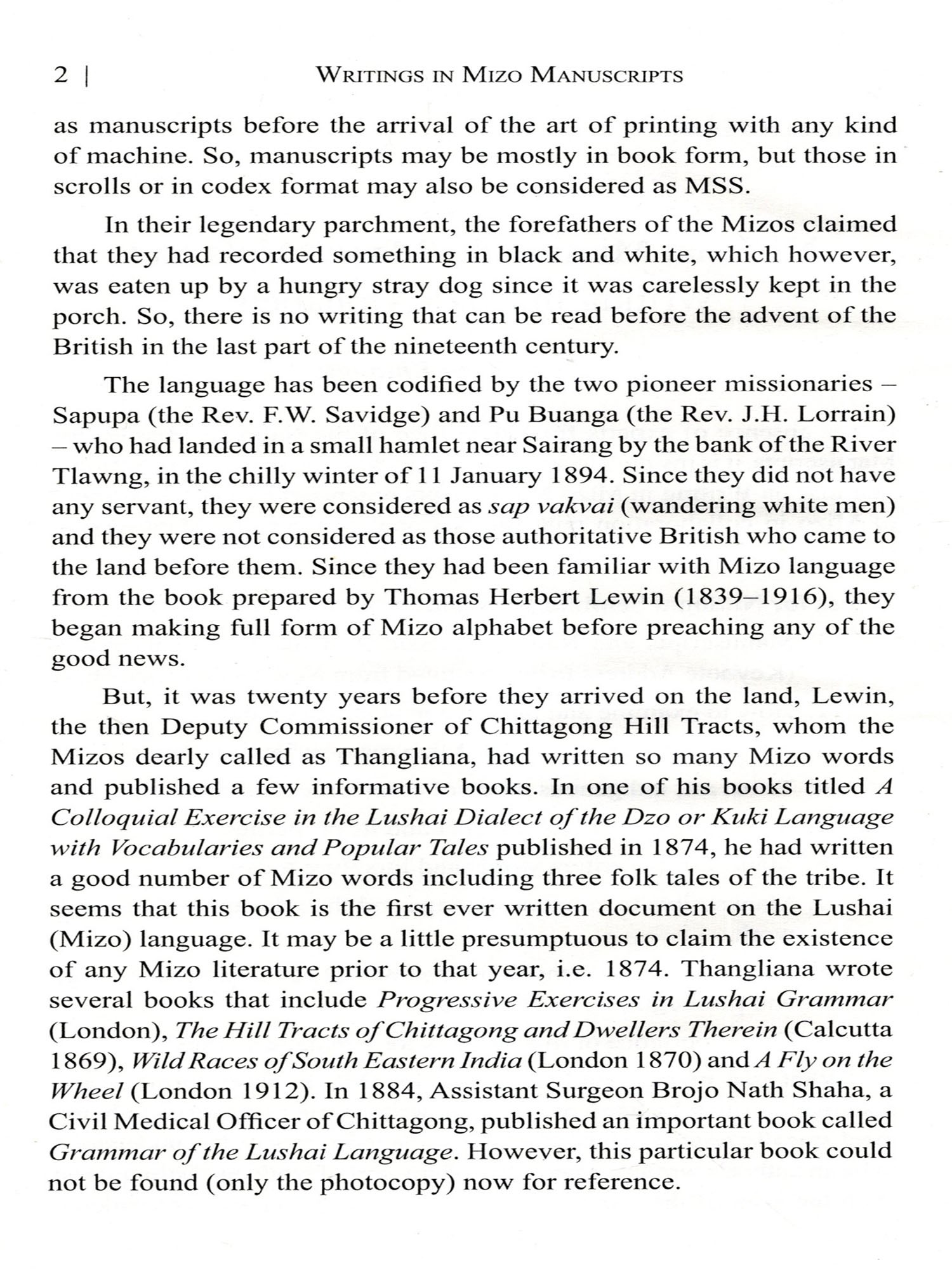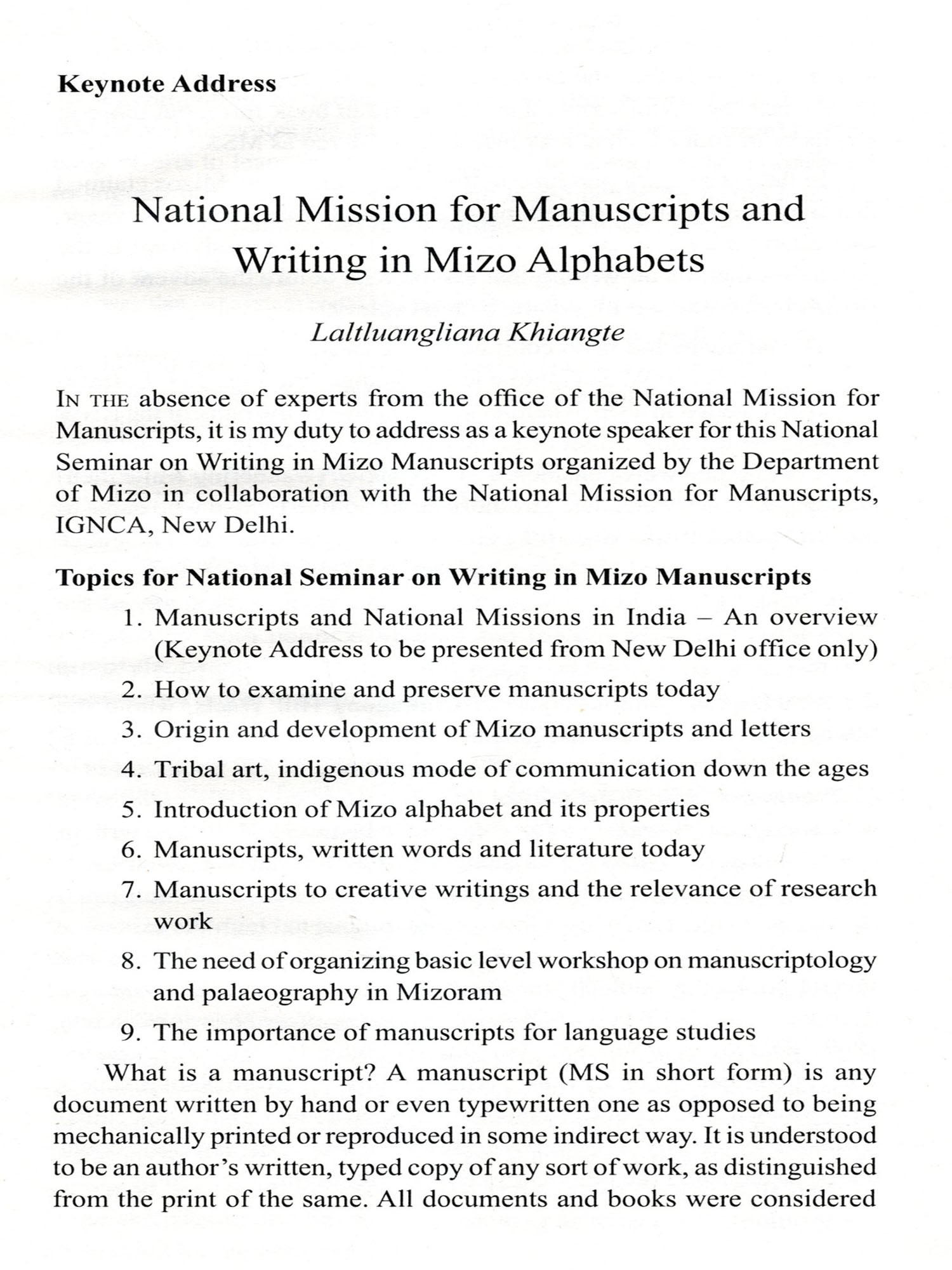 This publication Writings in Mizo Manuscripts, a culmination of seminar papers, is an in-depth study on the foundation and structure of Mizo language and its manuscripts.