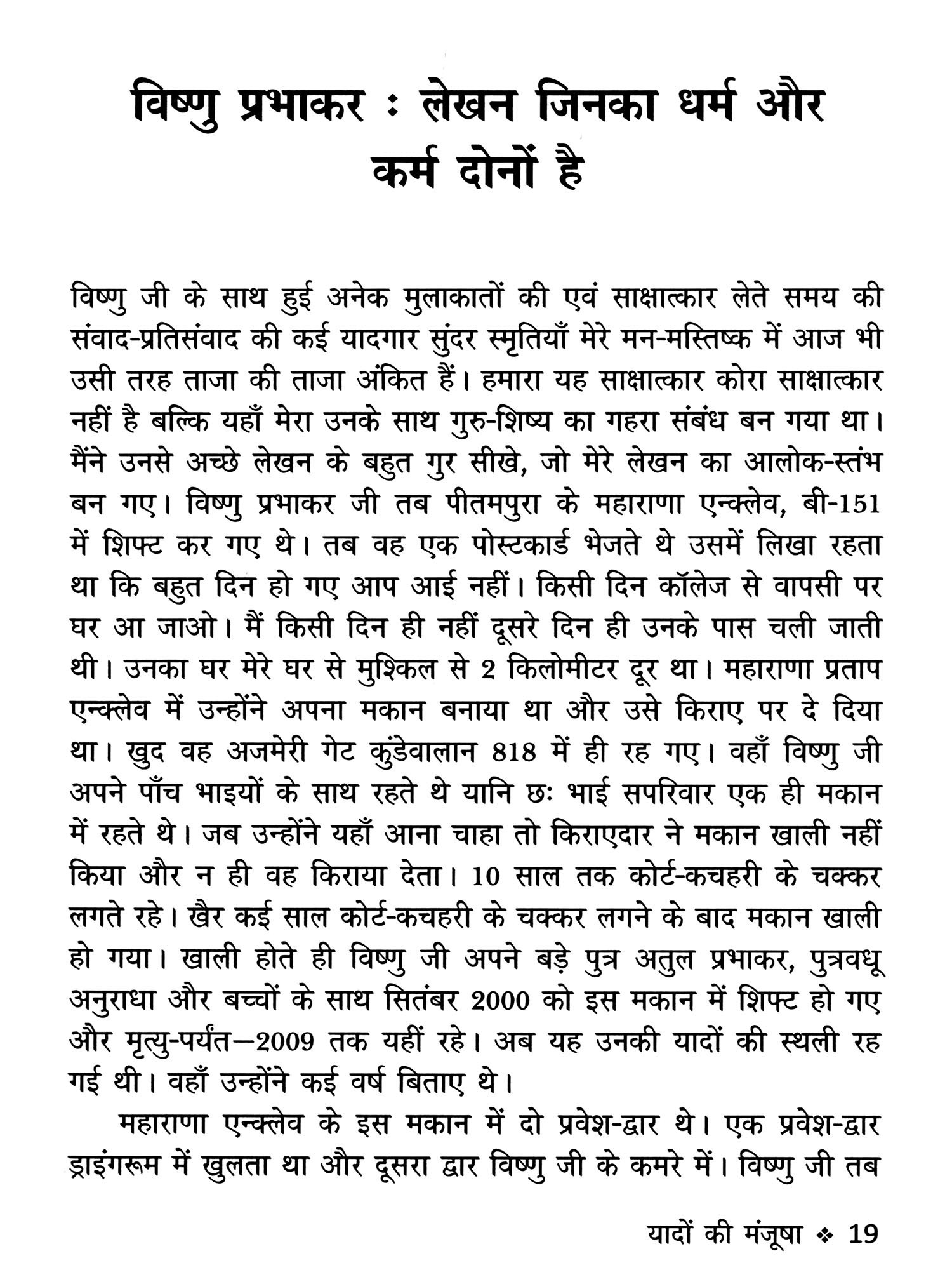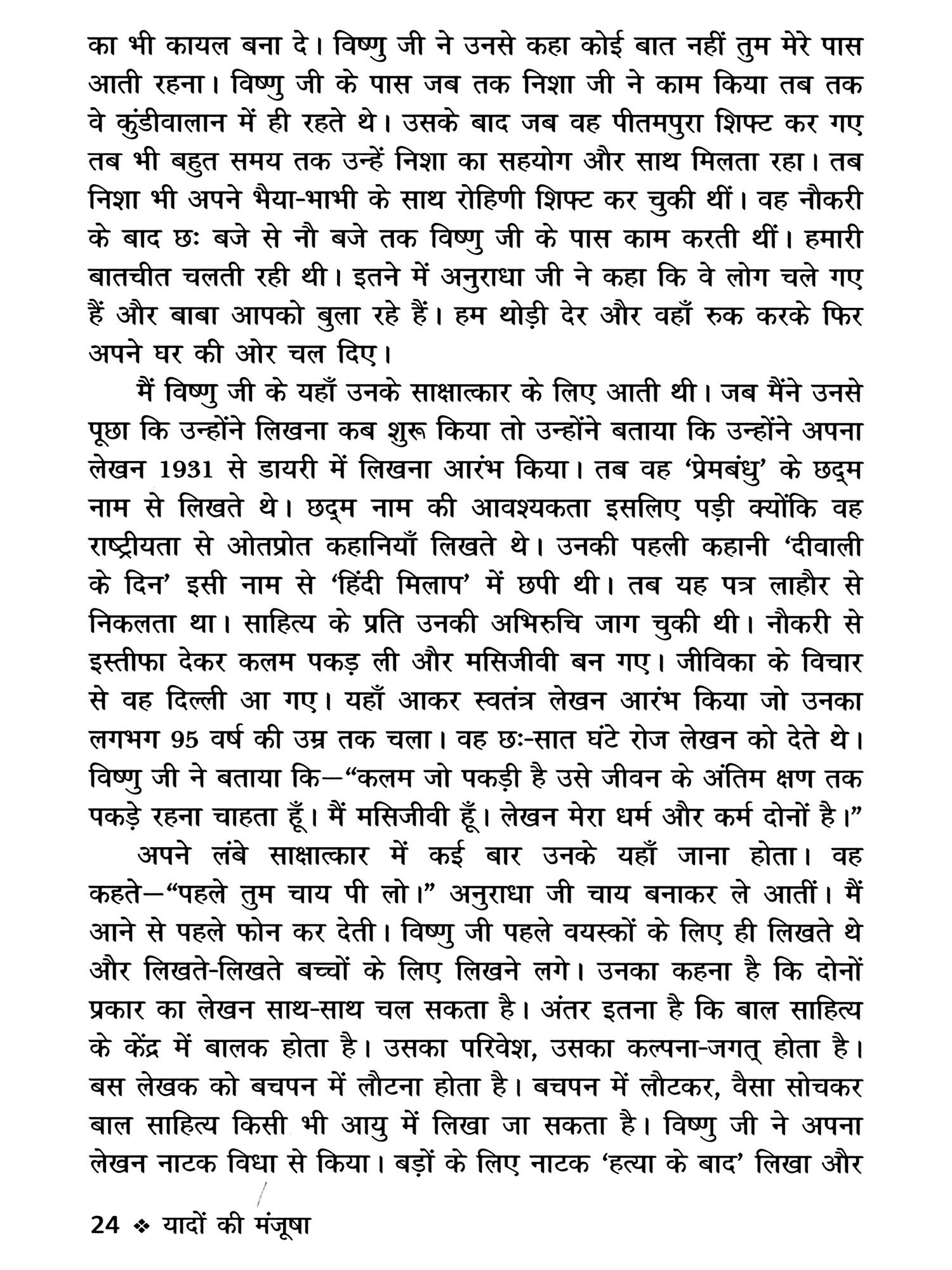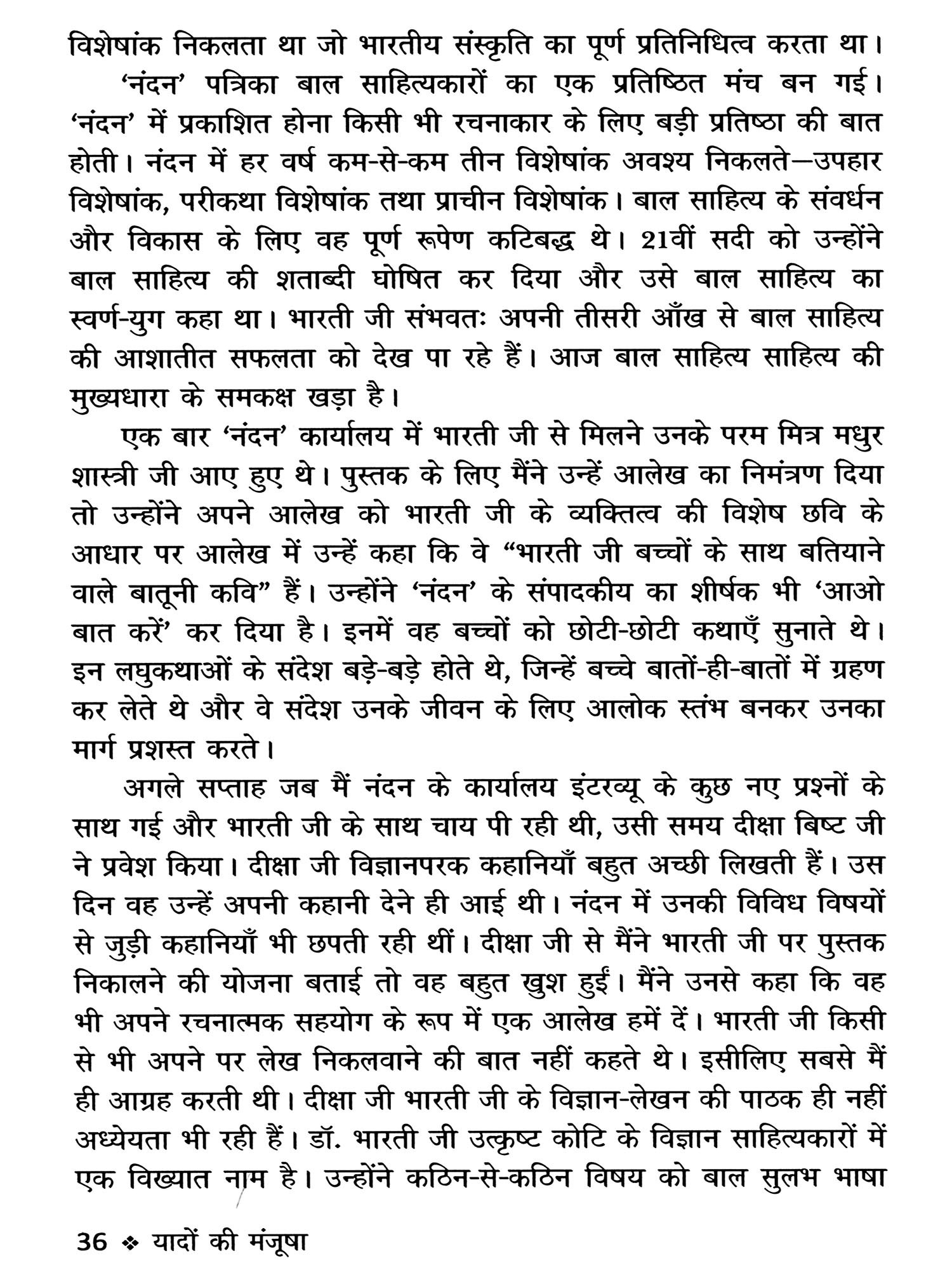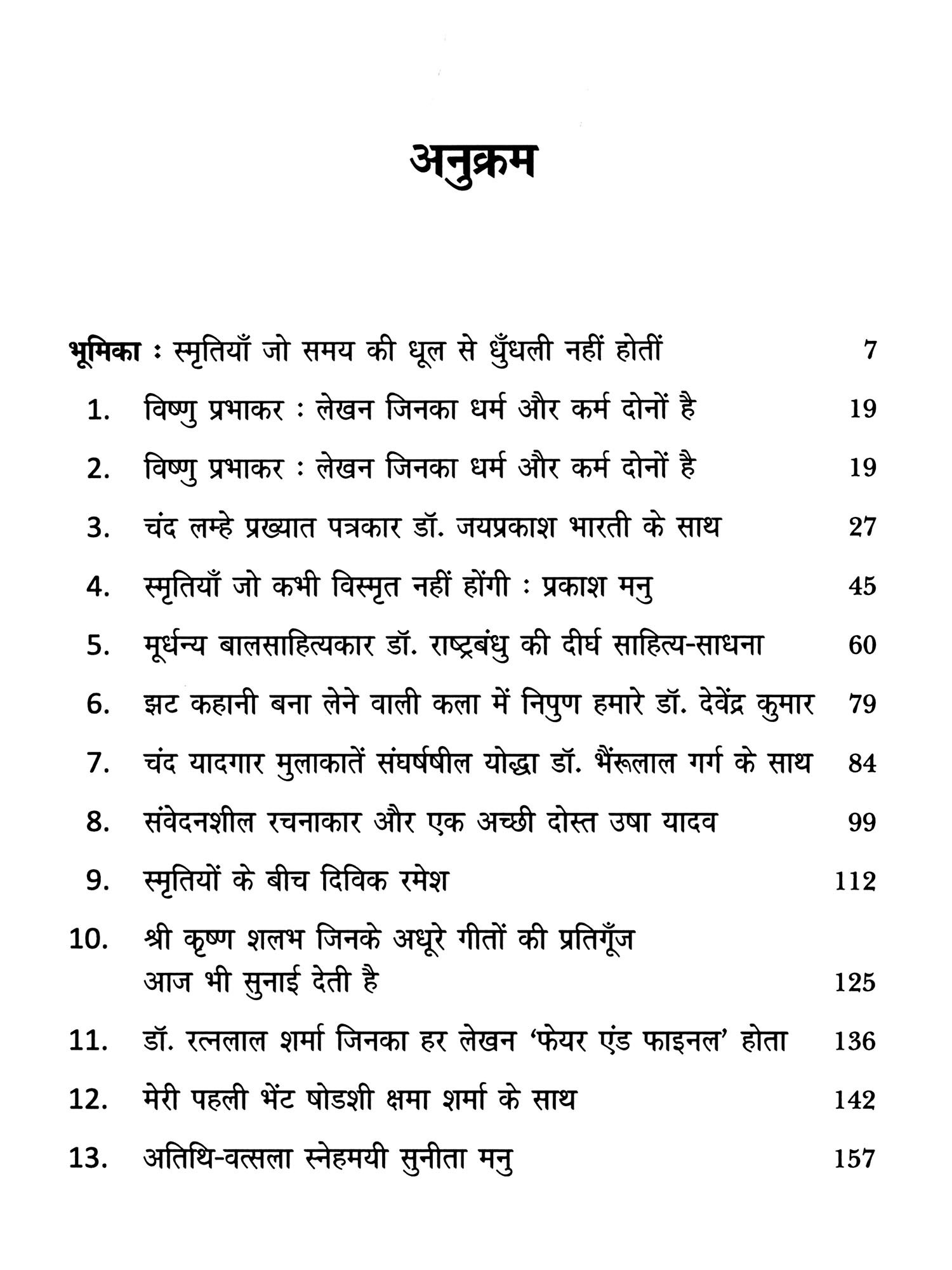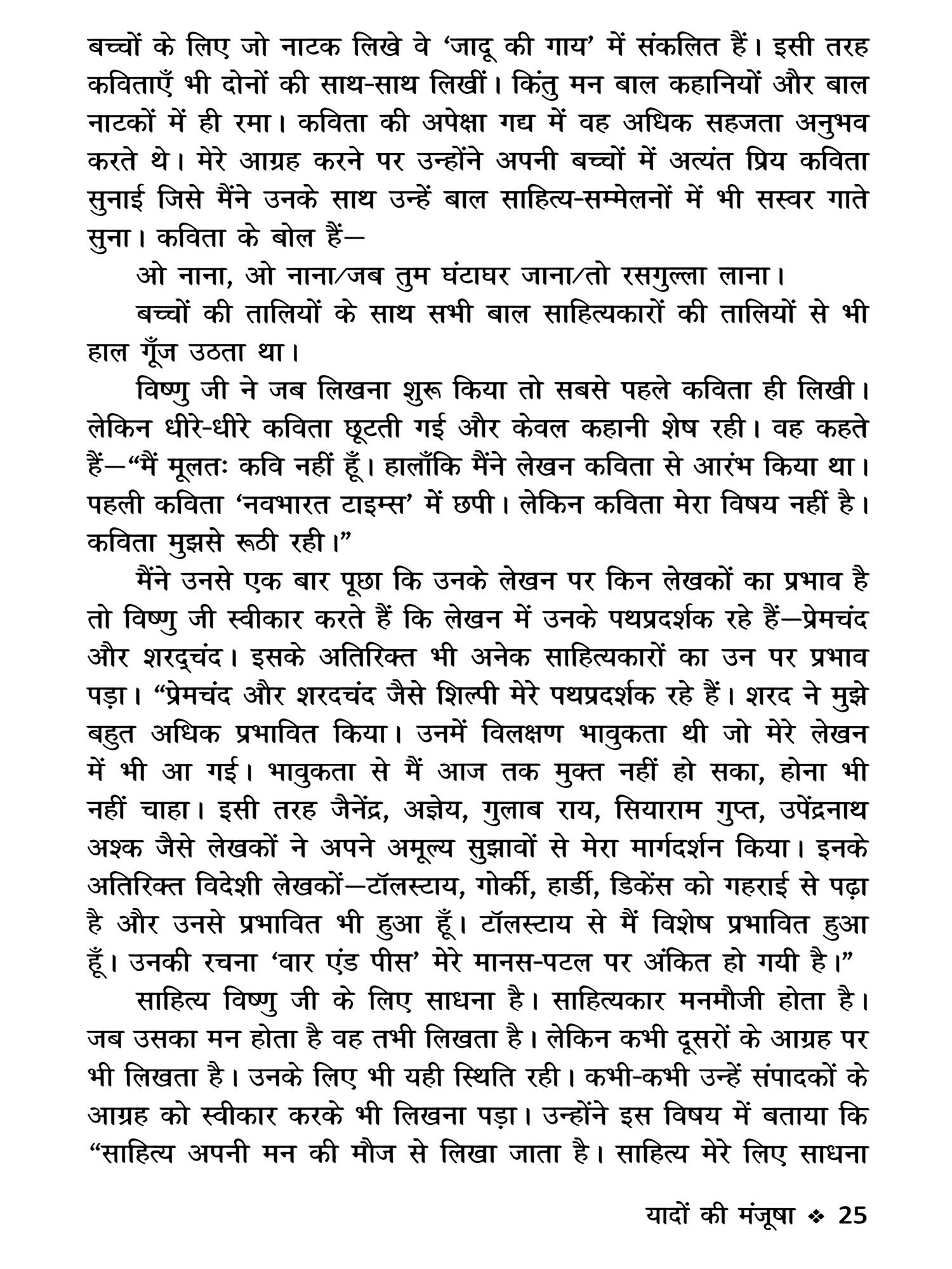 आइए आप भी मेरे साथ मेरी अतीत की स्मृतियों में, जहाँ आप मिलेंगे एक दर्जन मेरे प्रिय वरिष्ठ बाल साहित्यकारों से। वरिष्ठ साहित्यकार विष्णु प्रभाकर जी के साथ हुई अनेक मुलाकातों की एवं साक्षात्कार लेते समय की संवाद-प्रतिसंवाद की कई यादगार सुंदर स्मृतियाँ मेरे मन-मस्तिष्क में आज भी उसी तरह ताजा की ताजा अंकित हैं। साहित्यिक दलबंदी और प्रचार से दूर विष्णु जी के लिए पाठक और उनकी प्रशंसा ही सबसे बड़ी पूँजी थी। “वे मेरी रचनाओं को चाव से पढ़ते हैं। किसी भी साहित्यकार के मूल्यांकन का आधार रचना होती है उसका दलतंत्र नहीं।"