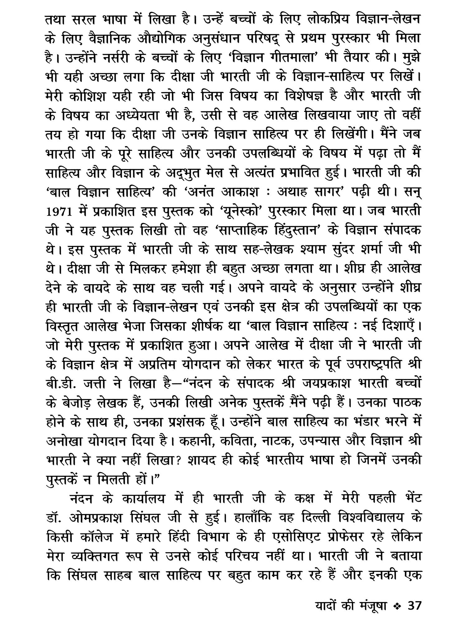जब आप जयप्रकाश भारती जी से मिलोगे तो पाओगे कि सौम्य और सरल भारती जी का हृदय सचमुच बाल सरलता का प्रतीक था। विज्ञान के विद्यार्थी होने के साथ-साथ उनके हिंदी साहित्य और हिंदी भाषा पर आश्चर्यजनक अधिकार ने मुझे भीतर तक प्रभावित किया था। भारती जी ने मुझे अपनी पुस्तक 'हिंदी साहित्य की सौ श्रेष्ठ पुस्तकें' दी। मैंने पुस्तक के पृष्ठ पलटते हुए एक नजर में देख डाली। उन्होंने मुझसे कहा कि मैं अब हिंदी बाल साहित्य की सौ श्रेष्ठ पुस्तकें लिखूँ। मैंने कहा कि मैं इतना बड़ा काम नहीं कर पाऊँगी। पुस्तकों का संग्रह फिर उन्हें आद्योपांत पढ़ना और फिर सौ श्रेष्ठ पुस्तकों का चयन। भारती जी ने कहा कि पुस्तकें हम आपको उपलब्ध करा देंगे। जो हमारे पास हैं वे मैं आपको दे दूँगा। कुछ प्रकाश मनु जी दे देंगे और राष्ट्रबंधु जी तो हैं ही। सबके साझे सहयोग से वह कार्य वर्षों में पूरा हुआ। अस्वस्थता के चलते सौ तो नहीं 'हिंदी बाल साहित्य की 75 श्रेष्ठ पुस्तकें' ही कर पाई।