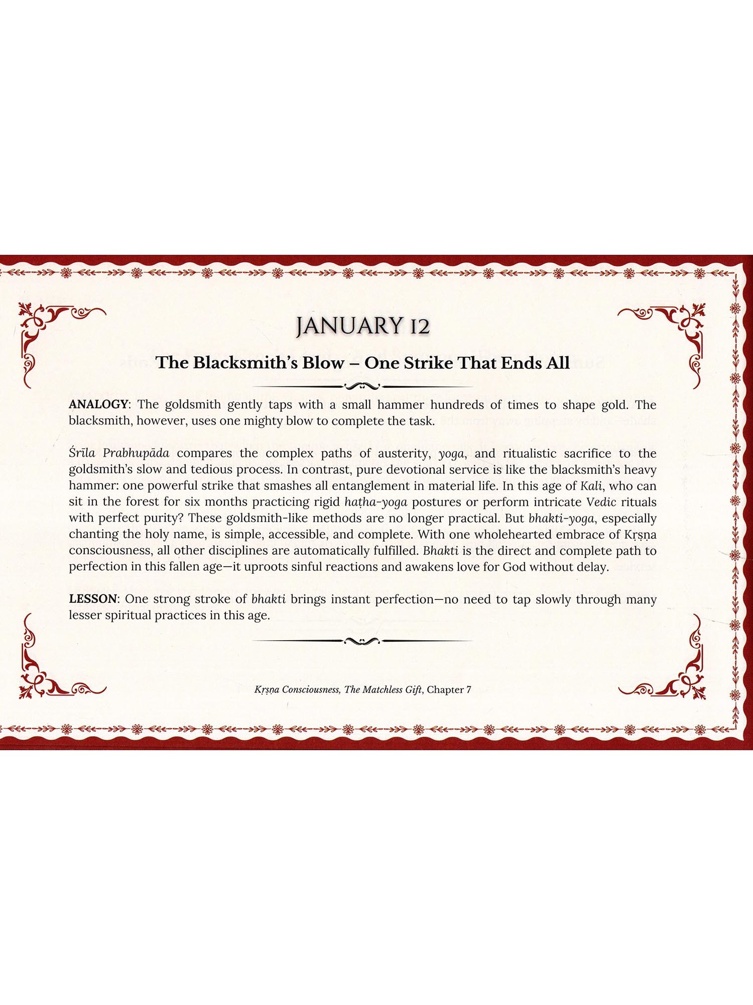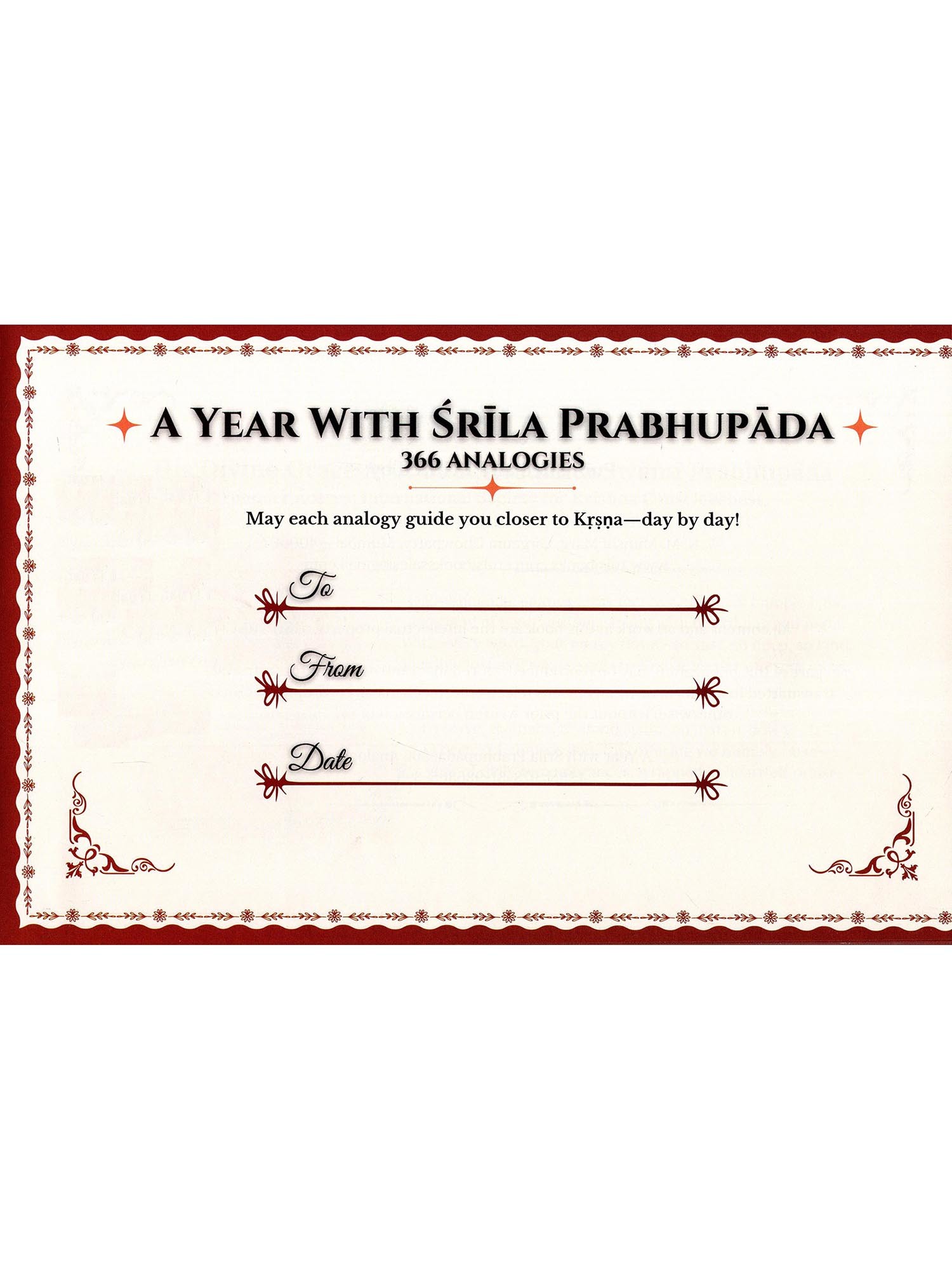 A Year with Śrila Prabhupada: 366 Analogies is a humble offering born from gratitude. Each analogy is drawn from his original teachings, celebrated for their profound clarity and relevance in everyday life.