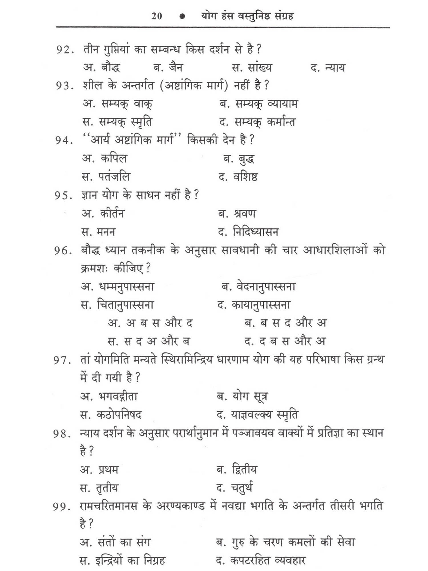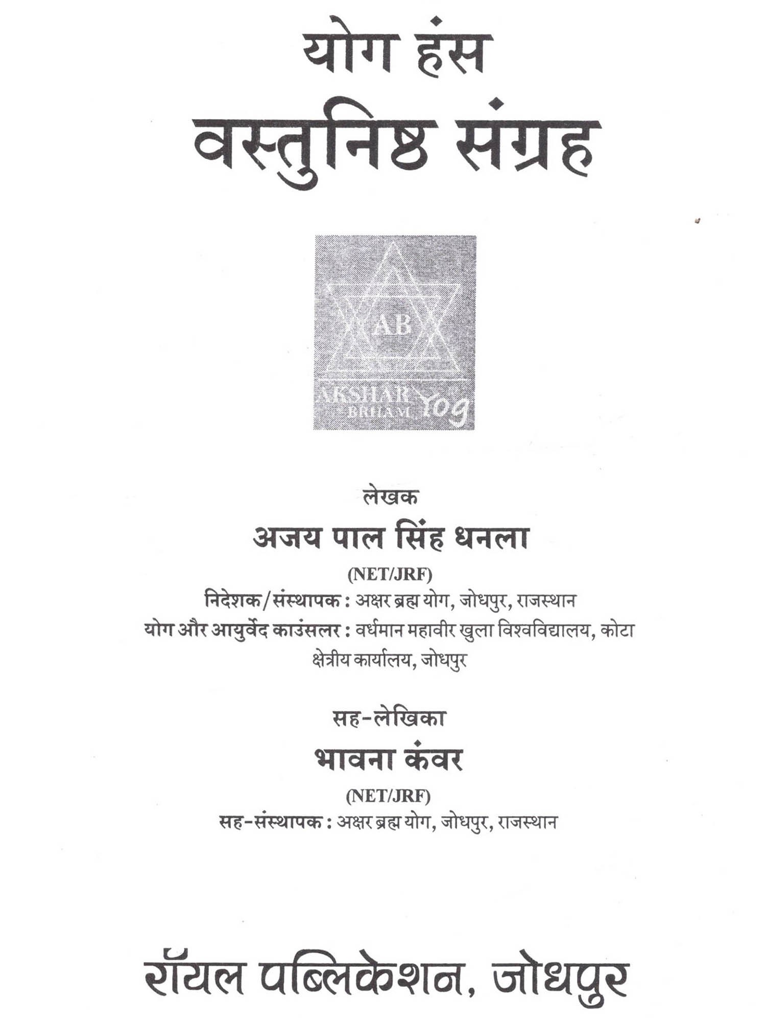 पुस्तक परिचय प्रस्तुत पुस्तक "योग हंस वस्तुनिष्ठ संग्रह" में NTA की वर्तमान परीक्षा पद्धति के अनुरुप सुमेल, अभिकथन-तर्क सही युग्म इत्यादि गुणवत्ता युक्त प्रश्नों का समावेश किया गया है प्रश्नों का संग्रह यूनिट (इकाई) के अनुरूप किया गया है। विगत वर्षों के प्रश्नों का भी समावेश प्रत्येक यूनिटमें किया गया है और NTA की परीक्षा पद्धति के अनुरूप नये प्रश्नों का समावेश किया गया है। प्रस्तुत पुस्तक योग विषय में नेट जेआरएफ के साथ-साथ पीएच.डी, वाई.सी.बी., सेट, एम.ए, पी.जी. डिप्मोला आदि के लिए उपयोगी है।