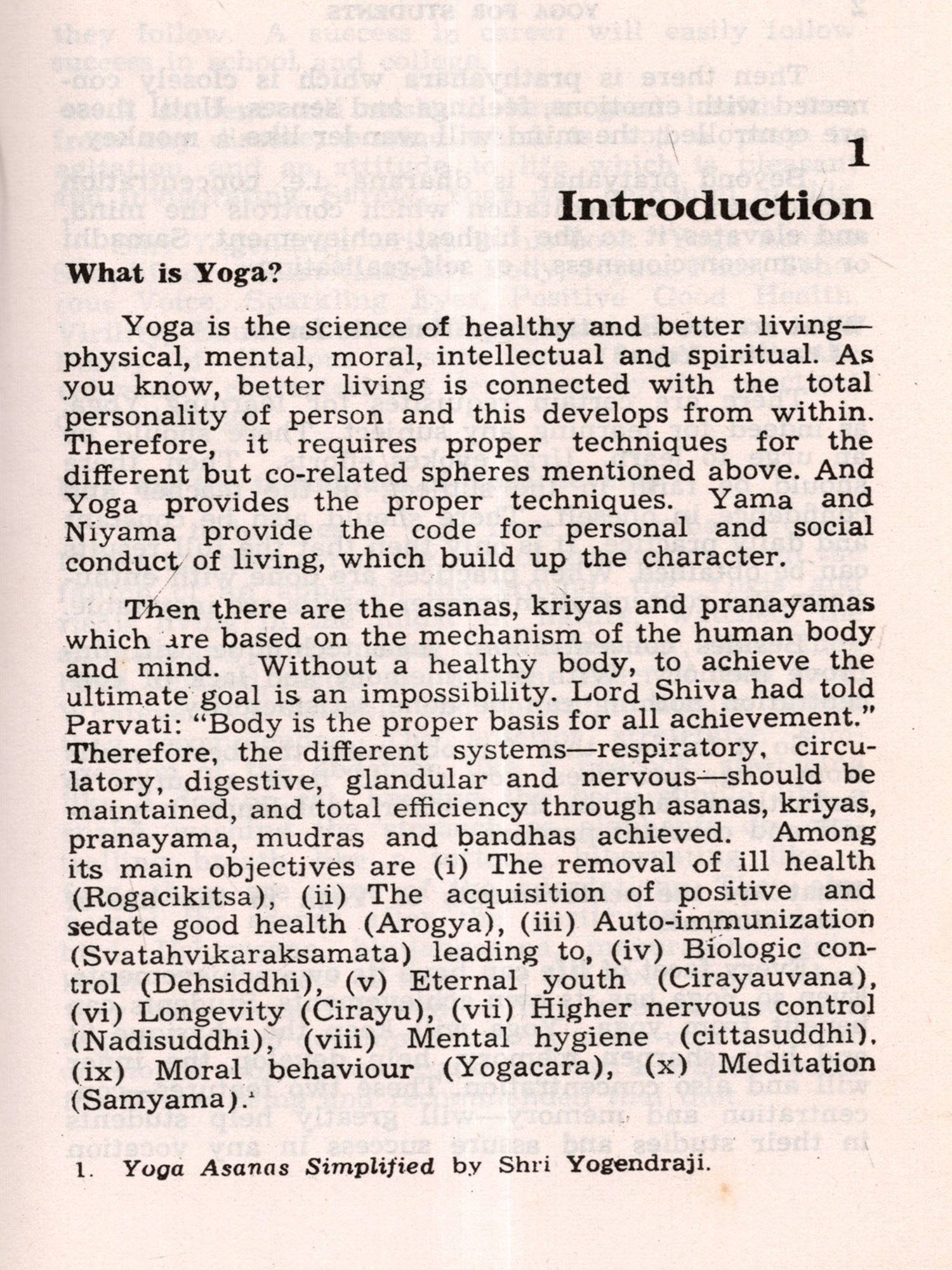 It will be very appropriate if I say that this book is for better living through Yoga technology and ideology, because Shri Yogendraji, Founder and President of the Yoga Institute, Santa Cruz, and All-India Board of Yoga, Bombay, has provided a simplified course of Yoga on the basis of traditional yoga techniques. The simple course was formulated on his experiences and researches on educational and medical values of yoga during the past 54 years.