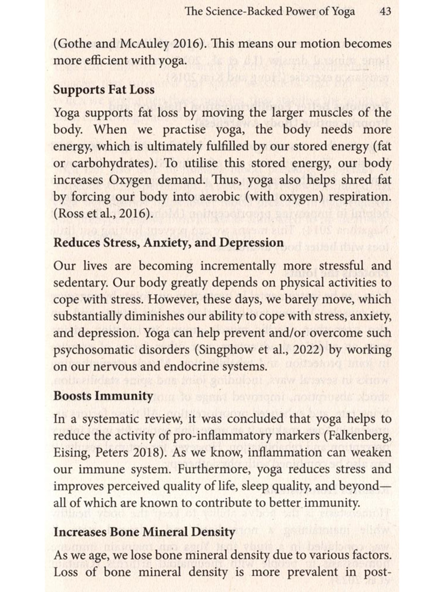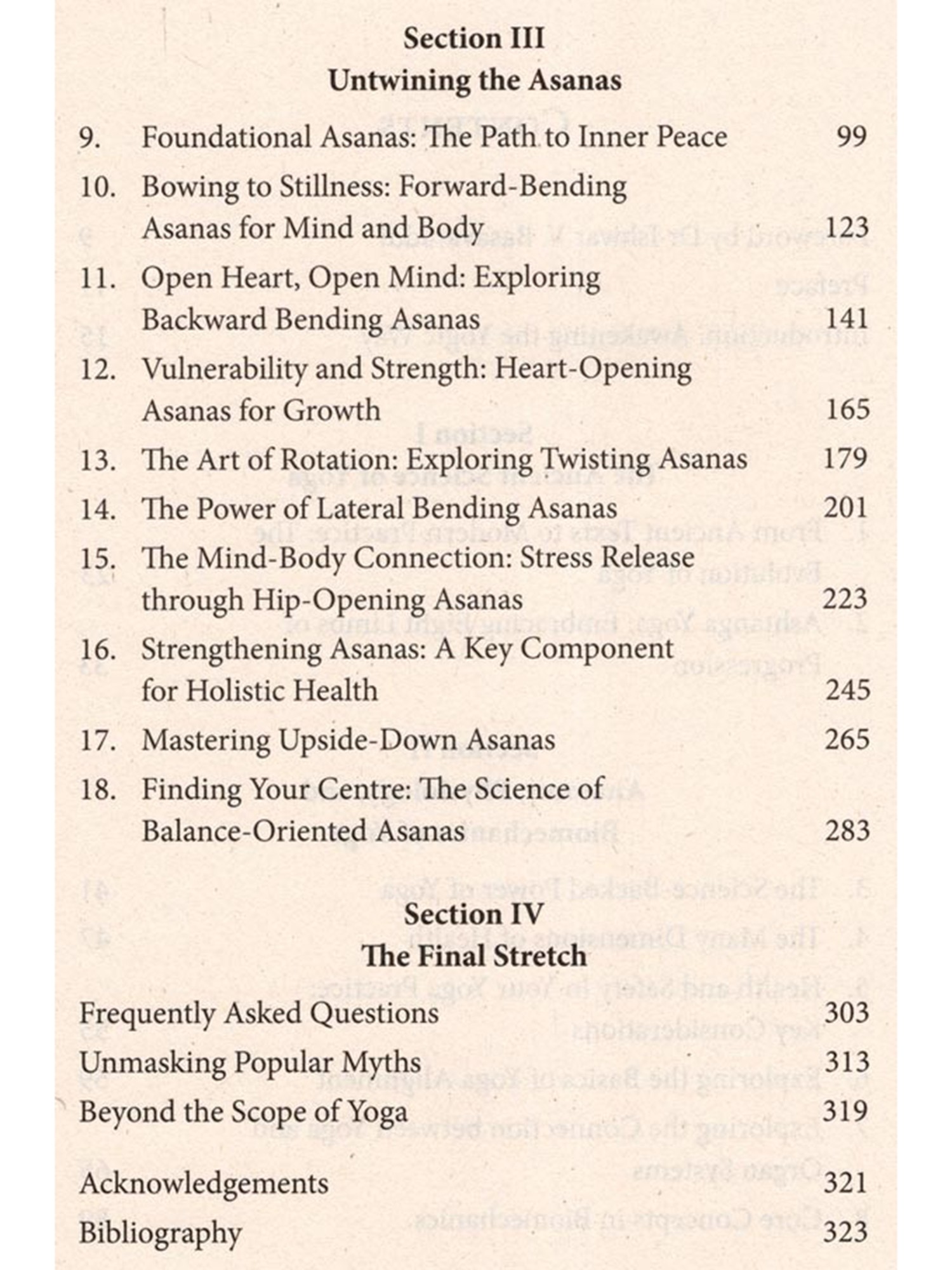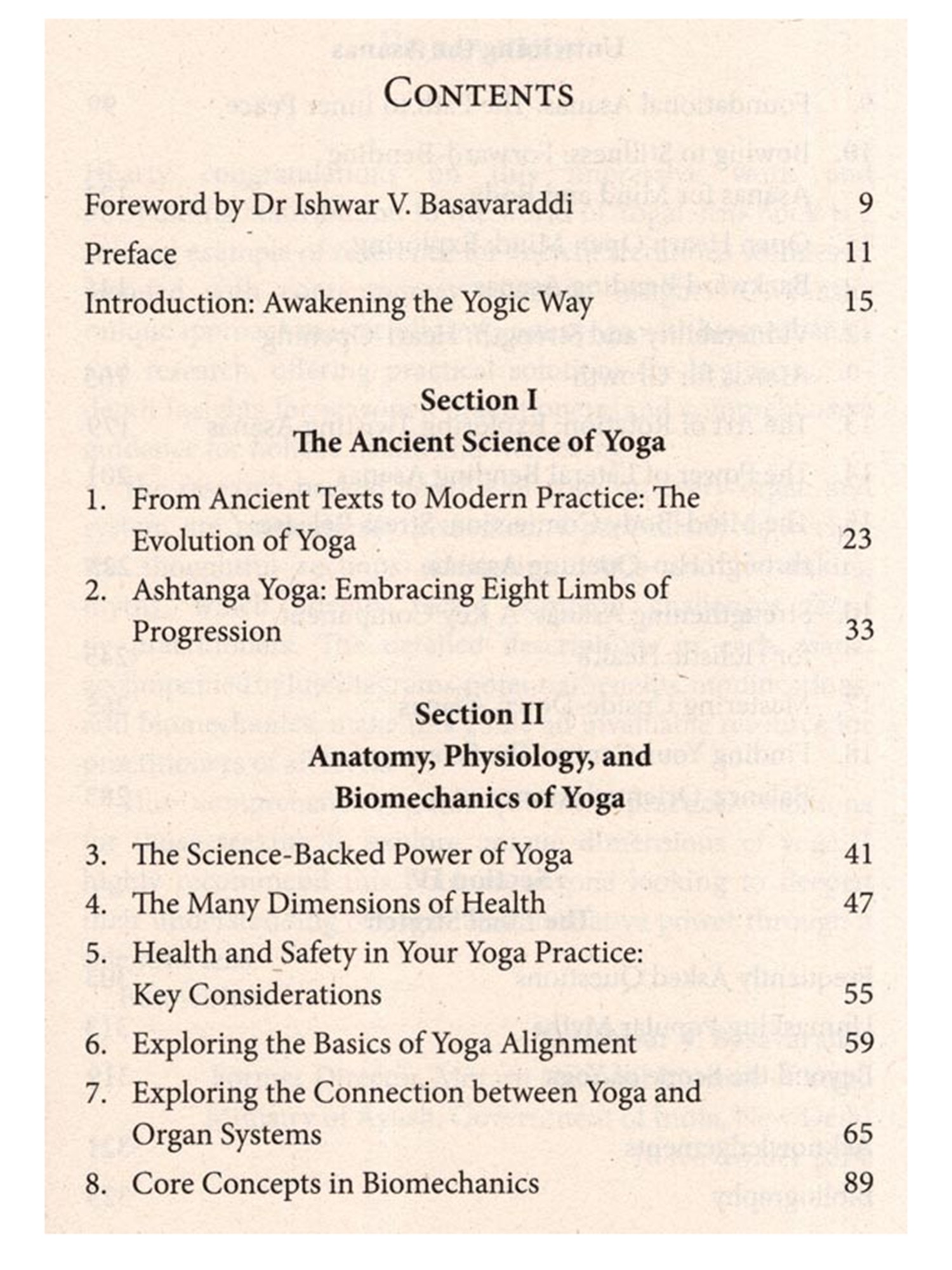 What to Expect: Through this book, we will embark on a journey into the world of yoga, bridging ancient science with contemporary science and uncovering its underlying mechanisms. While a multitude of research has shown yoga to be effective across most health parameters, much of its potential is clouded due to the widespread mysticism backed by unsupported claims. This book unearths the anatomy, physiology, and biomechanics of yoga while retaining its rich legacy. Furthermore, we will learn about more than 50 asanas, well-suited for beginners and advanced practitioners alike. Whether you are an enthusiast or professional this comprehensive book will guide you to elevate your knowledge and practice of yoga, backed by research and ancient scriptures.