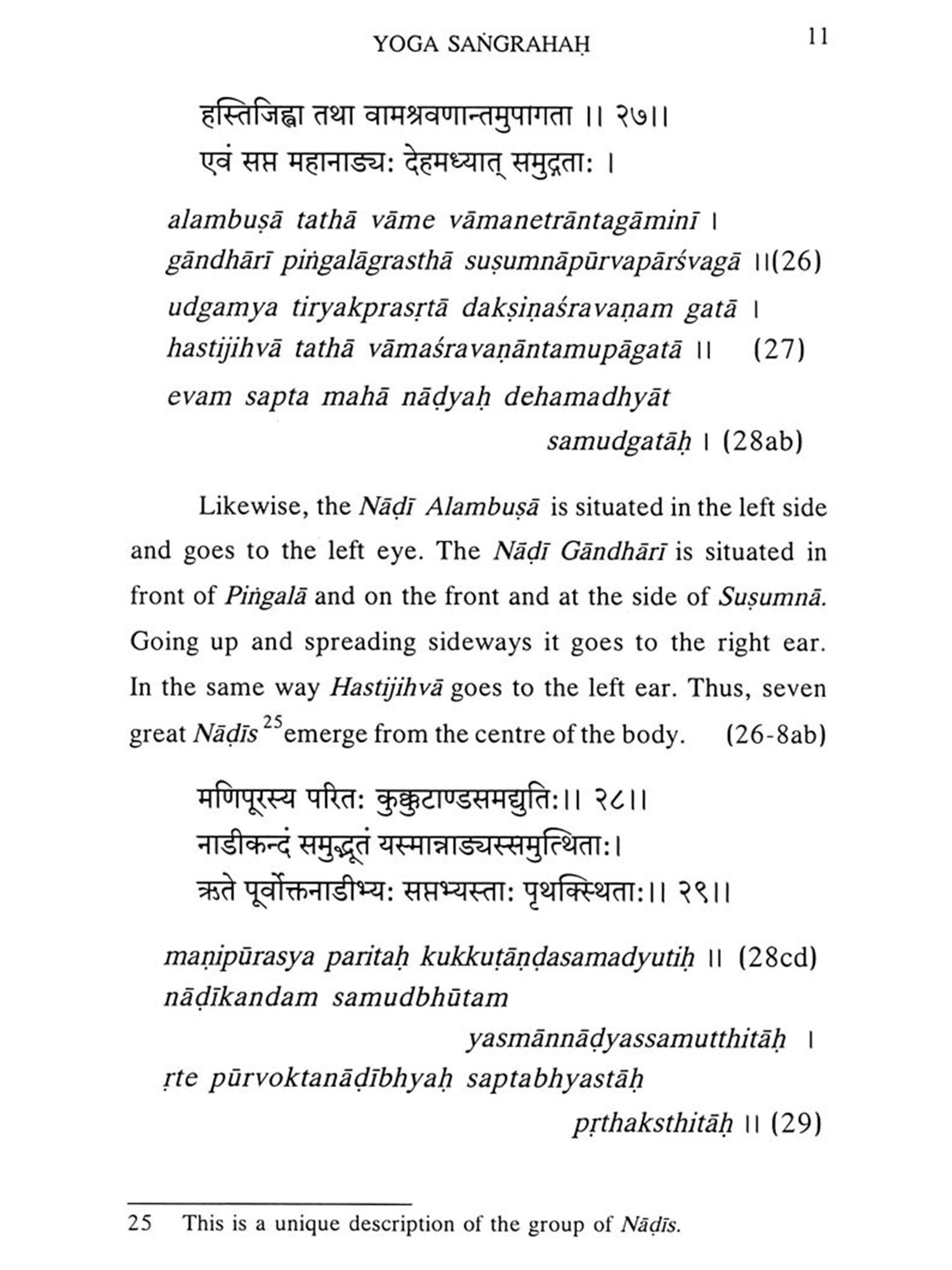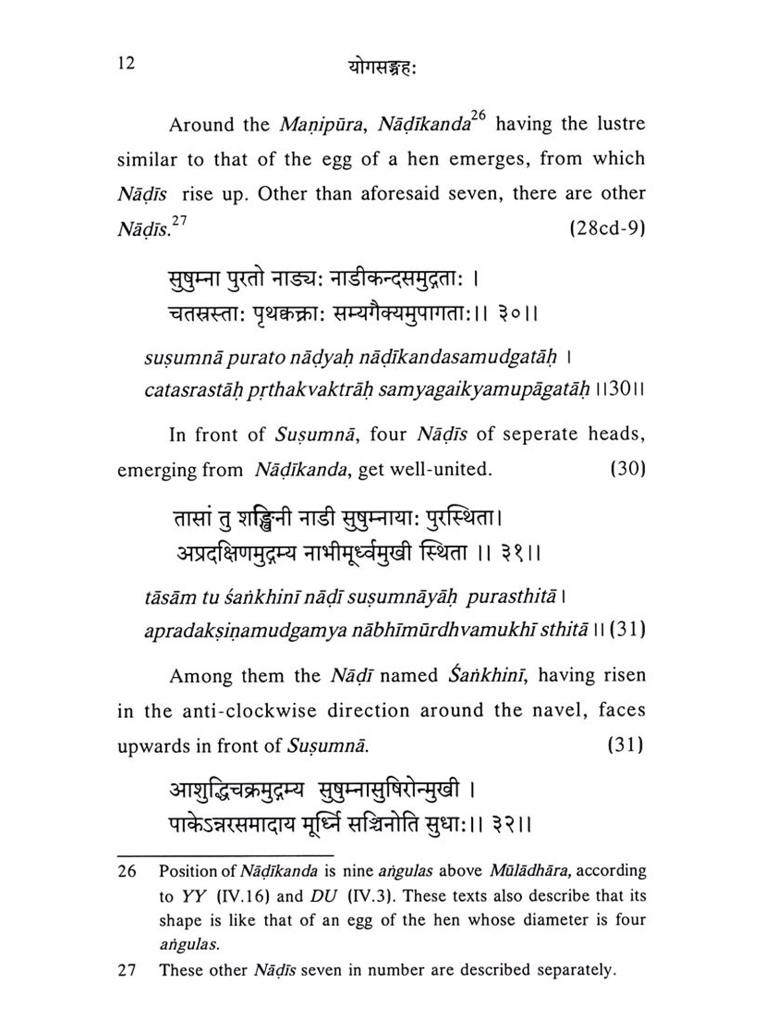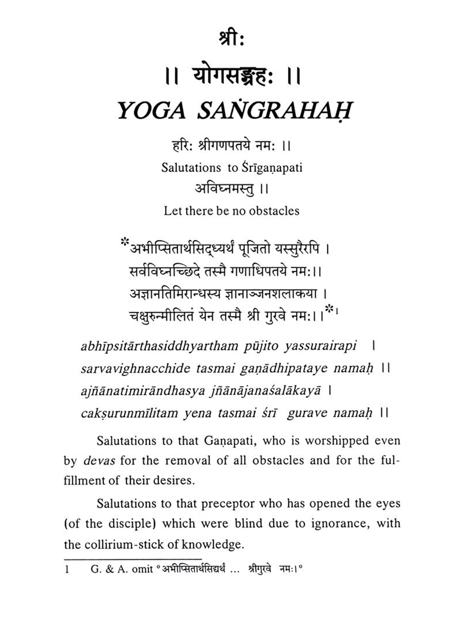 The word Yoga has become universal. People from different walks of life have realized the value of Yoga in their worldly and spiritual life. However, not many original books on Yoga are known to people, including scholars engaged in the study of Yoga and practitioners of Yoga. Some of the popular texts on Yoga are Yogasütras (YS) of Patanjali, Yoga Yājñavalkya (YY), Hatha Yoga Pradipika (HYP), of Svātmārāma, Śiva Samhitā (SS), Hatha Ratnavali (HR) of Śrīnivāsa Yogīndra, Yoga Upanisads and Gheranda Samhita (Gh.S). Few works of Goraksanātha like Amanaska Yoga, Yoga Bīja and Goraksa Samhita (GS) have also attracted the attention of scholars. These are only few in number compared to a vast number of unpublished texts on Yoga which lie scattered in many parts of India. Our Institute has taken up the task of bringing out critical edition of some rare and unpublished texts on Yoga. Yoga Sangraha (Y.San) is one such text, which is unique with regard to the content. As in the case of many texts on Yoga and Šäkta, the author of Y.Sań does not reveal any information about himself. This text in the form of the in struction by the Guru to his disciple. It is in Anustubh metre, It consists of 184 verses (GOML) excluding the first two verses in which prayer is offered to lord Ganesa and the Guru. Although Y.San contains details which are found in the texts on Hatha Yoga, it cannot be termed as a text belonging to this school. The treatment of Nadis, Asanas, Prānāyāma etc. differs from the descriptions given in the popular texts on Hatha Yoga. The description of Nadis, how the food is digested and the nutrients are taken to different parts of the body and the unwanted elements are eliminated are dealt with in this text, making it clear that the author of Y.San was well versed with Ayurveda.