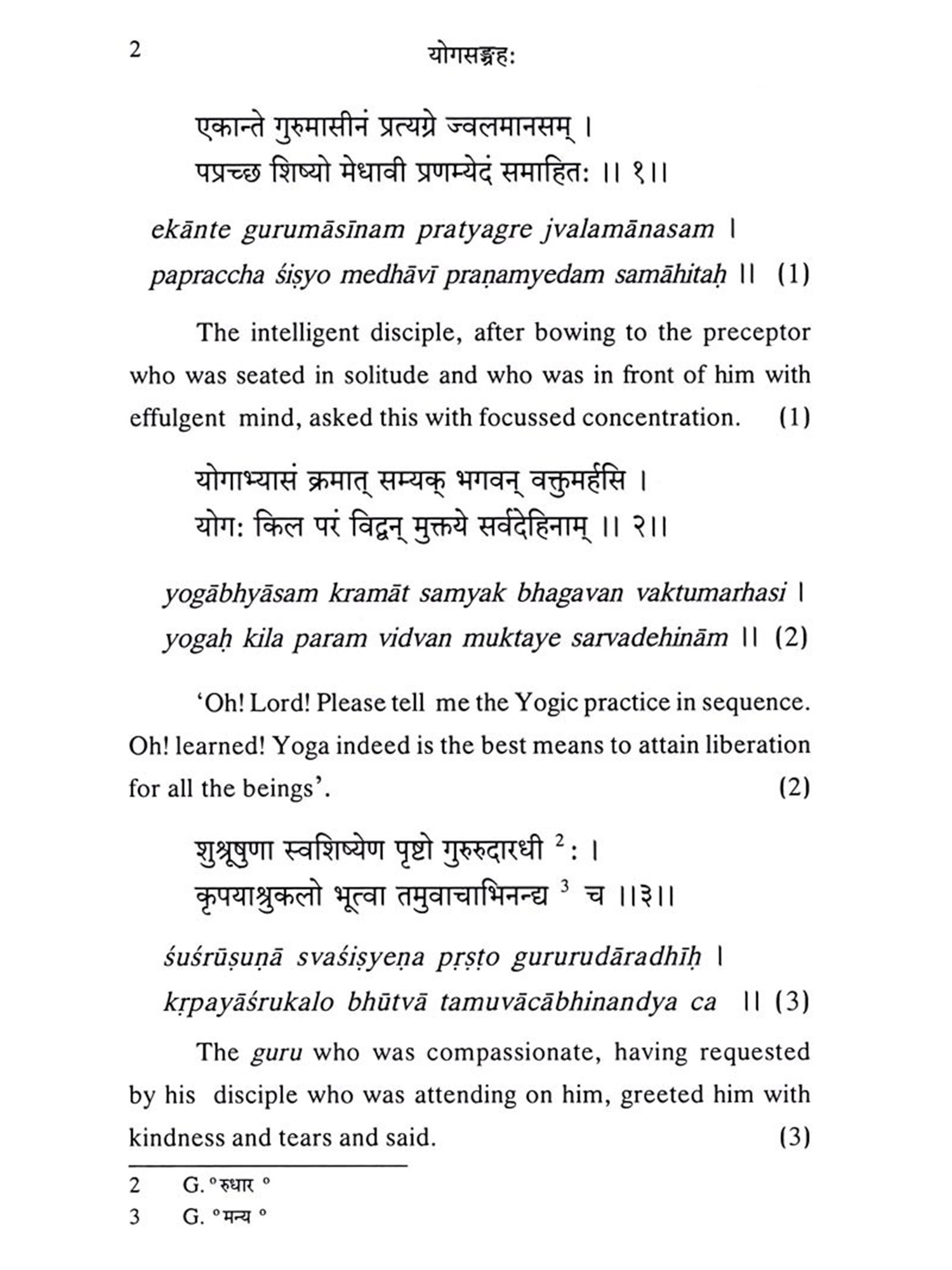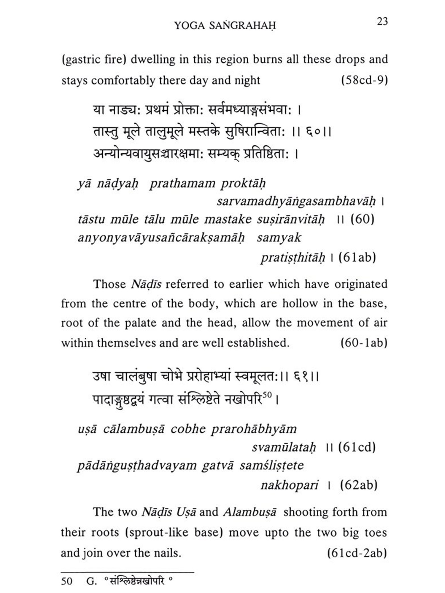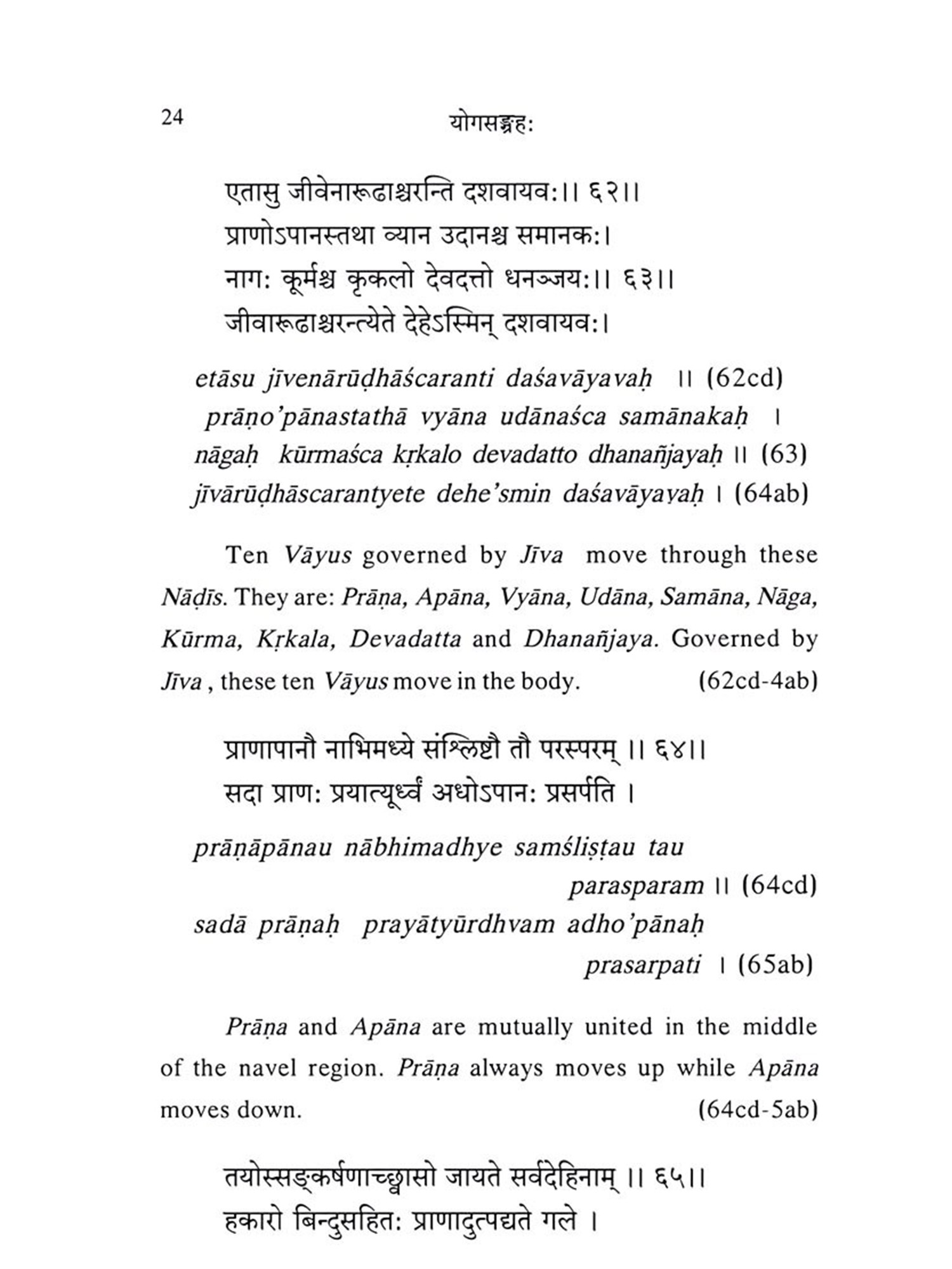 The word Yoga has become universal. People from different walks of life have realized the value of Yoga in their worldly and spiritual life. However, not many original books on Yoga are known to people, including scholars engaged in the study of Yoga and practitioners of Yoga. Some of the popular texts on Yoga are Yogasütras (YS) of Patanjali, Yoga Yājñavalkya (YY), Hatha Yoga Pradipika (HYP), of Svātmārāma, Śiva Samhitā (SS), Hatha Ratnavali (HR) of Śrīnivāsa Yogīndra, Yoga Upanisads and Gheranda Samhita (Gh.S). Few works of Goraksanātha like Amanaska Yoga, Yoga Bīja and Goraksa Samhita (GS) have also attracted the attention of scholars. These are only few in number compared to a vast number of unpublished texts on Yoga which lie scattered in many parts of India. Our Institute has taken up the task of bringing out critical edition of some rare and unpublished texts on Yoga. Yoga Sangraha (Y.San) is one such text, which is unique with regard to the content. As in the case of many texts on Yoga and Šäkta, the author of Y.Sań does not reveal any information about himself. This text in the form of the in struction by the Guru to his disciple. It is in Anustubh metre, It consists of 184 verses (GOML) excluding the first two verses in which prayer is offered to lord Ganesa and the Guru. Although Y.San contains details which are found in the texts on Hatha Yoga, it cannot be termed as a text belonging to this school. The treatment of Nadis, Asanas, Prānāyāma etc. differs from the descriptions given in the popular texts on Hatha Yoga. The description of Nadis, how the food is digested and the nutrients are taken to different parts of the body and the unwanted elements are eliminated are dealt with in this text, making it clear that the author of Y.San was well versed with Ayurveda.