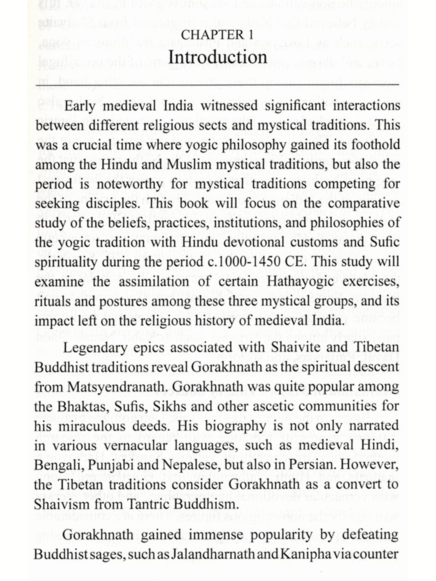 Yogic community is further divided into various sub-groups, such as Kaula Nathas, Vaishnavas, and Muslim yogis etc. This entire research is based on the said ascetic community, which has not only brought significant changes in redefining the notion of spirituality and mysticism in northern India, but how it affected its counterparts, such as Bhaktas and Sufis during the period from 11th to 15th centuries CE.