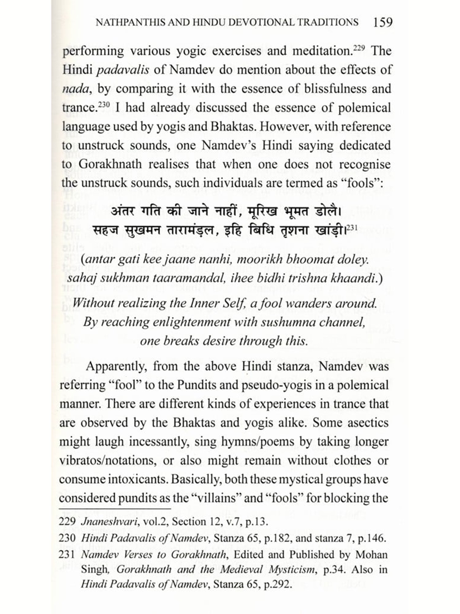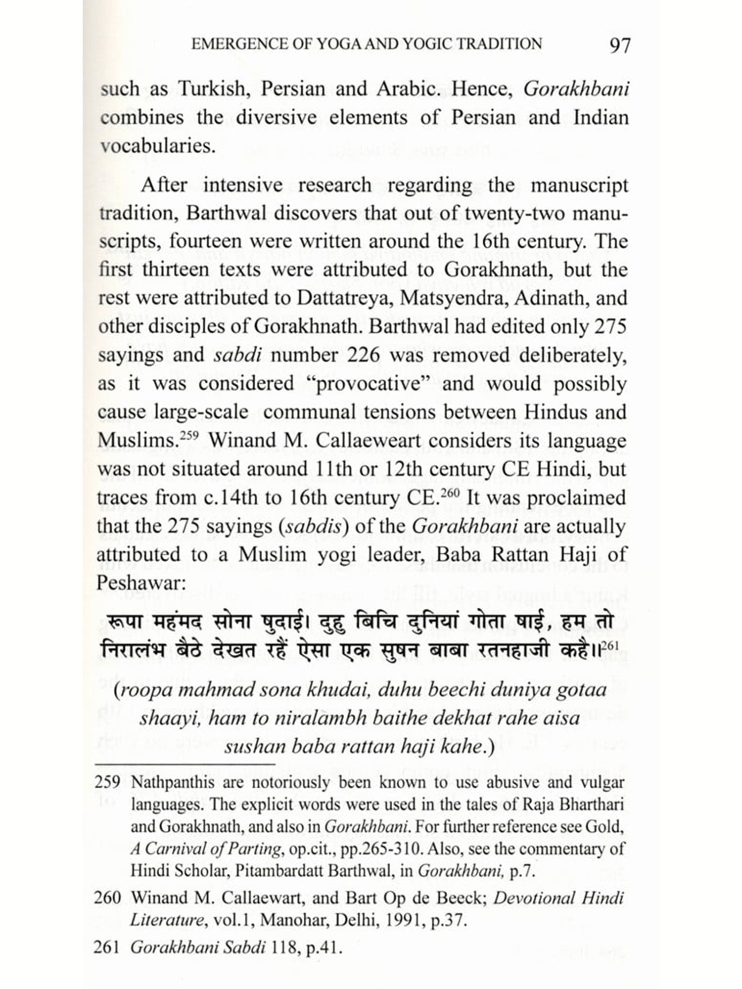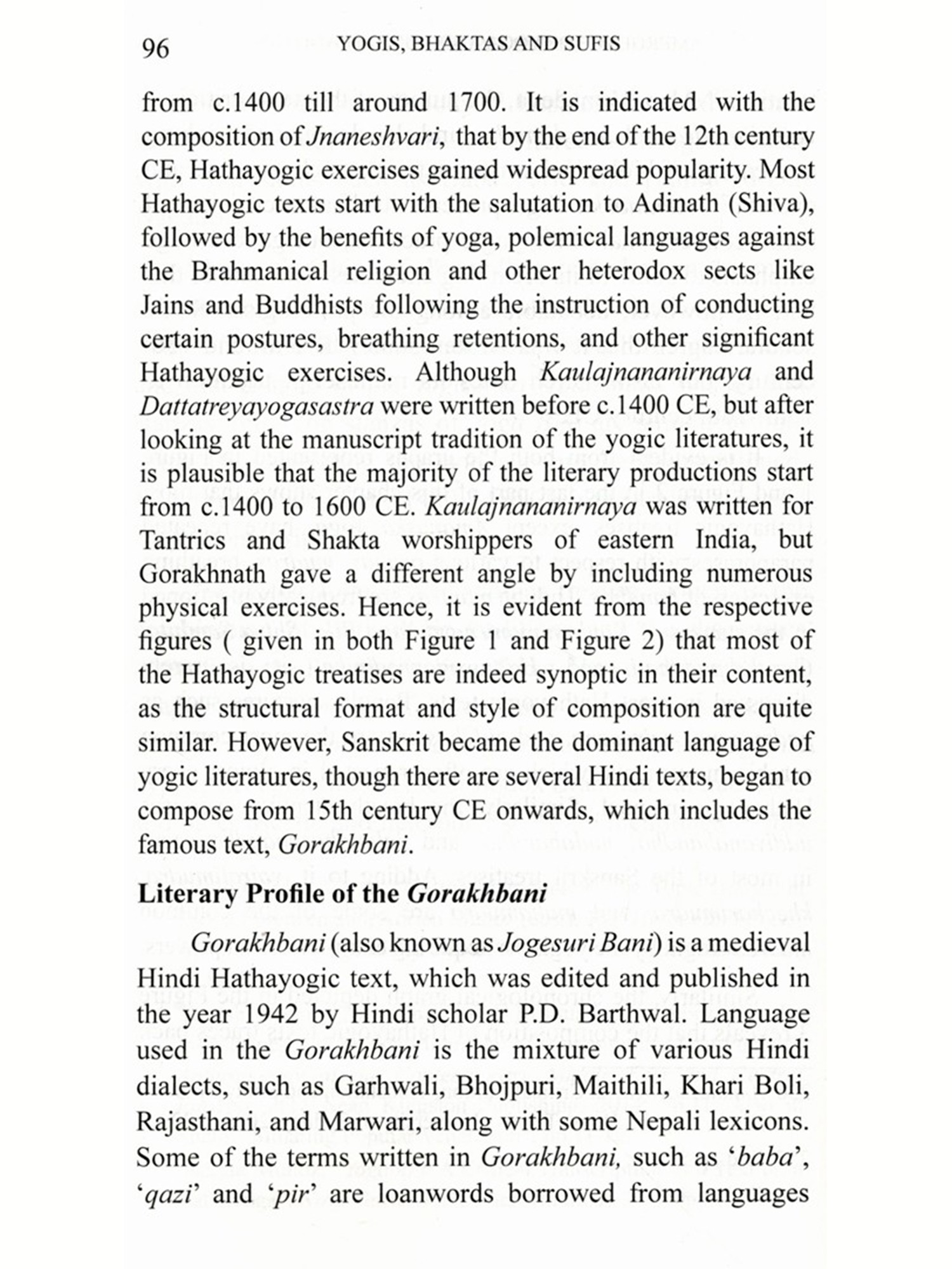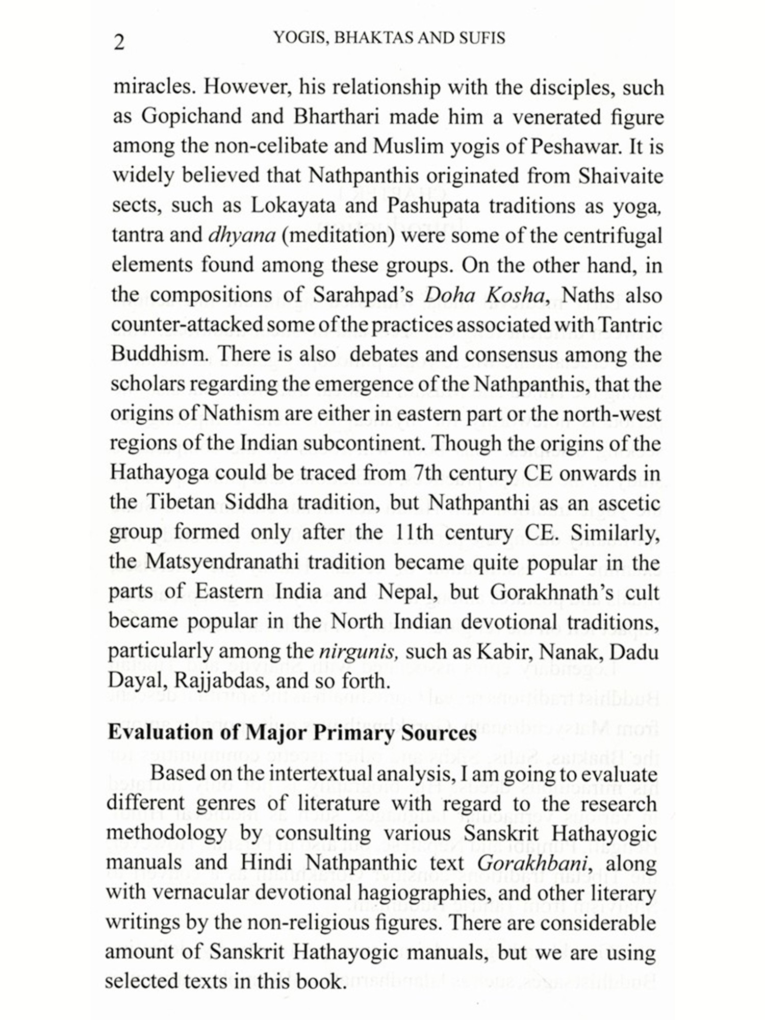 Many erudite and engaging scholars have substantiated in the area of my research. Examples include James Mallinson, David Gordon White, David Lorenzen, John Stratton Hawley, Simon Digby, Pitambar Datt Barthwal, Hazari Prasad Dwivedi, Christian Novetzke, Dominique Sila Khan, Carl Ernst, and more recently, Patton Burchett, Veronique Bouillier, and Monika Horstmann have contributed in the field of the Yogic, Bhakti, and Sufi studies, and enabled us to explore beyond the conventional historiographical trends in medieval Indian history among the Indian academic circles. Lest, not forget the nineteenth and twentieth-century British and Indian orientalists, who were known for their after contribution in translating the manuscripts and collected these folklores concerned with the early medieval saints and ascetics. In my book, I have translated the entire 275 sabdis of Gorakhbani, Gorakhbodh, 62 Gorakhbani pads, and other poems, Hindi sayings of Nathpanthis, Ramananda's Hindi compositions, Ramdev's compositions, and Abd-ul-Quddus Gangohi's Alakhbani. Also, I took assistance from Shukhdev Singh's translation whenever I got stuck in difficult terminologies mentioned in the Gorakhbani's sabdis. Translations and transliterations have been given to tailor the needs of readers.
