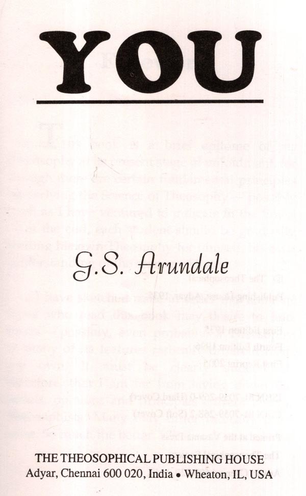 THIS book is a brief epitome of my Theosophy at its present stage of unfoldment, for though there are certain fundamental principles underlying the Science of Theosophy - possibly such as I have ventured to indicate in the Envoi at the end, each student should be gradually finding his own Theosophy for himself, his own understanding of the science of living.