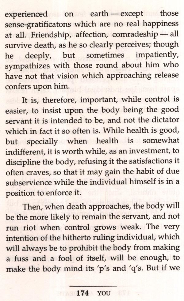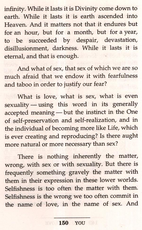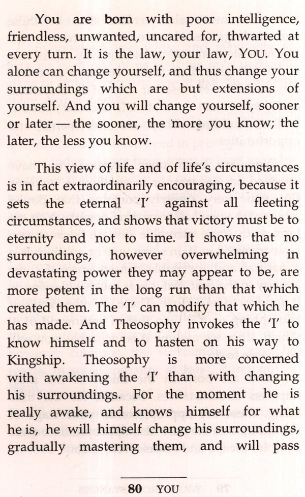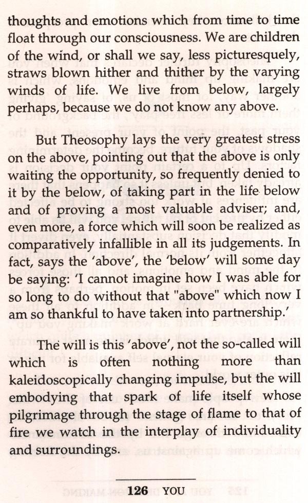 I have sketched mine in order that some of those who read this book may desire to find theirs possibly, even probably, a Theosophy in many of its features radically different from my own. It must be clearly understood, therefore, that I am far from laying down the beliefs, opinions and principles current among Theosophists. Many may differ radically from mine. So much the better. What each needs is his own, individually reached Theosophy, not somebody else's. My hope is that I have whetted the appetite of my readers for Theosophy, for the simple reason that I am so restlessly and discontentedly happy in mine, ever-changing as it fortunately is, ever growing, I hope, more closely resembling the Theosophy which is the eternal Science of Life.