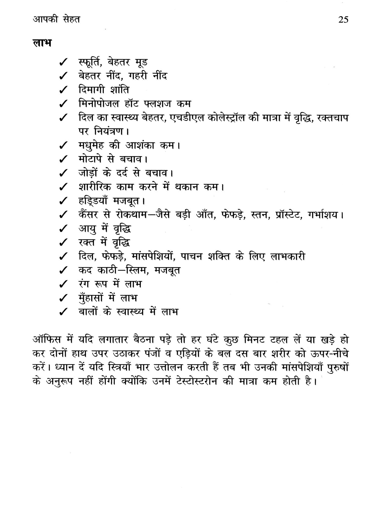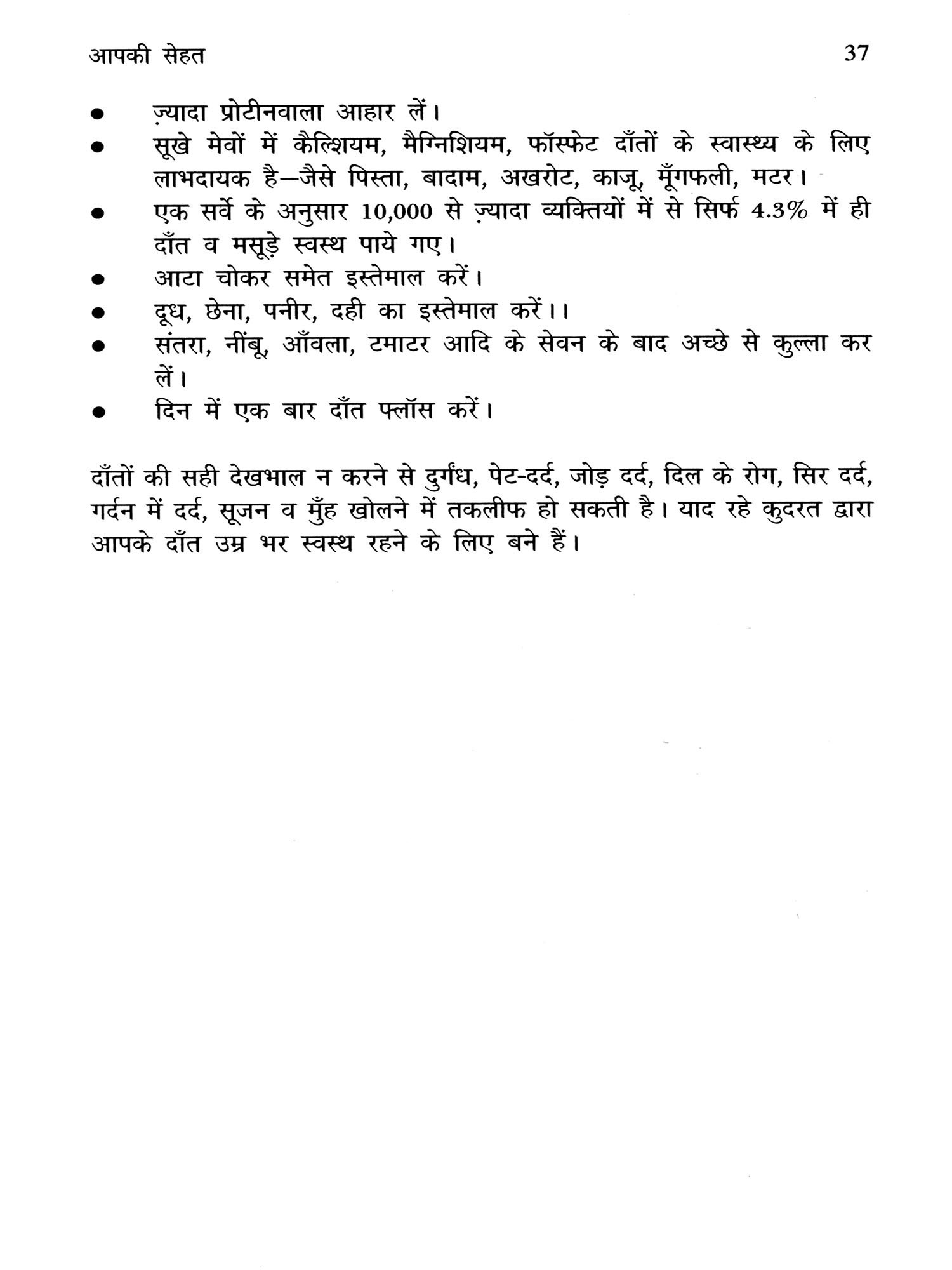 इस पुस्तक में मैने स्वास्थ्य संबंधी संपूर्ण जानकारी देने का प्रयास किया है जैसे हमारे शरीर की संरचना, कार्यप्रणाली, शिशु का विकास व अन्य शारीरिक व मानसिक मापदंड आयु अनुसार, दाँतों का निकलना, रोगों से बचाव के टीके, किशोर किशोरियों में आयु अनुसार बदलाव, प्रजनन ज्ञान, सेक्स ज्ञान जिसके प्रति हम भारतीयों में बहुत अज्ञानता व भ्रांतियाँ हैं। इसके अतिरिक्त हमारी दिनचर्या, नियमित व्यायाम, व्यक्तिगत साफ-सफाई, नियमित मेडिकल जाँच का महत्व, शरीर के विभिन्न अंगों की देखभाल आदि शामिल हैं। आम रोगों से पीड़ित होने की स्थिति में प्रमुख जाँच का महत्व, विभिन्न रोगों के कारण, लक्षण, बचाव व उपचार भी बताये गए हैं। उपचार शैली में एलोपैथी के अलावा अन्य चिकित्सा प्रणालियों जैसे आयुर्वेद, घरेलू नुस्खों आदि का भी जिक्र किया गया है। भारतीयों में कद के अनुसार वजन, खानपान को लेकर खाद्य पदार्थों में तत्व व उनके गुण, कैलोरी वैल्यू आदि की जानकारी दी गई है। साथ में पर्याप्त चित्रों के माध्यम से समुचित जानकारी देने का प्रयास किया गया है। विभिन्न आपातकालीन स्थितियों जैसे दिल, दिमाग का दौरा, हड्डी टूटना, सिर में चोट, बिजली का झटका, जलना, डूबना, जहर, तेज बुखार आदि में अपने स्तर पर एक आम आदमी क्या कर सकता है, जानकारी दी गई है। स्वास्थ्य संबंधी तकनीकी शब्दावली भी पुस्तक में दी गई है। मुझे आशा है की यह पुस्तक हर वर्ग व आयु के व्यक्ति के लिए उपयोगी सिद्ध होगी। आपकी प्रतिक्रियाओं का स्वागत है।