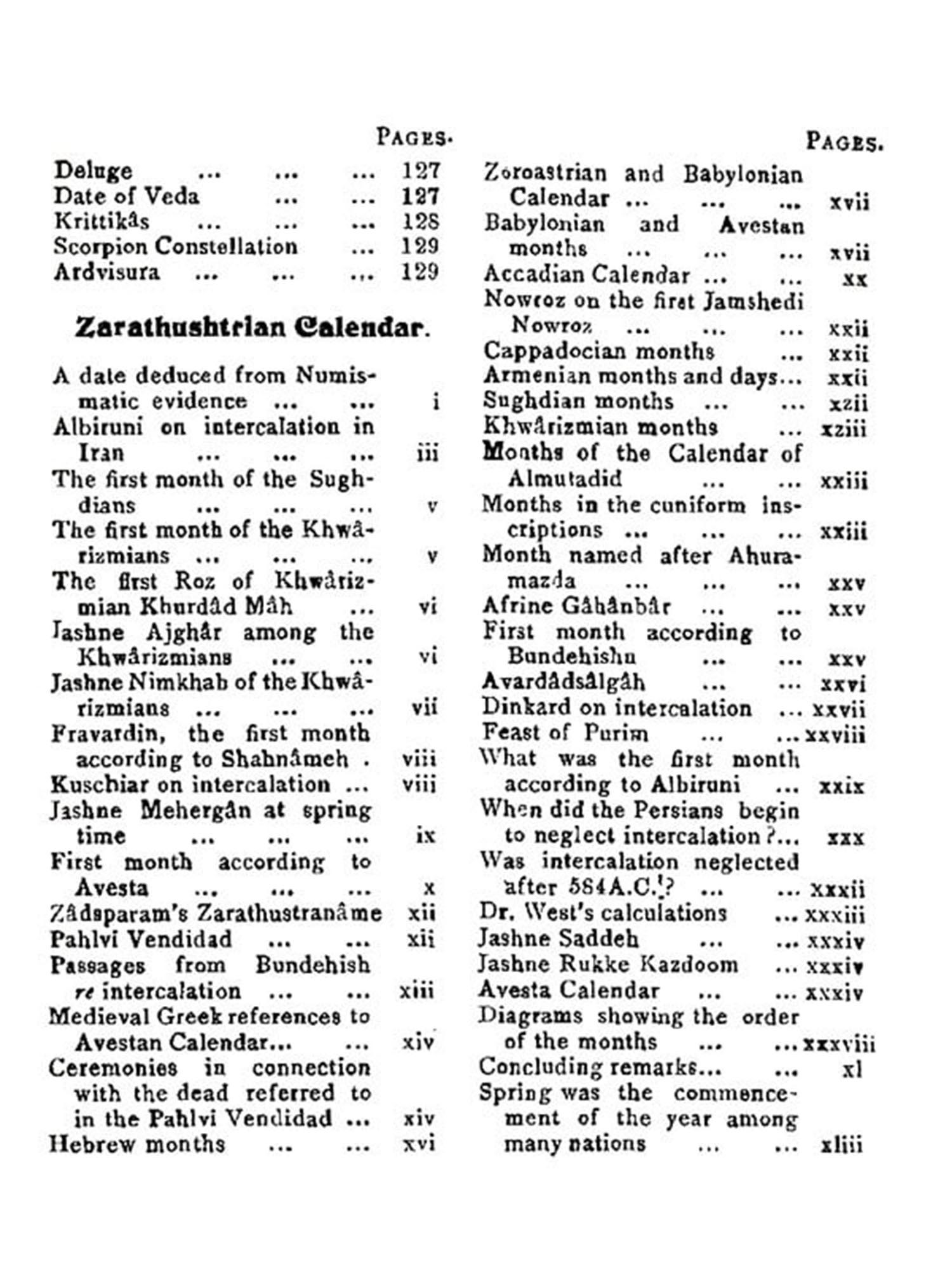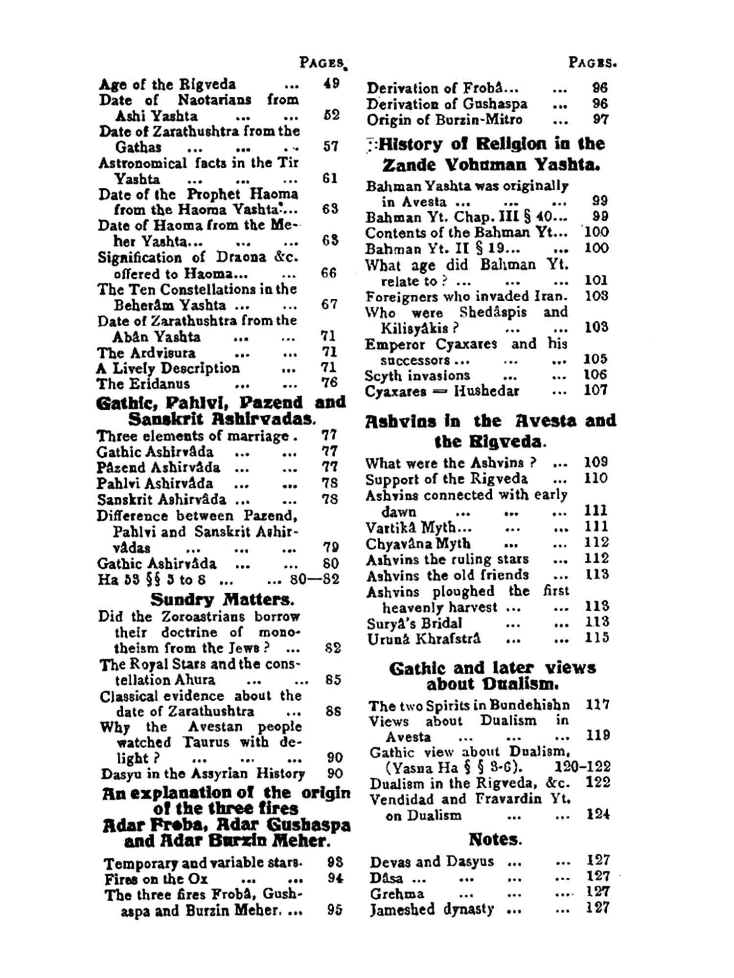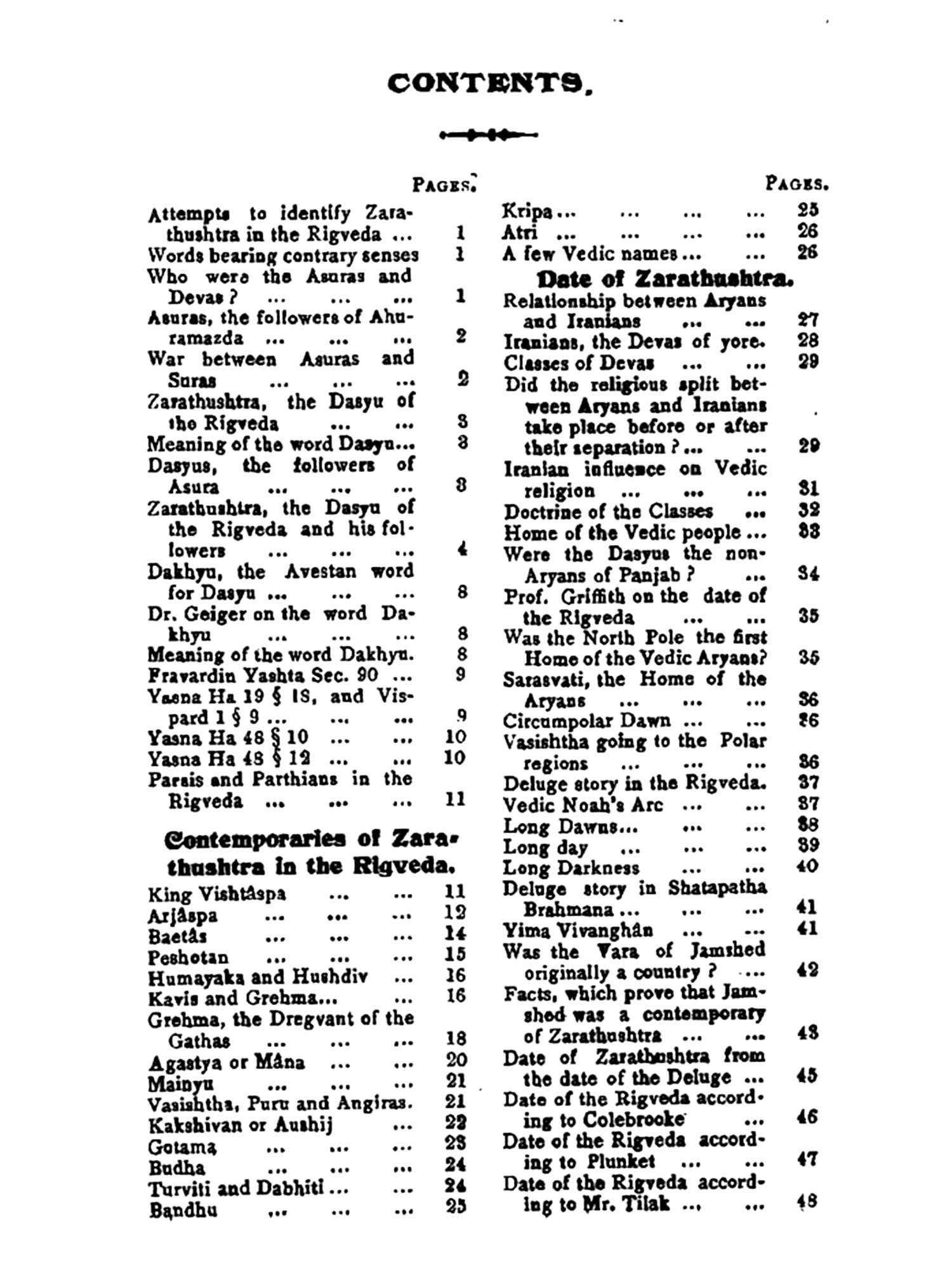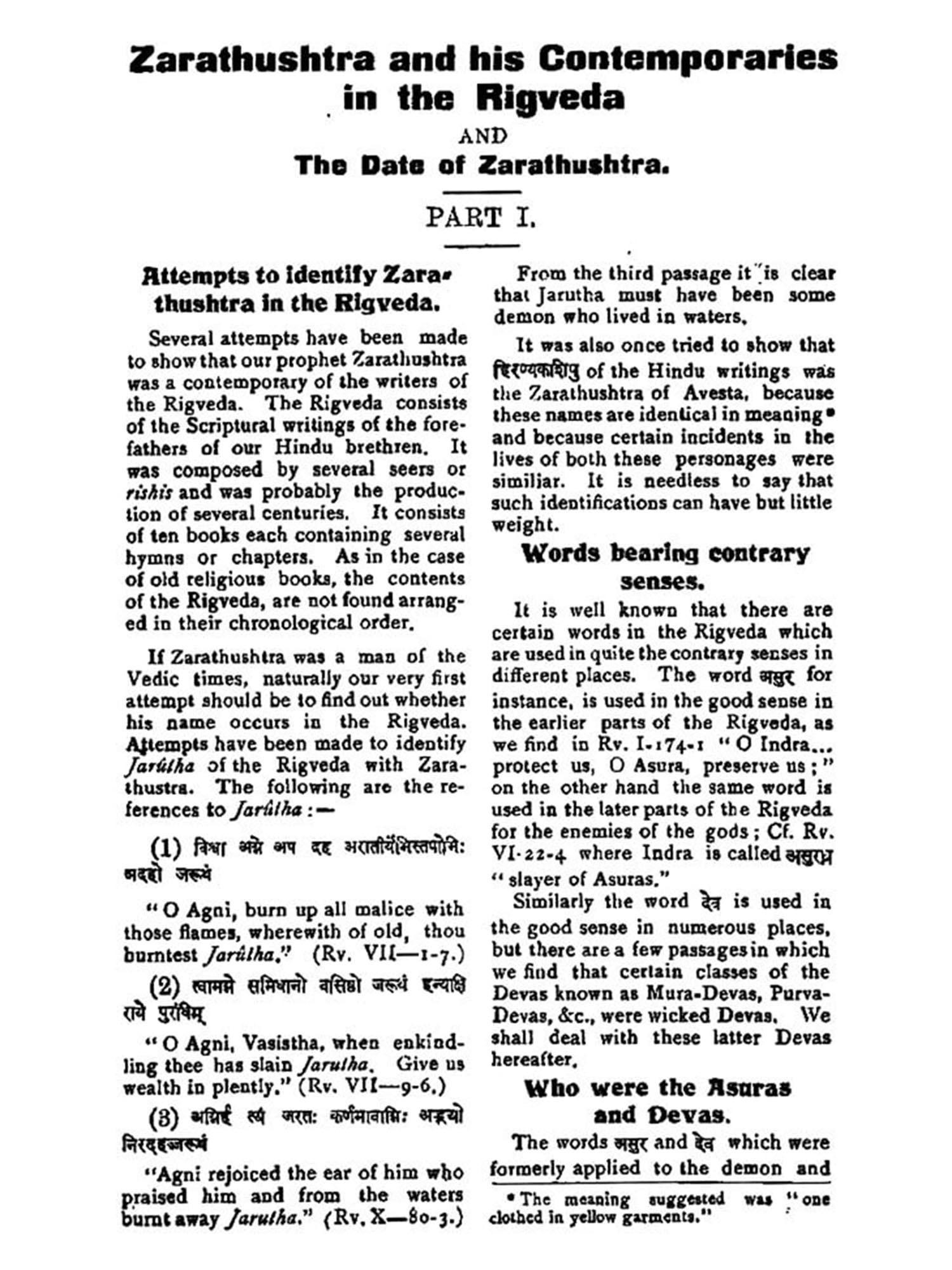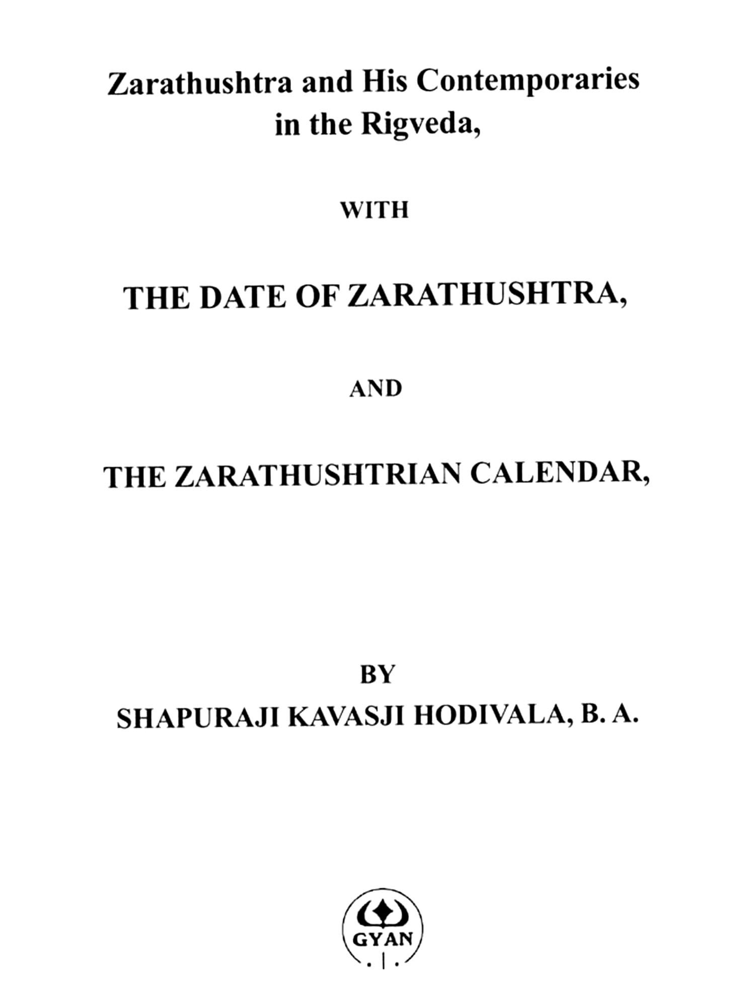 It was at first my intention to publish, in the form of a book, my Papers on "Zarathustra," "His Contemporaries in the Rigveda," and "The Date of Zarathushtra," which I had read before the Society for the Promotion of Researches into the Zoroastrian Religion and the Gatha Society of Bombay in several of their meetings. Subsequently I made up my mind to include also my Paper on the "Zarathustrian Calendar, which I had read before the said Research Society in Gujarati. It has been truly said that "the Veda is a book of seven seals." This remark applies with equal force to the sister of the Vedic language, namely, the Avesta. Prof. Max Muller rightly observes that "the language of the New Testament is child's play compared to the Vedic Sanskrit and Avestic Zand." Some years' careful study of the Rigveda and the Hindu Scriptures on the one hand and of the Avesta and the allied literatures on the other, brought forth prominently before the mind of the present writer certain conclusions, which have not been so far touched by other writers, and which have been summarised as briefly as possible in the following pages. There is not the shadow of a doubt that in the distant past the Vedic and the Iranian people were living together as one nation known as the Aryans. Prof. Max-Muller in his Science of Mythology (p. 160) says: "We may go a step further and prove from such equations as Sanskrit dáta vasunám, Zend data vohunam and Greek doter taon, 'giver of good gifts' applied to the Devas, that such whole phrases even had been formed by the Aryans in their undivided state and had been preserved as historical heirlooms from generation to generation...... If some critics look incredulous at such equations as vasunám and eaon, I am afraid, we can-not help their unbelief. Here, also, if people wish to live, they must learn." In another place the same writer says: "We know, that there was a time, when the Aryas of India and Persia were not yet separated, and we have historical remains of that period in what the Veda and Avesta share in common, whether in language, in religion, ceremonial or mythology. In that period the old name of God, Asura, must have been the recognised name for Gods, (Ahura-Asura, being the principal element in the name of the supreme deity Ahuro-mazdão), while Deva was not used at all as a name of God or Gods." "Then again, before that Indo-Iranian period there was that equally real period, which preceded the Aryan Separation, and which has its history in the annals of words, common to the two great divisions of that family the Southern and the Northern." Then came the Indo-Iranian Separation, which was the result of religious schism. The Vedic and the Avestic people, who were once bro-thers, became enemies. The latter called the former Devas and Drujas, while the former on their part called the latter Asuras and Dasyus.