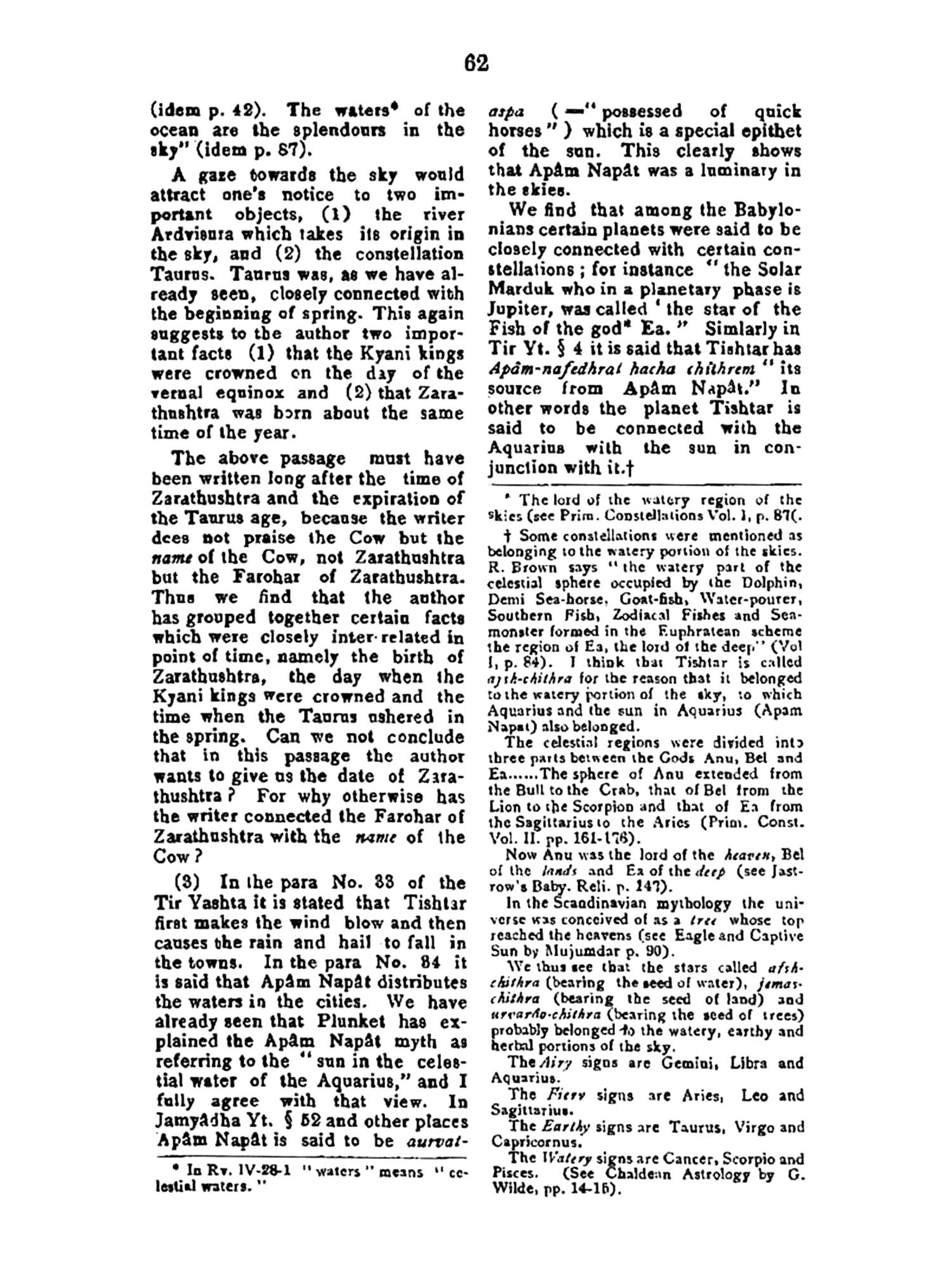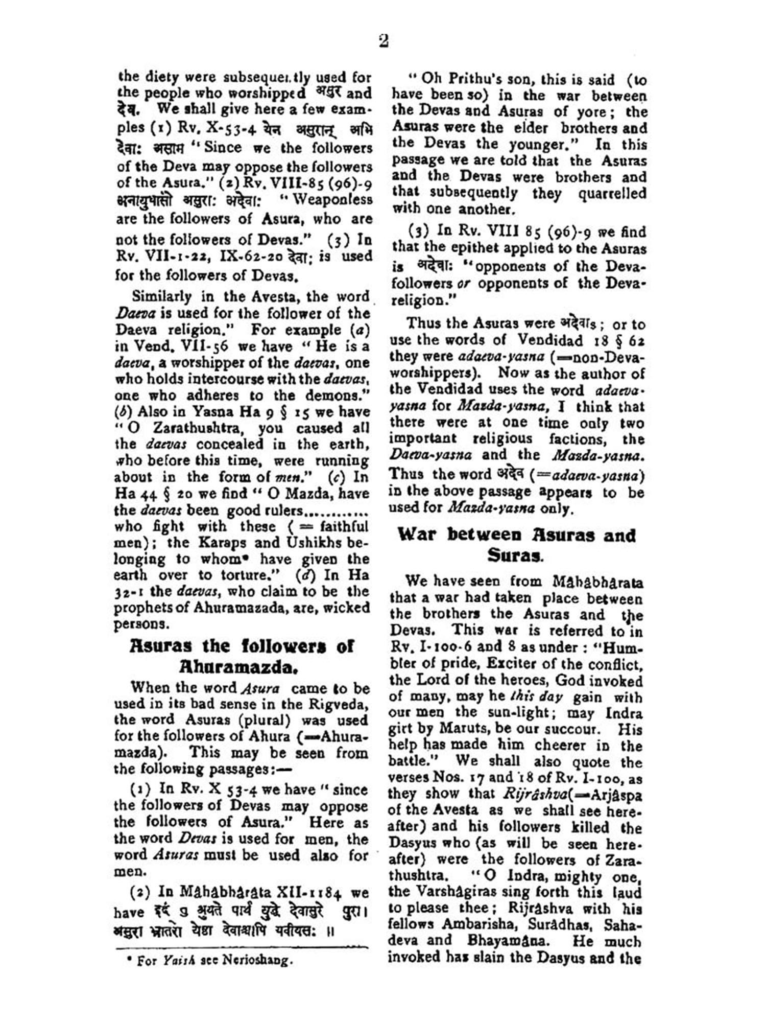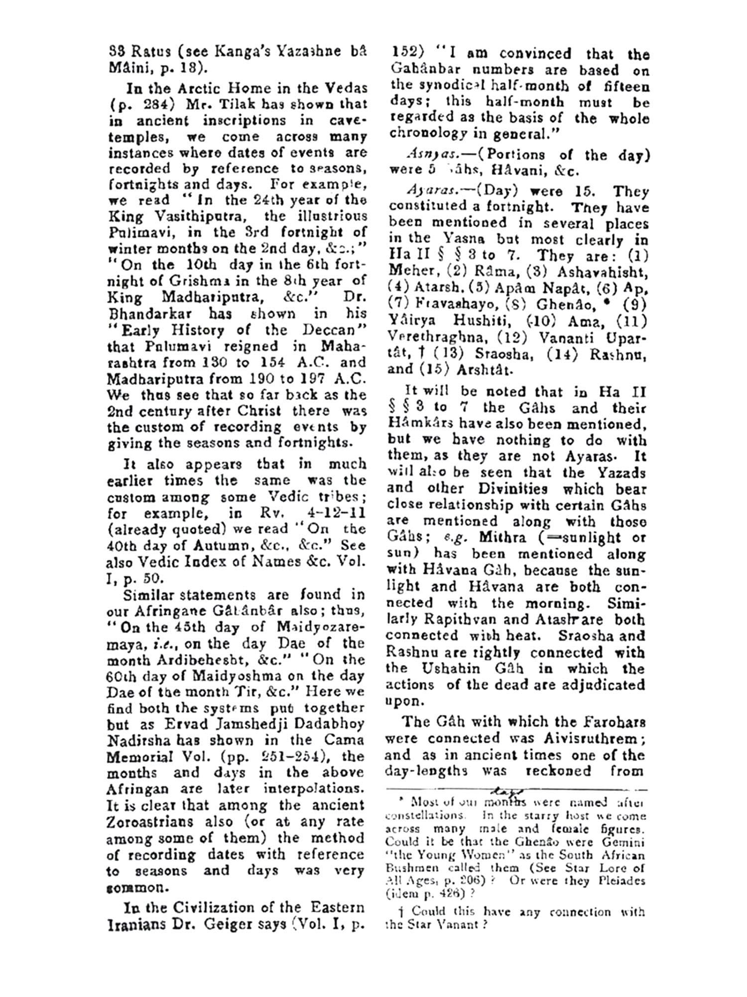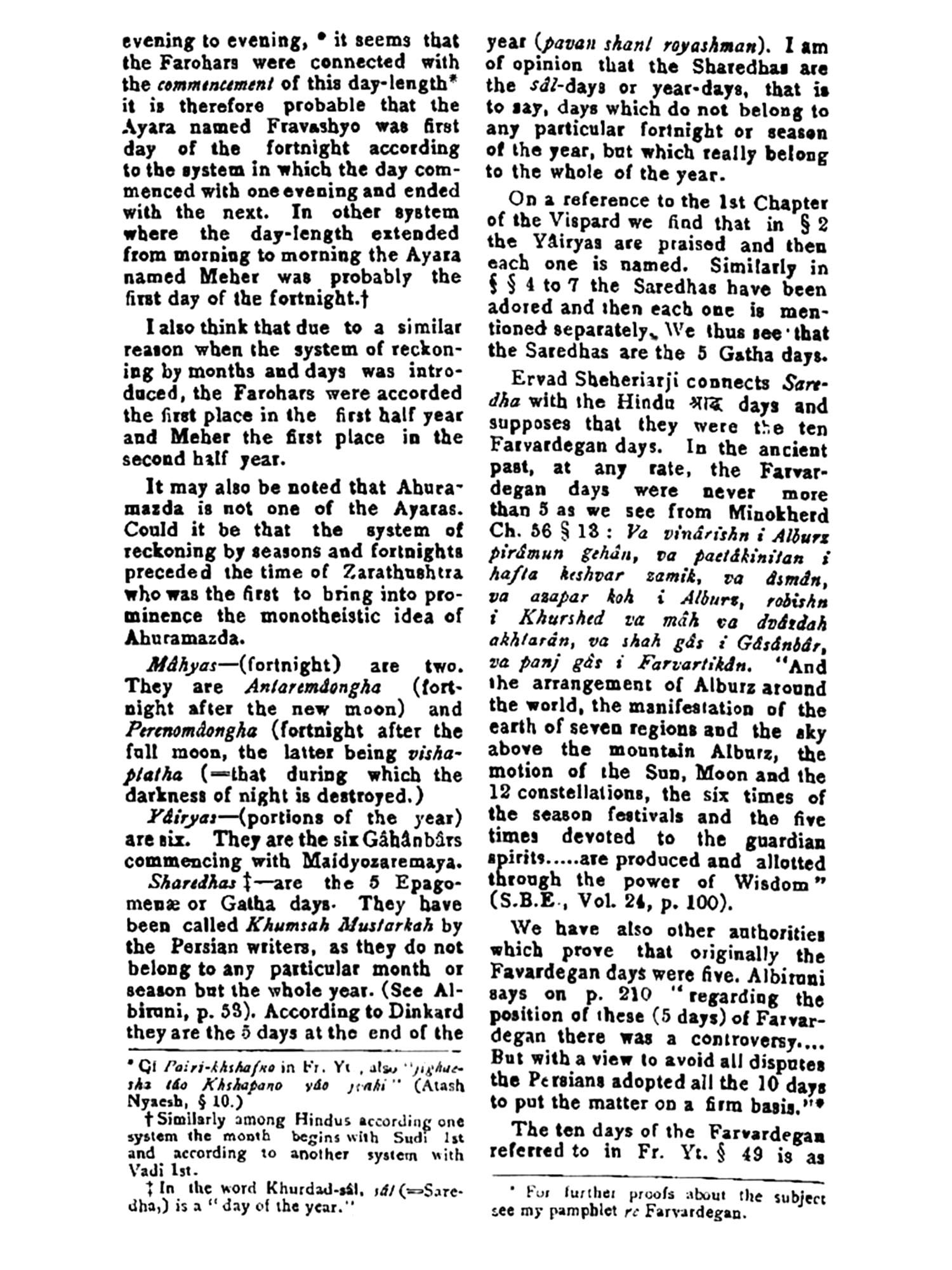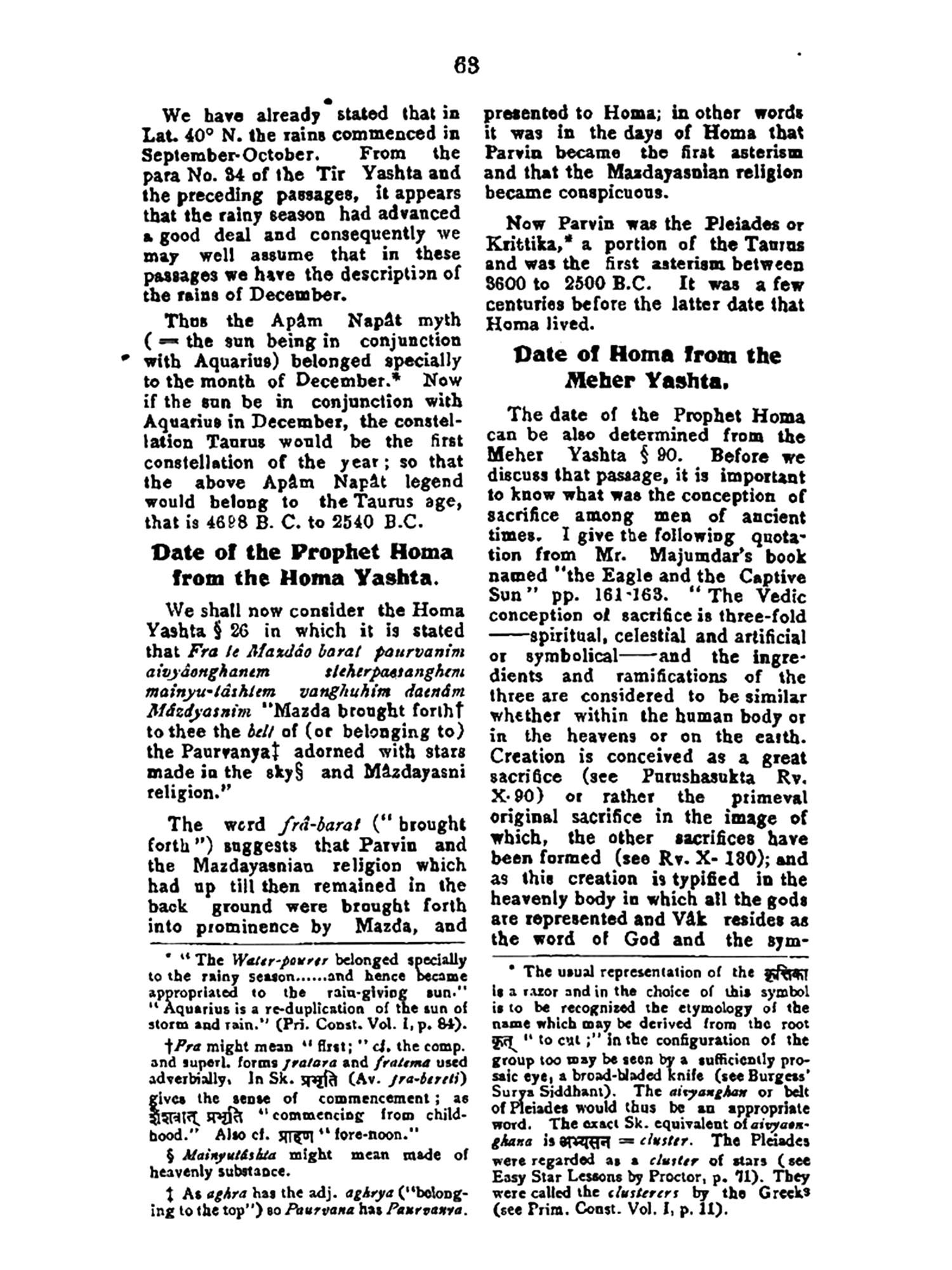 It was at first my intention to publish, in the form of a book, my Papers on "Zarathustra," "His Contemporaries in the Rigveda," and "The Date of Zarathushtra," which I had read before the Society for the Promotion of Researches into the Zoroastrian Religion and the Gatha Society of Bombay in several of their meetings. Subsequently I made up my mind to include also my Paper on the "Zarathustrian Calendar, which I had read before the said Research Society in Gujarati. It has been truly said that "the Veda is a book of seven seals." This remark applies with equal force to the sister of the Vedic language, namely, the Avesta. Prof. Max Muller rightly observes that "the language of the New Testament is child's play compared to the Vedic Sanskrit and Avestic Zand." Some years' careful study of the Rigveda and the Hindu Scriptures on the one hand and of the Avesta and the allied literatures on the other, brought forth prominently before the mind of the present writer certain conclusions, which have not been so far touched by other writers, and which have been summarised as briefly as possible in the following pages. There is not the shadow of a doubt that in the distant past the Vedic and the Iranian people were living together as one nation known as the Aryans. Prof. Max-Muller in his Science of Mythology (p. 160) says: "We may go a step further and prove from such equations as Sanskrit dáta vasunám, Zend data vohunam and Greek doter taon, 'giver of good gifts' applied to the Devas, that such whole phrases even had been formed by the Aryans in their undivided state and had been preserved as historical heirlooms from generation to generation...... If some critics look incredulous at such equations as vasunám and eaon, I am afraid, we can-not help their unbelief. Here, also, if people wish to live, they must learn." In another place the same writer says: "We know, that there was a time, when the Aryas of India and Persia were not yet separated, and we have historical remains of that period in what the Veda and Avesta share in common, whether in language, in religion, ceremonial or mythology. In that period the old name of God, Asura, must have been the recognised name for Gods, (Ahura-Asura, being the principal element in the name of the supreme deity Ahuro-mazdão), while Deva was not used at all as a name of God or Gods." "Then again, before that Indo-Iranian period there was that equally real period, which preceded the Aryan Separation, and which has its history in the annals of words, common to the two great divisions of that family the Southern and the Northern." Then came the Indo-Iranian Separation, which was the result of religious schism. The Vedic and the Avestic people, who were once bro-thers, became enemies. The latter called the former Devas and Drujas, while the former on their part called the latter Asuras and Dasyus.