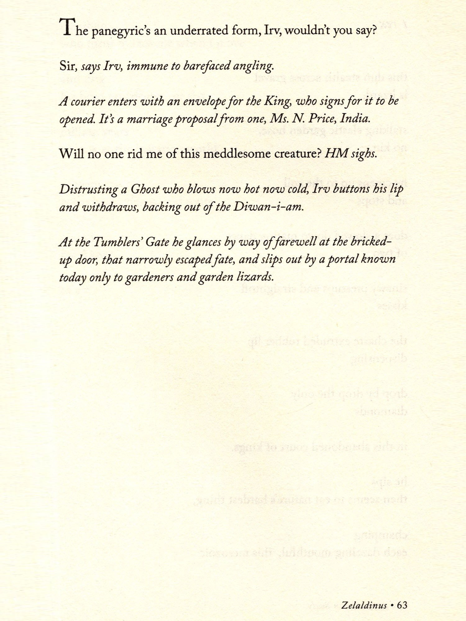 On a camel's back hill beyond Agra stands a redstone citadel altogether different from the white marble Taj Mahal. Fatehpur Sikri is the capital Akbar built to honour the saint who foretold the birth of his first son. In the inner court of the king's palace is a broad stone terrace with a chequered pattern that resembles a game board. Here, accounts say. Akbar played a kind of chess using human preces from his harem of three hundred. Costumed in various guises. ises, his women would have presented lively masques upon this stage. Zelaldinus mounts such a pageant, glittering and fantastical, where past and present, nobles and commoners, history and fiction rub shoulders. Its variety of verse and prose forms evoke the carnival spirit of a masque. Underlying the depiction of a rich and varied court life at Sikri are reflections on kingship. a meditation on fathers and sons, and a plot within a plot that tells a crackling story of love across the Pakistan border-while through it all strides the nimble ghost of Akbar himself.
