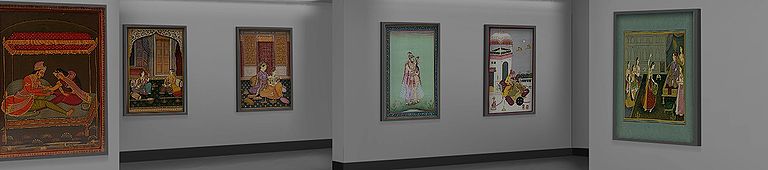 Included in the collection are the paintings depicting the royalties sitting in a gesture of love. The gracious room exemplifies the passion within their hearts and invokes a feeling of loving exchange. Other artworks display the Mughal prince tied with a cloth around his eyes sporting with the harem inmates on the terrace. The backdrop of the terrace shows lush flora featuring a blossoming setting.