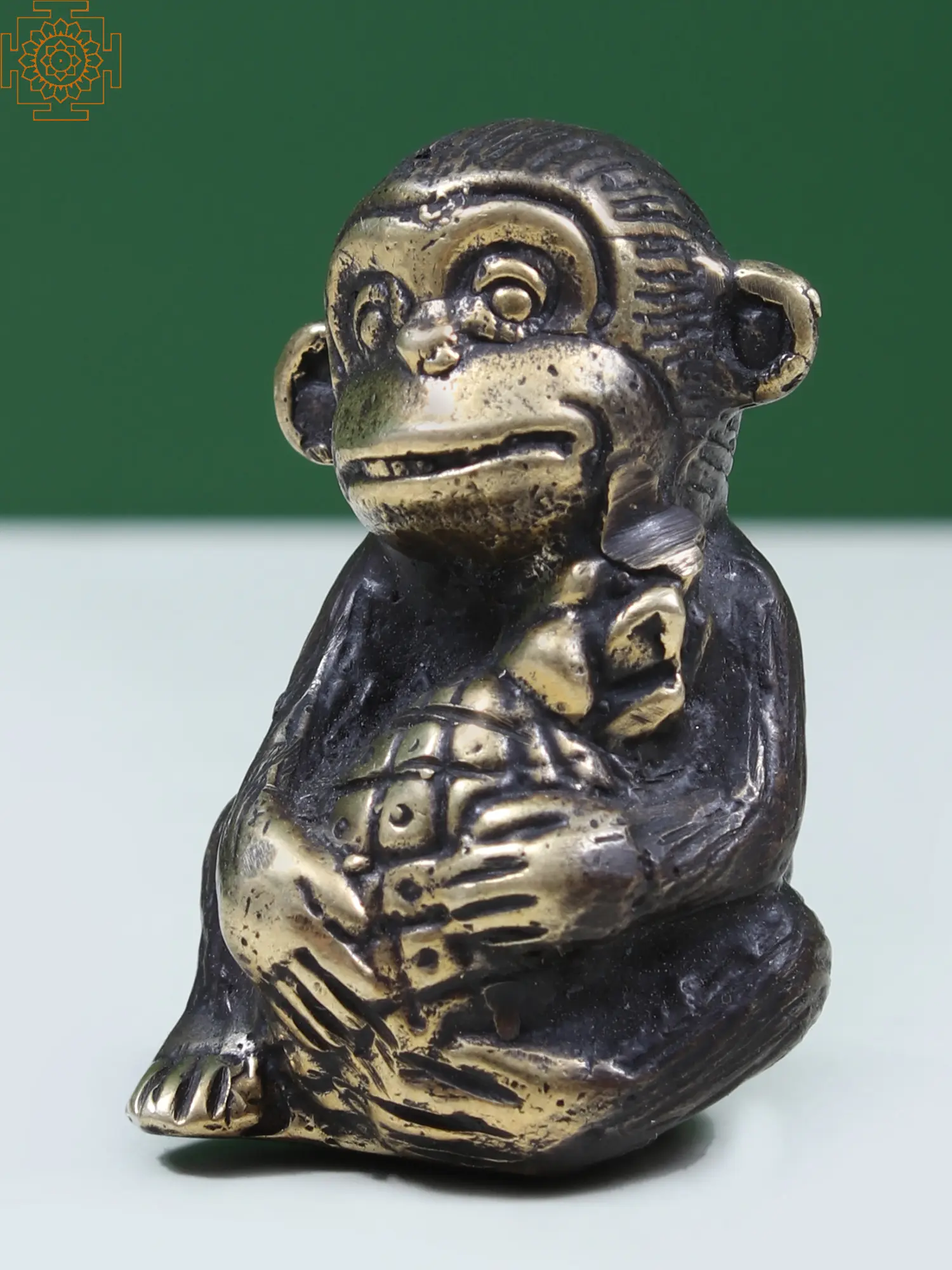 Monkeys are subject of devotion for Hindus. They are the mischief-makers and are famous for their tricks and plays. This Brass Figurine of Small Baby Monkey Holding a Pineapple on Head is a delightful embodiment of playful charm and creativity of the Vanar (monkey). Here the small monkey is seen holding a pineapple dearly and smiles while doing so. This perspective is so cute that it's almost impossible not to hug the brass statue, which appears to be a live monkey.