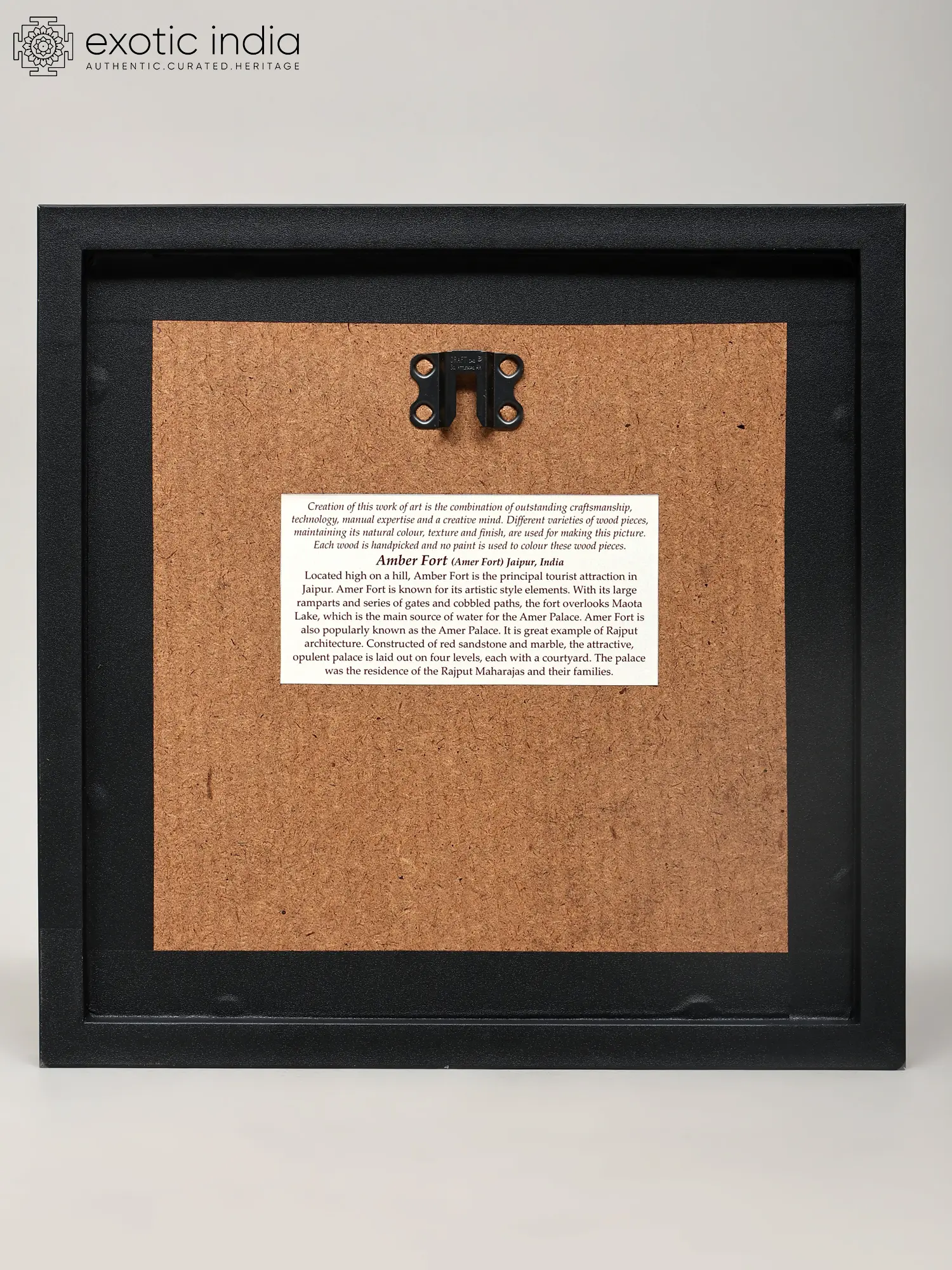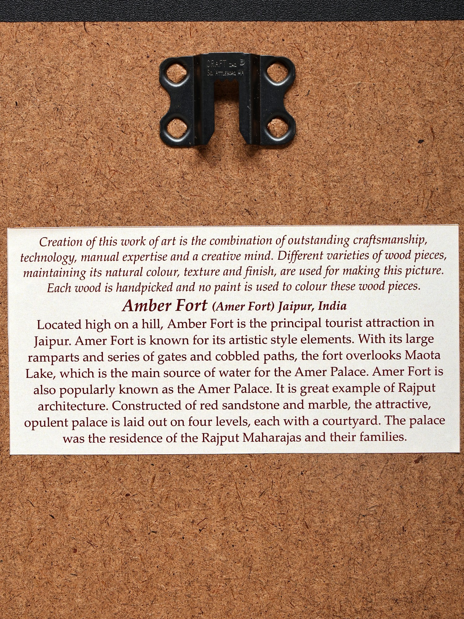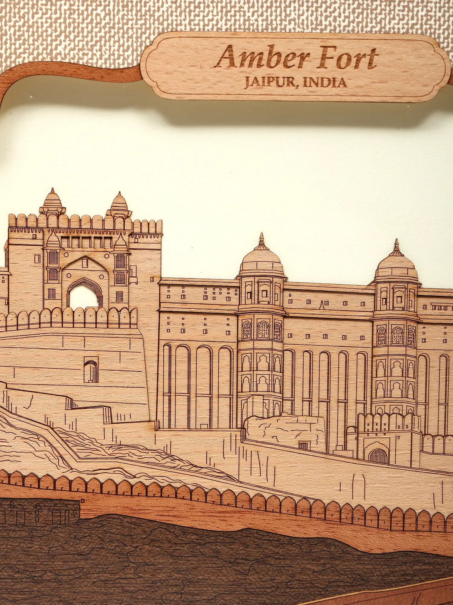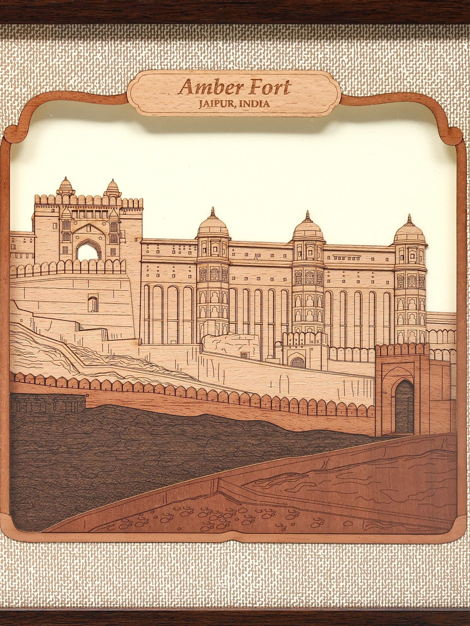 Bring the grandeur of Rajasthan into your home with this exquisite wooden carving depicting the majestic Amber Fort. This intricately crafted piece captures the essence of one of India's most iconic architectural marvels, a UNESCO World Heritage site that stands as a testament to Rajput and Mughal architecture. The artwork showcases the fort's sprawling ramparts, its formidable gateways, and the elegant domes that crown its structures, all rendered with remarkable detail. The skilled artisans have masterfully employed different shades and textures of wood to create a sense of depth and realism, making the fort appear to rise from the backdrop.