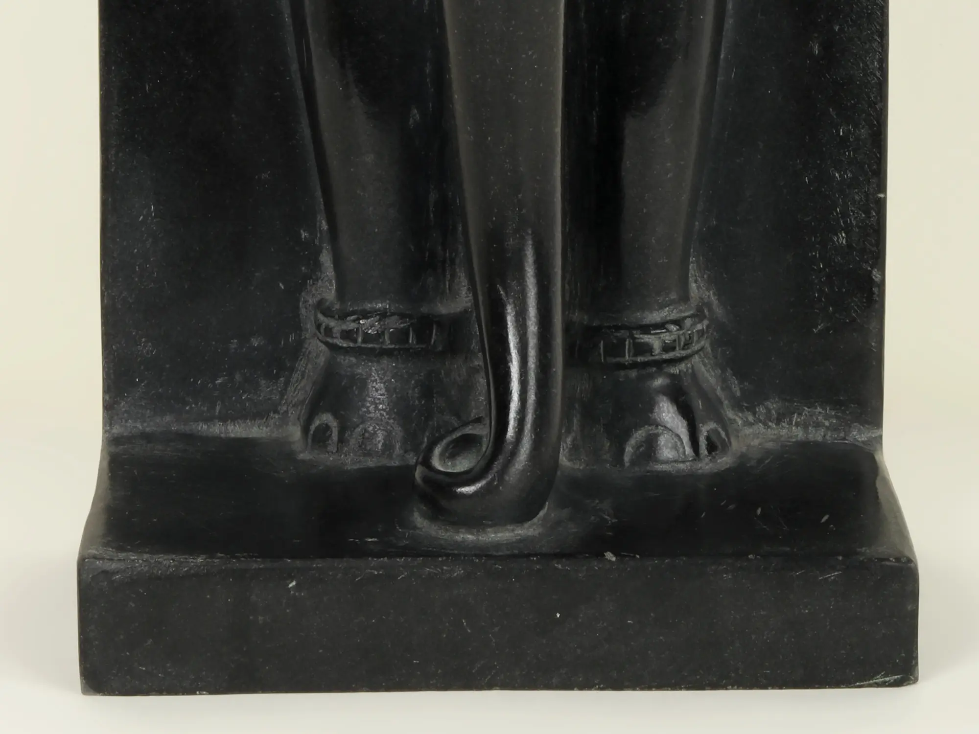 Standing, half-sculpted, as if emerging from the black marble piece, this elephant statue is an aid memoir to the classic Dhauli elephant, one of India's earliest monolithic, rock-cut sculptures. Like the Dhauli elephant, this majestic black marble elephant too has its head, trunk, and front legs visible. A grandeur and dynamism are expressed in the stance of the elephant, an animal synonymous in Indian culture with royalty, prowess, and wisdom. The softness in the eyes of the animal, the graceful flow of its trunk and the formidable strength of its legs amplify the splendor of this artwork, making it a masterclass piece of decor to bring regalia of ancient Indian art into your home.