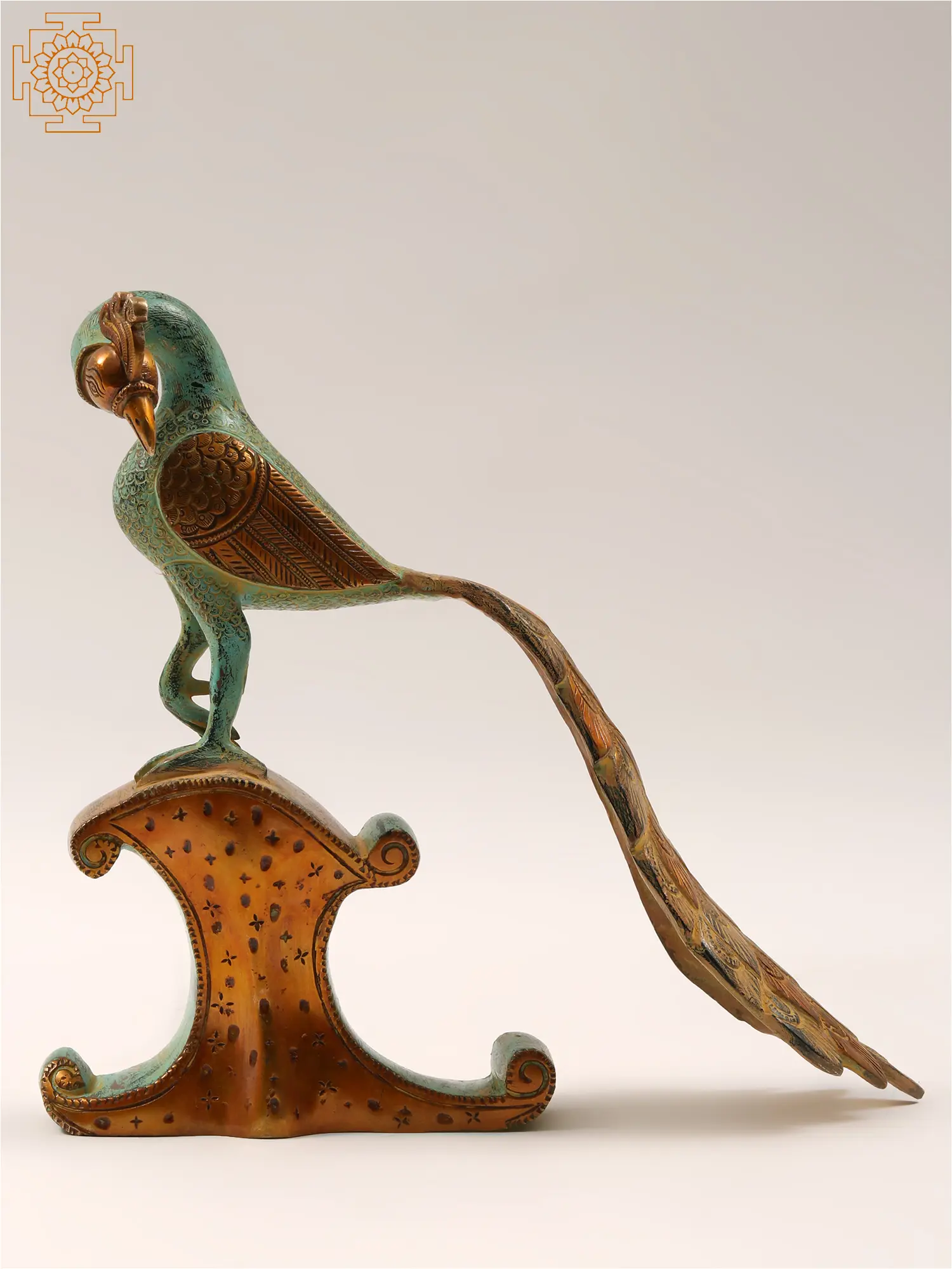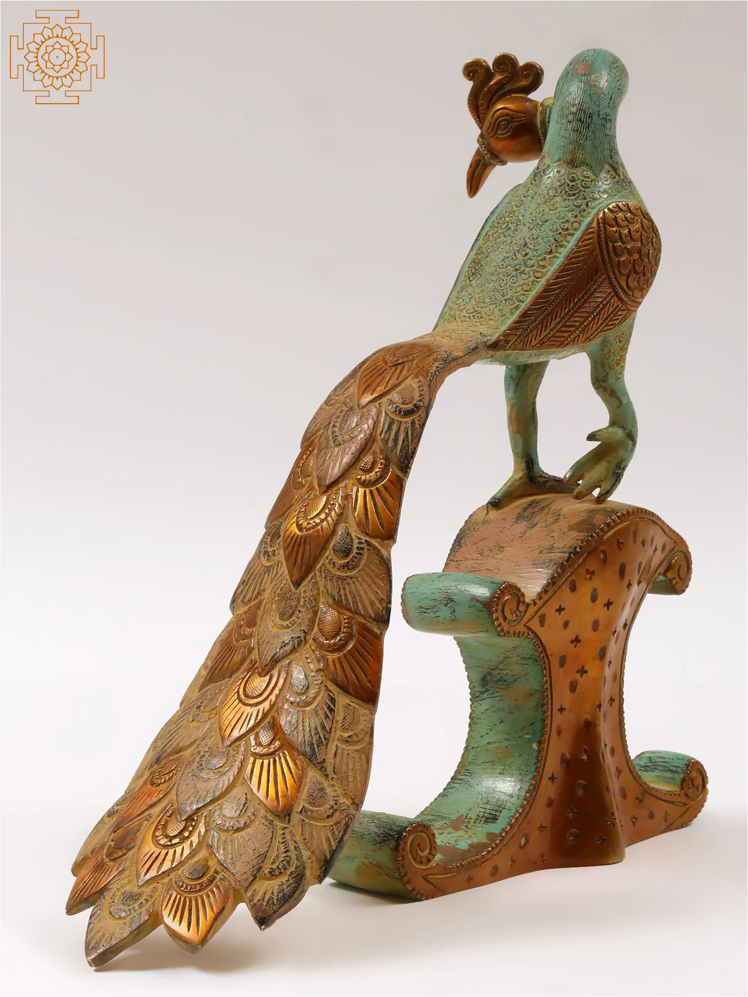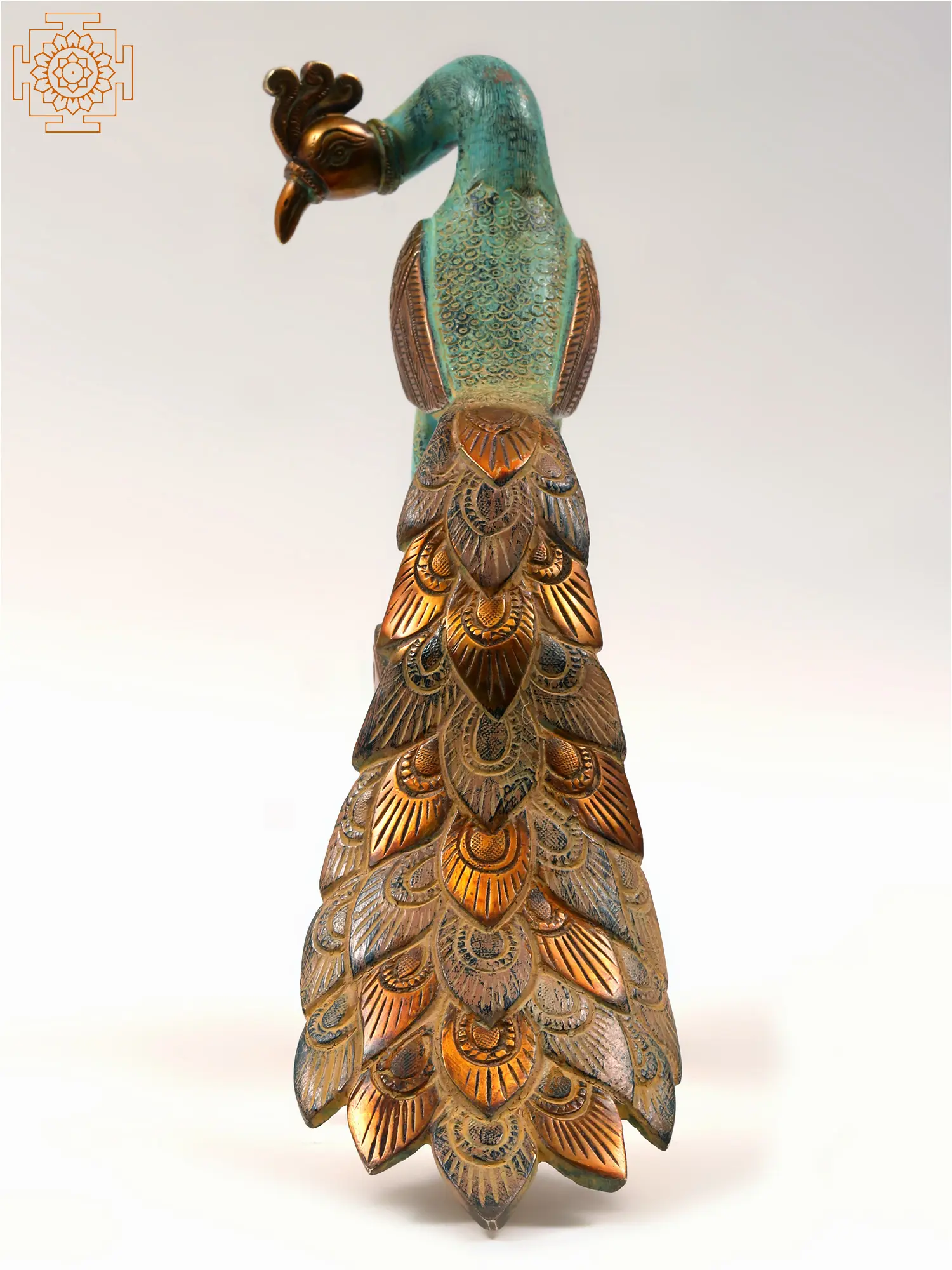 Painstakingly crafted from brass, this masterpiece captures the regal allure of the majestic peacock in its full splendour.  Its iridescent feathers shimmer with a captivating play of colours, reflecting the essence of opulence and beauty.