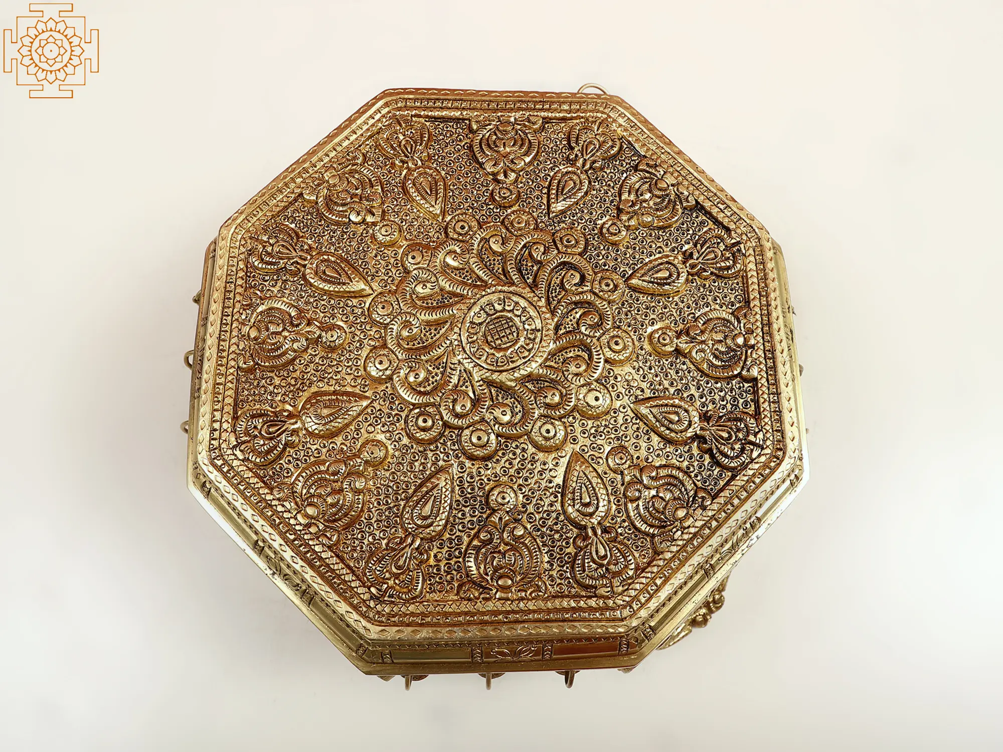 This “Designer Chowki,” embellished with fascinating floral carvings and beautiful ghungroos, transports you to a world of heavenly magnificence. This masterpiece is a vessel of reverence, meant to elevate idols and religious figurines in your sacred space. Sculpted in brass, it has the ability to evoke spiritual ambiance and offer a platform for sacred rituals.