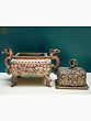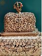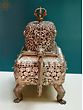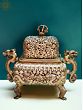 The lid of the copper incense burner is adorned with flowing vegetation, lotuses, and other auspicious motifs. On the top of the lid is the potent Buddhist symbol of the Vajra or thunderbolt. The artistically alluring net of vines on the lid gives the ingredients burnt inside the vessel opening to release fragrant fumes.