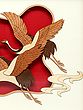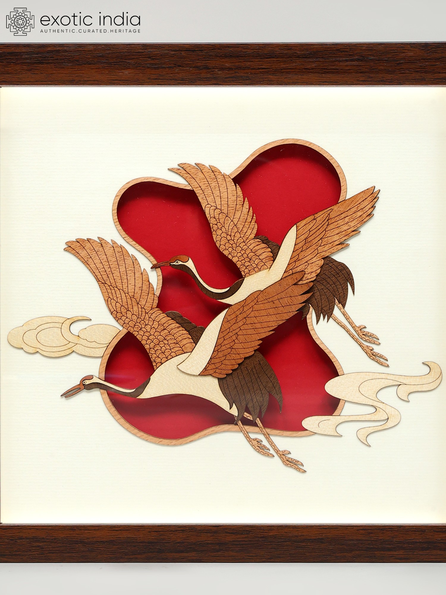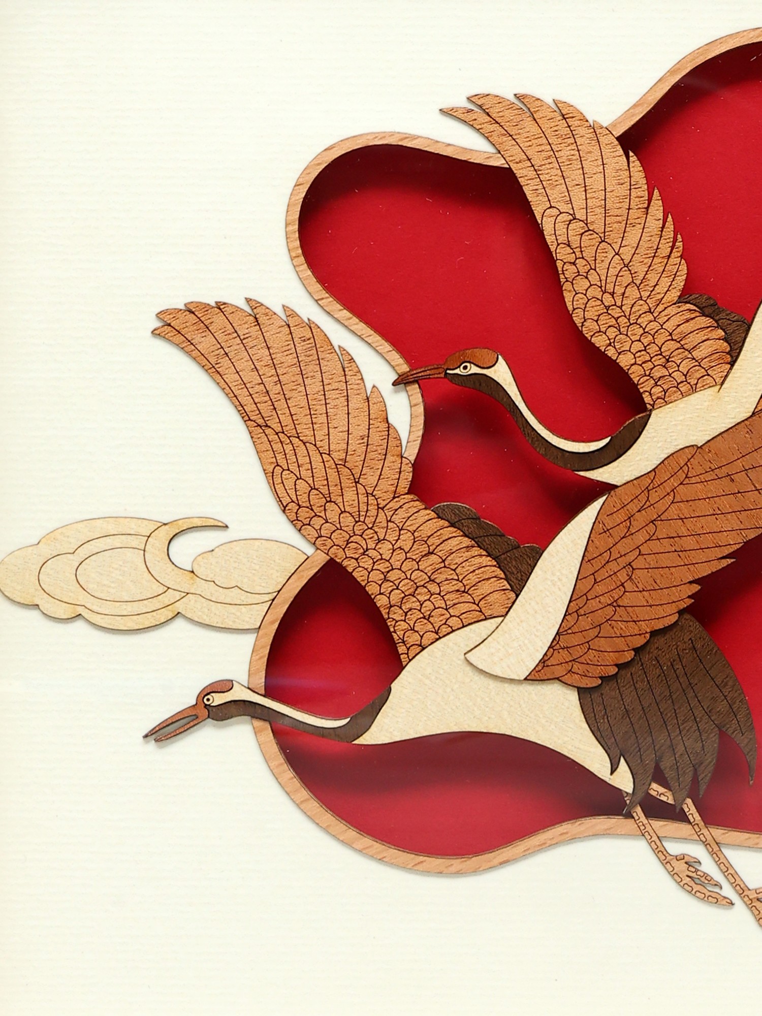 Elevate your home décor with this captivating piece of wall art. This stunning creation brings the elegance and grace of cranes in flight to your living space through the intricate art of wood carving. Every detail, from the delicate feather patterns to the sweeping curves of the birds’ wings, has been meticulously crafted, creating a mesmerizing three-dimensional effect that adds depth and character to any room. The artwork presents a composition of three cranes soaring amidst stylized clouds and against a vibrant red backdrop, adding a touch of visual intrigue.