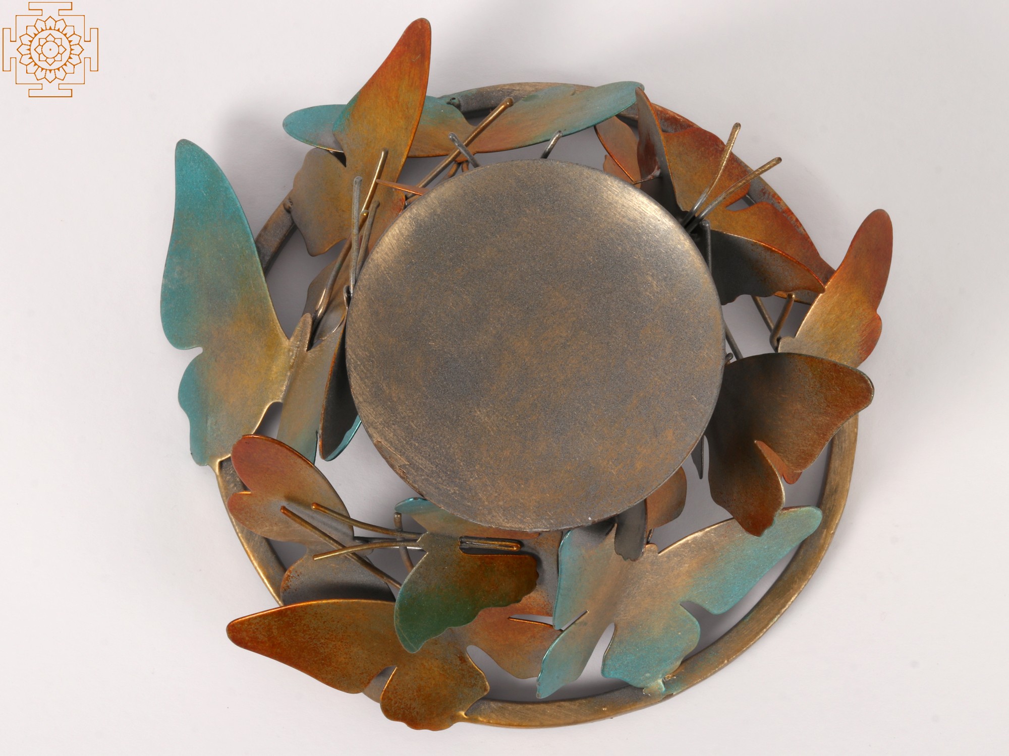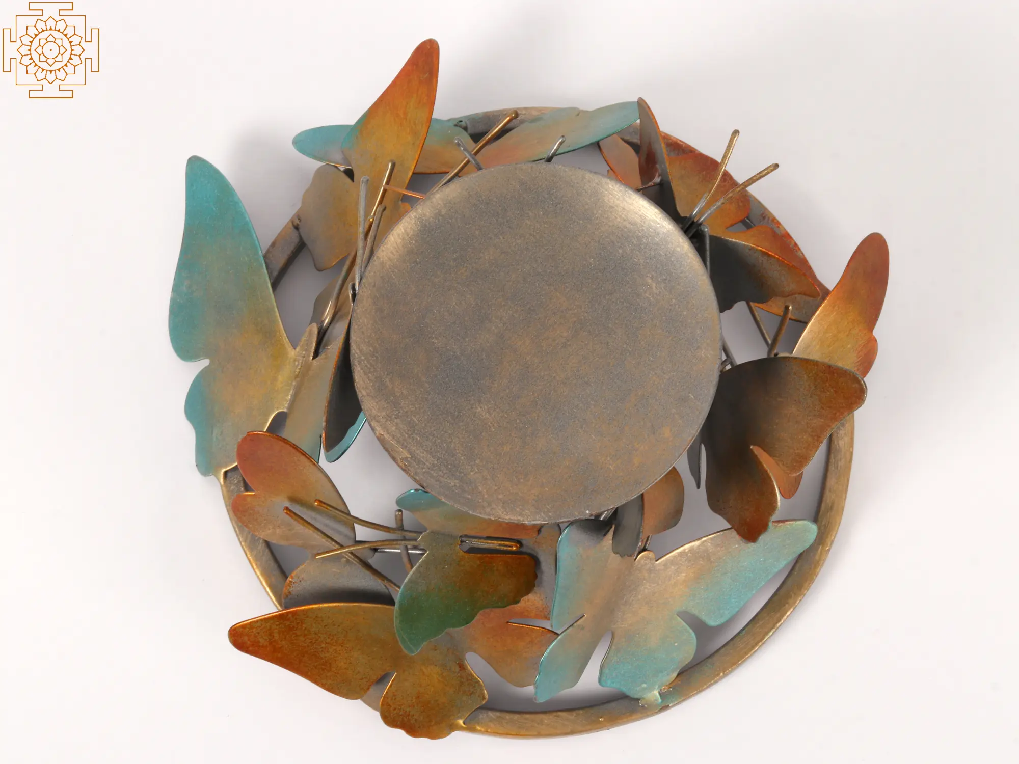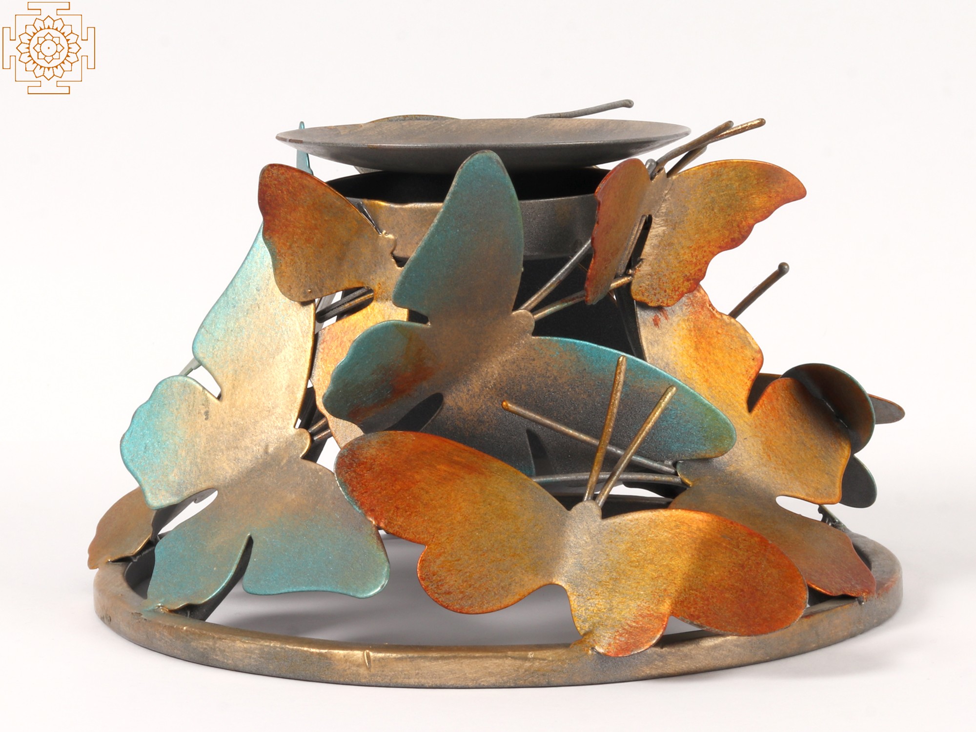 Forged from durable iron, this candle stand boasts a robust construction that promises longevity. The metal has been artfully finished with a multi-tonal patina, blending warm, earthy oranges and golds with cool, oceanic blues and greens. This gradient of color, reminiscent of a sunset or a forest canopy, adds depth and visual interest, making each butterfly unique and the entire piece a miniature work of art. The metal itself has a slightly textured finish, enhancing the realistic feel of the butterfly wings.