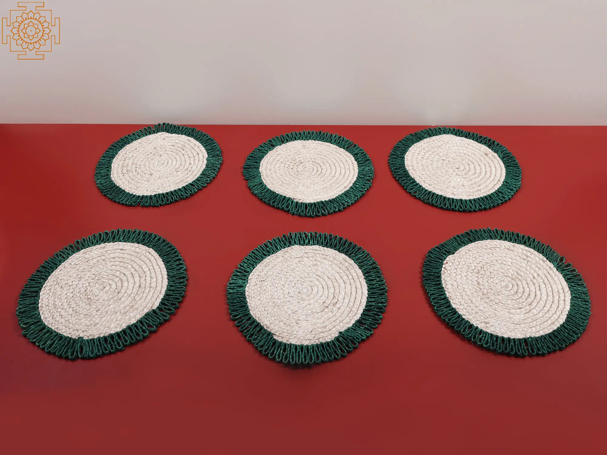 This Fibre Table Mat is made out of Jute Fabric. Jute fabric has a few distinguishing features that set it apart from other fabrics. First, it is a sustainable and environmentally beneficial material. Jute is a renewable resource that can be farmed without using fertilizers or pesticides, making it a more environmentally friendly alternative to synthetic materials. This Table Mat Set is beautifully made with a contrasting combination of the cream-colored center and dark green colored petal formations around the center.