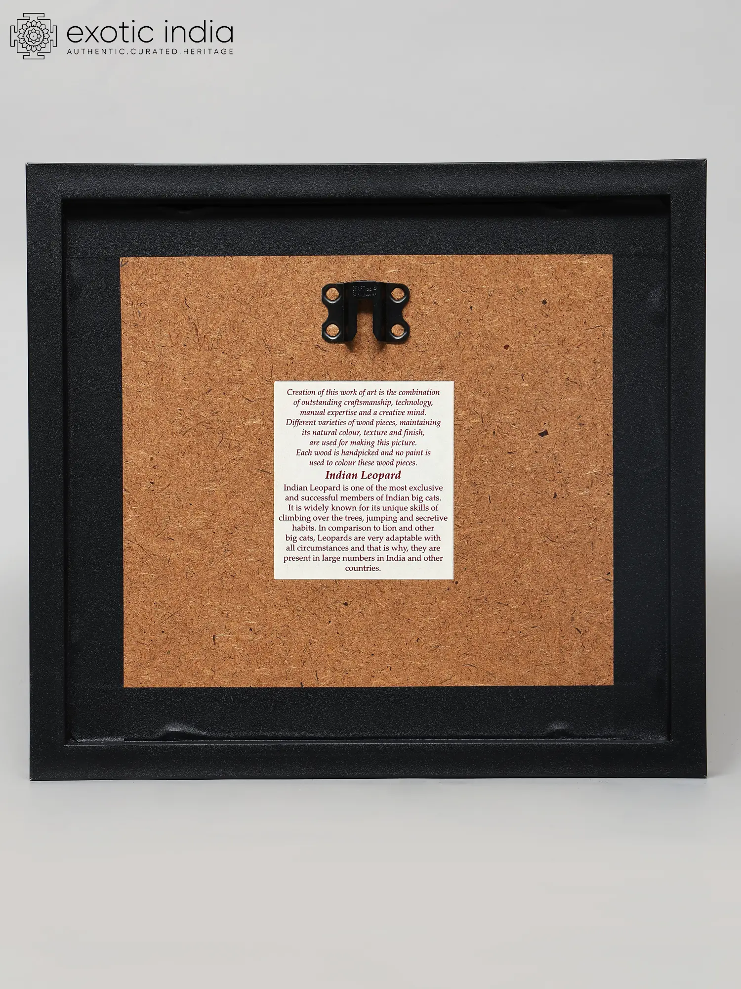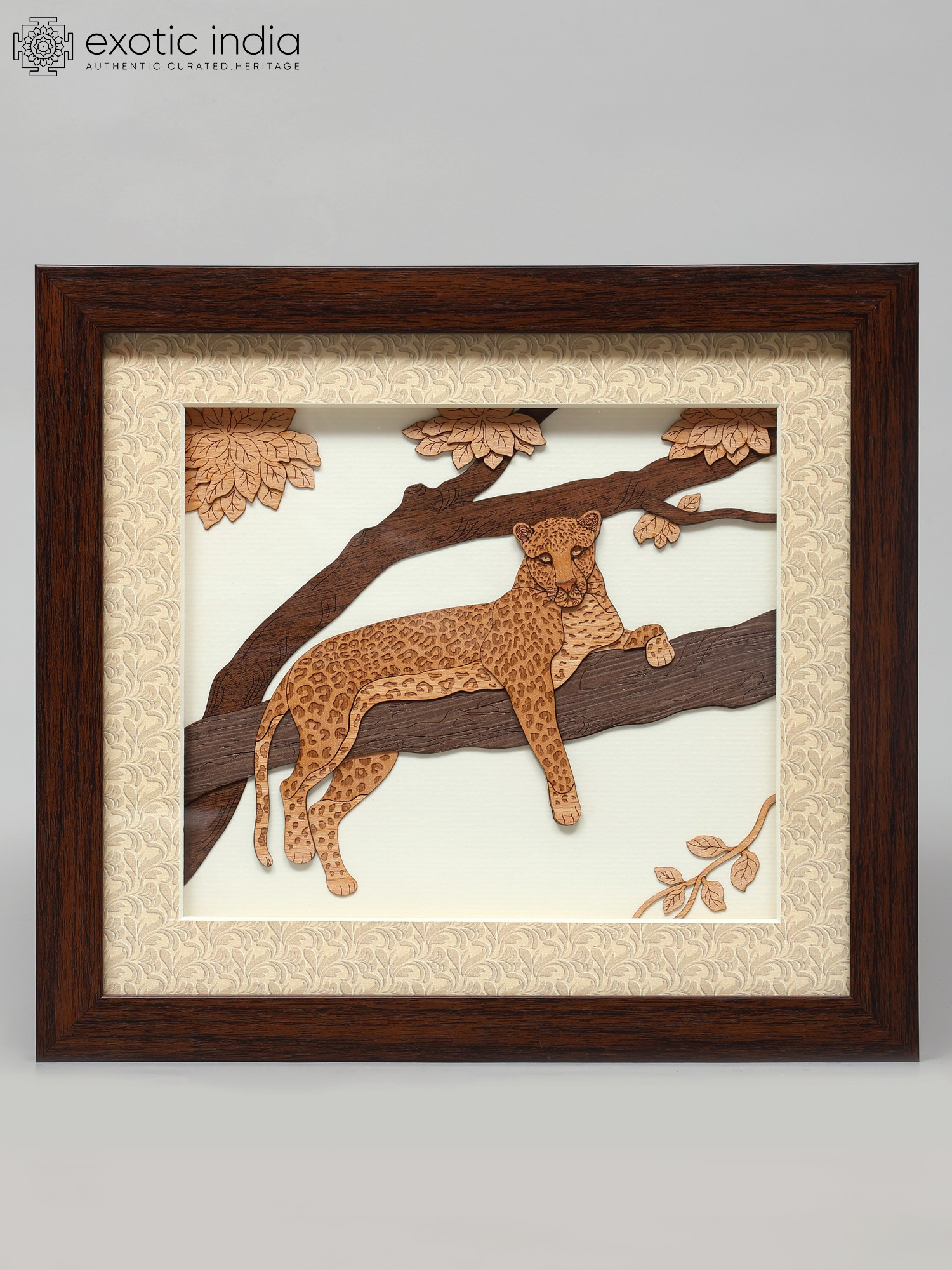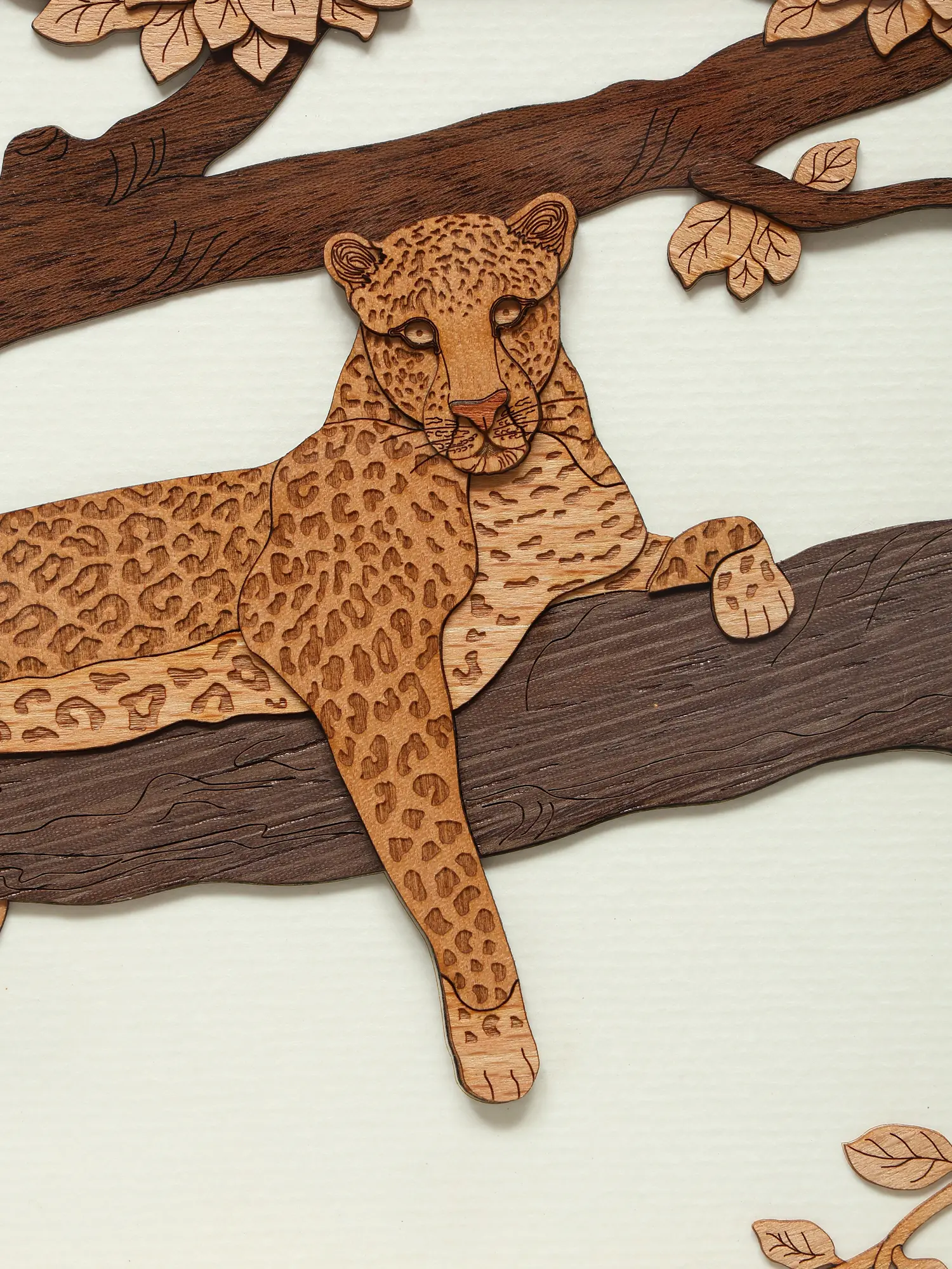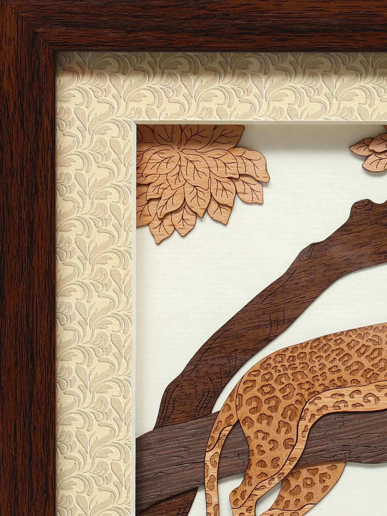 Each layer of this artwork is carefully carved and assembled, showcasing the artisan's skill and dedication to detail. The subtle variations in wood grain and the precise carving of each element contribute to the unique character of this piece, ensuring that no two are exactly alike. The leopard's form is expertly rendered, capturing its relaxed posture and powerful physique. The surrounding tree branch and foliage add a natural backdrop, enhancing the overall sense of realism and creating a compelling narrative within the frame. The overall effect is a piece of art that celebrates both the beauty of nature and the artistry of skilled craftsmanship.