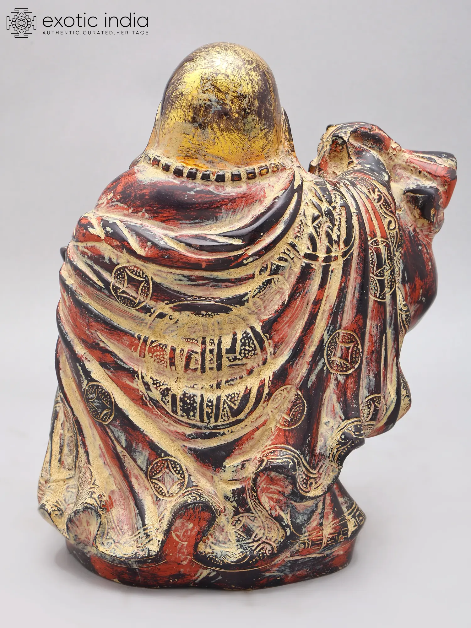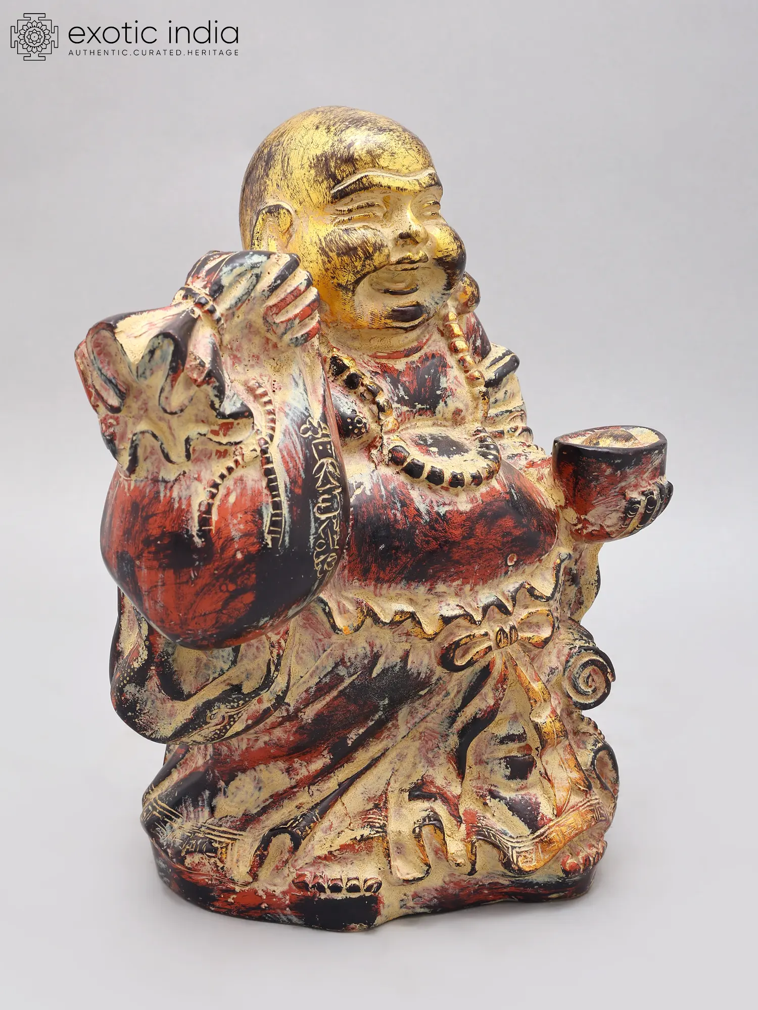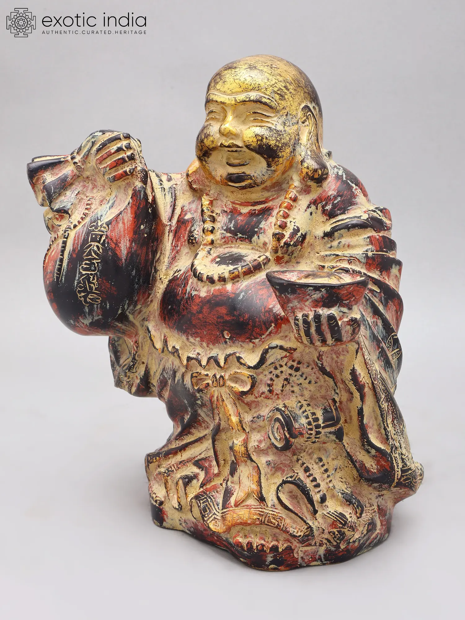 Standing at an impressive 10.7 inches tall, this sculpture is designed to command attention. The ample wealth bag, held with a benevolent grip, signifies immense prosperity, while the small gold bowl, nestled in its other hand, represents the receiving of riches. The intricate carvings adorning its robes and the detailed facial expression of mirth further enhance its visual appeal, making it a truly captivating treasure.