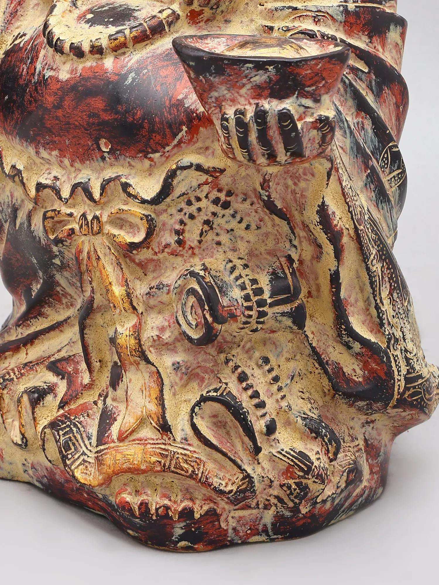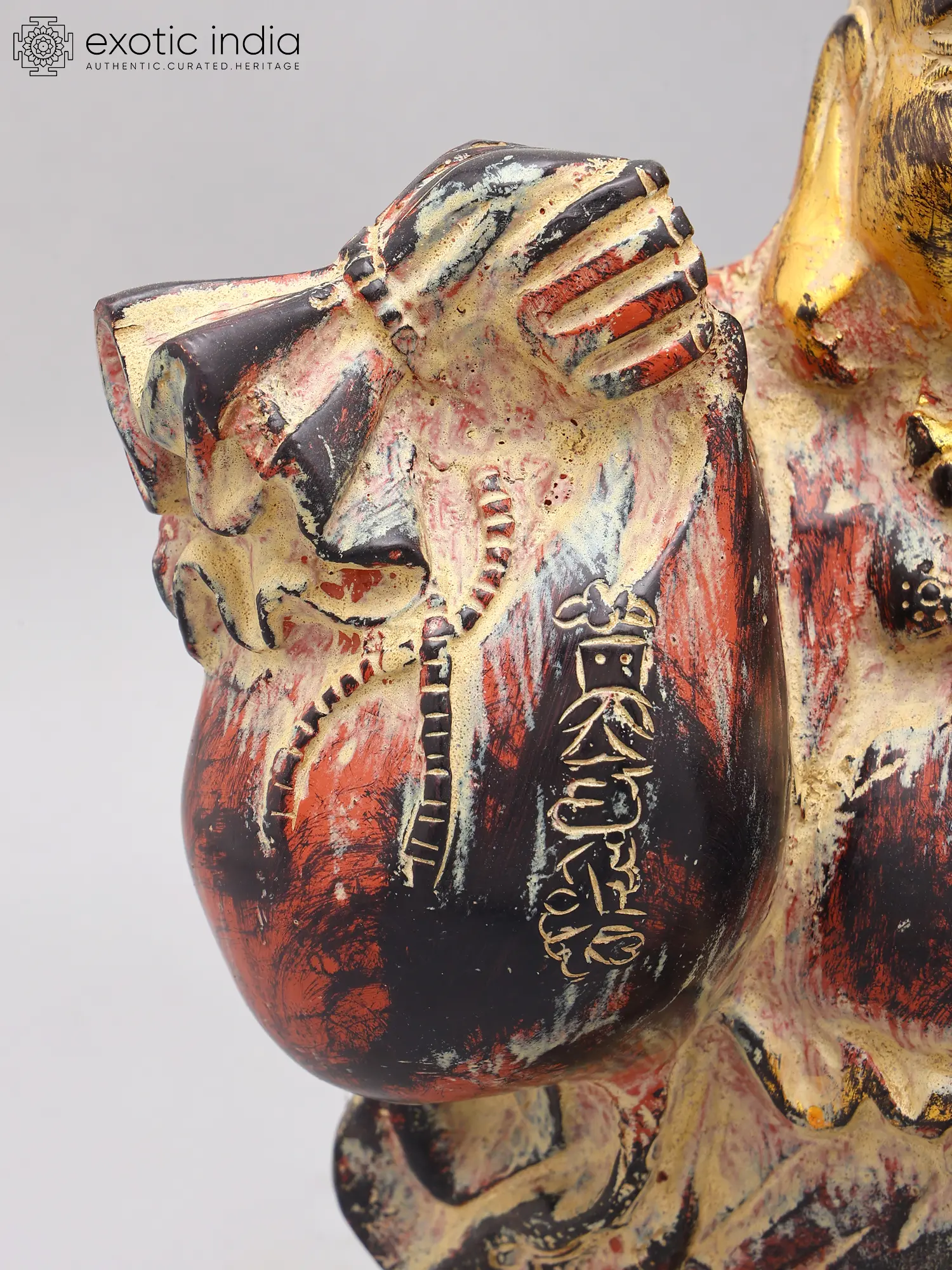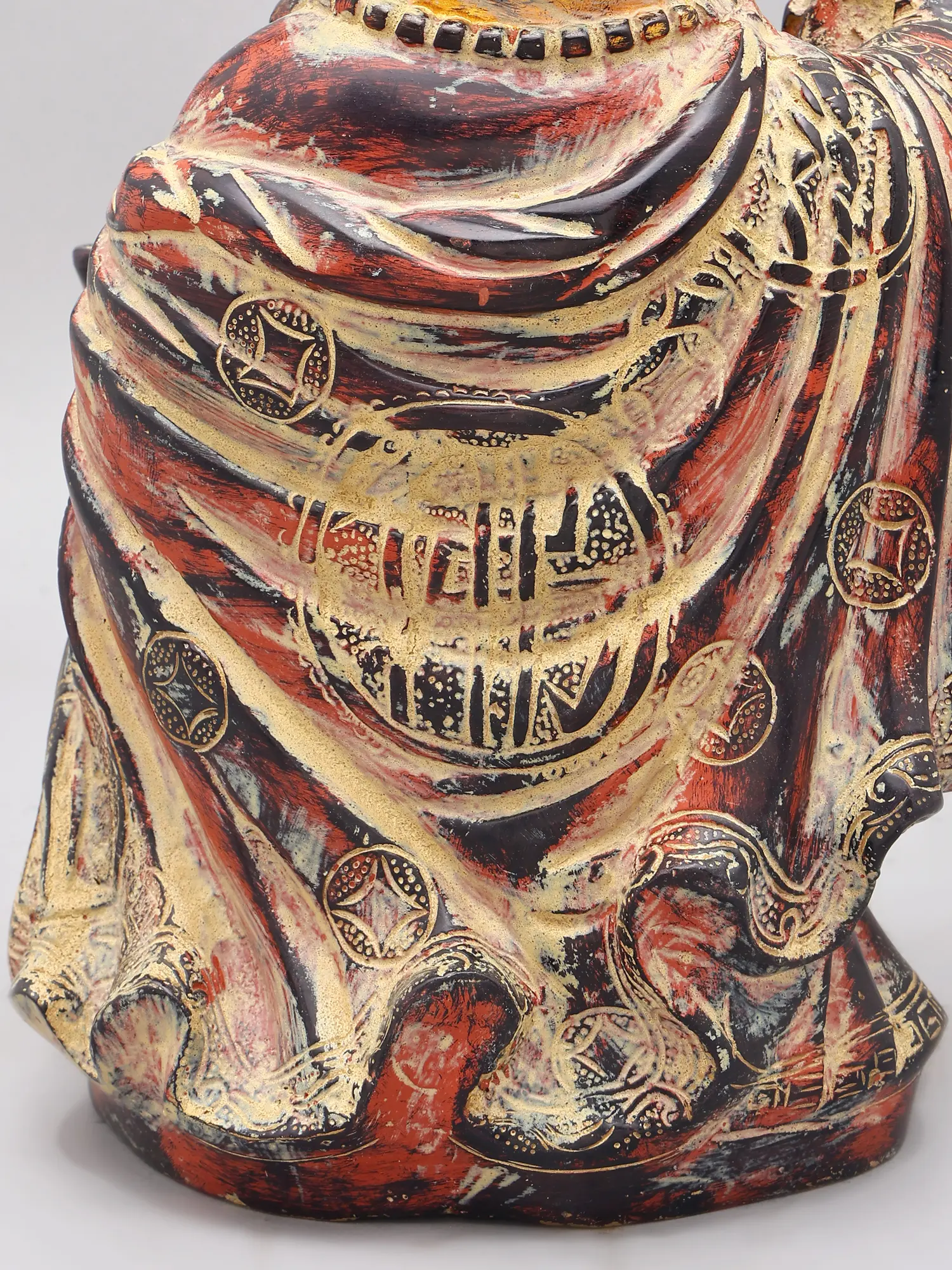 Standing at an impressive 10.7 inches tall, this sculpture is designed to command attention. The ample wealth bag, held with a benevolent grip, signifies immense prosperity, while the small gold bowl, nestled in its other hand, represents the receiving of riches. The intricate carvings adorning its robes and the detailed facial expression of mirth further enhance its visual appeal, making it a truly captivating treasure.
