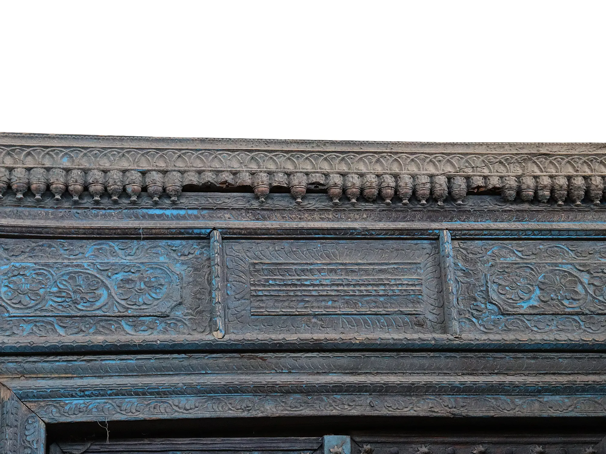 Chiseled into the stunning detailed work, this large door from Rajasthan is a vintage best-loved item. With its beautiful floral and vine work elegantly adorning its appeal, the double door making for the center has its pattern designed after the sacred and auspicious Hindu icon of Swastika, painted in the colors of fresh skies that reminds one of dancing peacock - this door is a must get for your space.