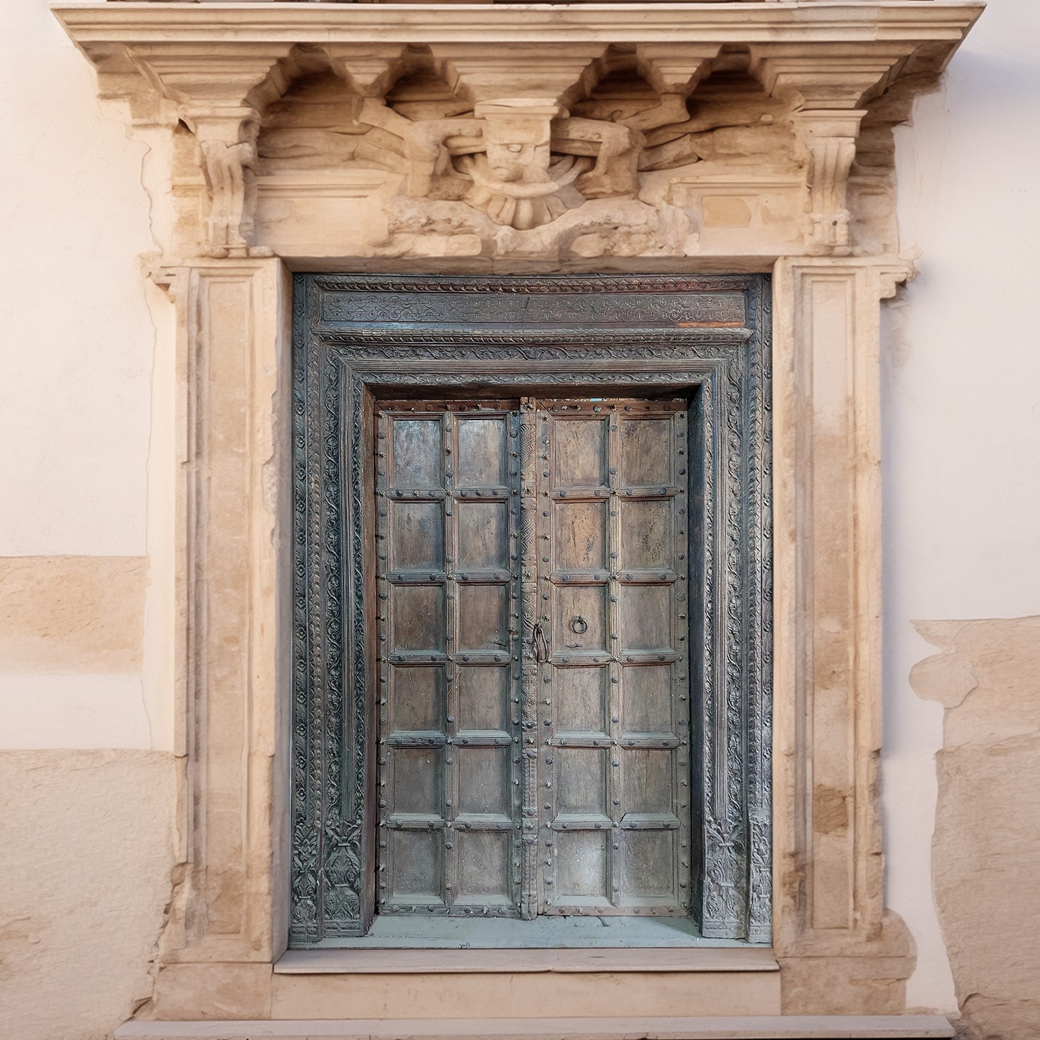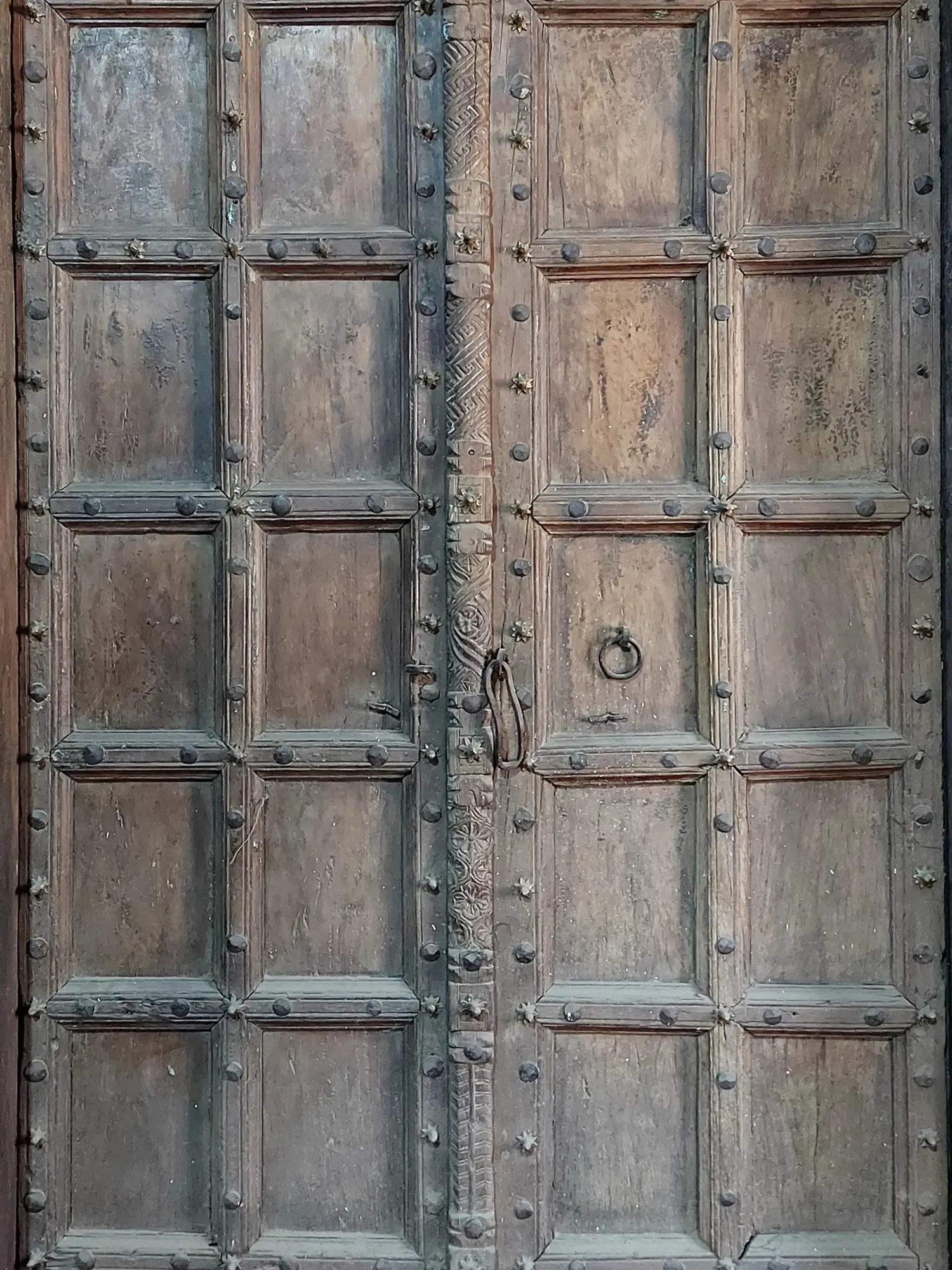 The door is embellished with intricate carvings along the frame, a testament to the artistry of the past. Each groove and curve tells a story, reflecting the cultural heritage from which it originates. Notice the meticulous detailing that adorns the borders, evidence of a skilled craftsman's dedication to creating a truly unique piece. The metal stud accents add a rugged, tactile element, providing a stunning contrast to the natural warmth of the wood. The studs are strategically placed to highlight the geometric design, contributing to the door's overall visual appeal.