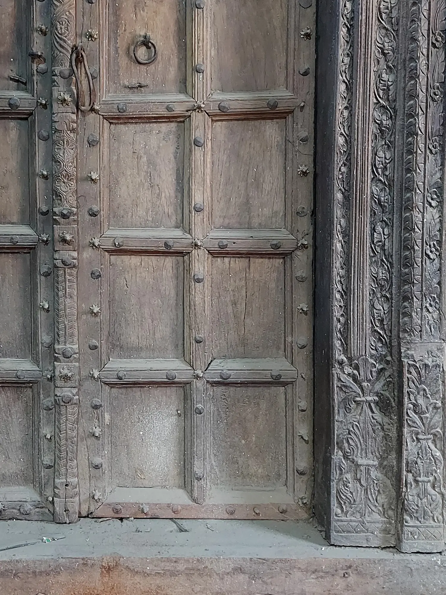 79'' Large Old Grey Door With Carved Elephants and Vases | Vintage Doors From Rajsthan