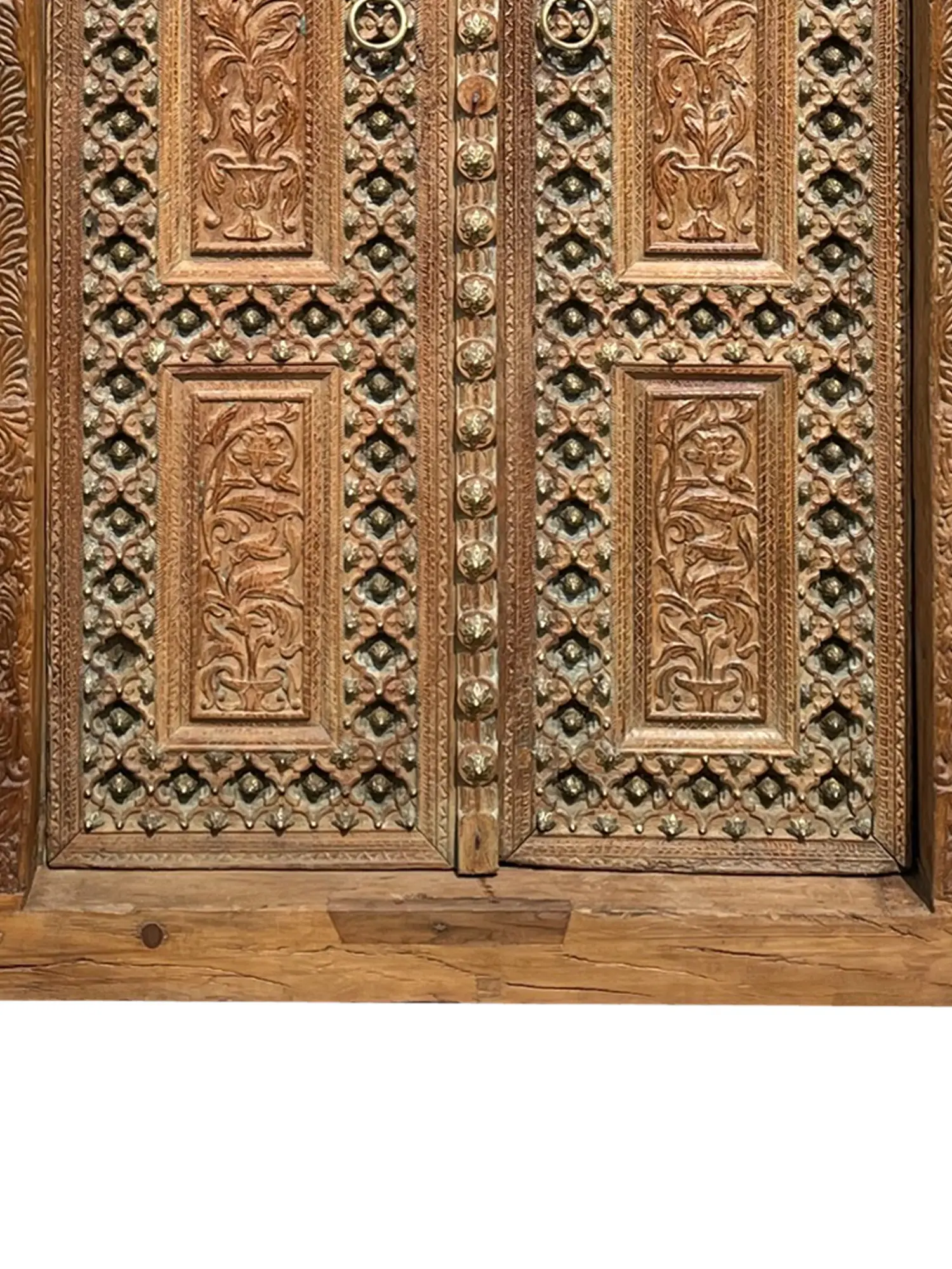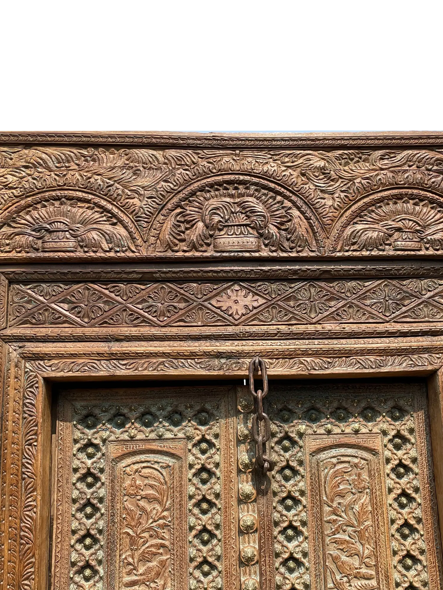 Brass door handles add a touch of sophistication, while a chitkani on the top completes the door's ornate design. This masterpiece harmoniously blends intricate detailing with refined aesthetics, transforming any entrance into a statement of grandeur and sophistication.